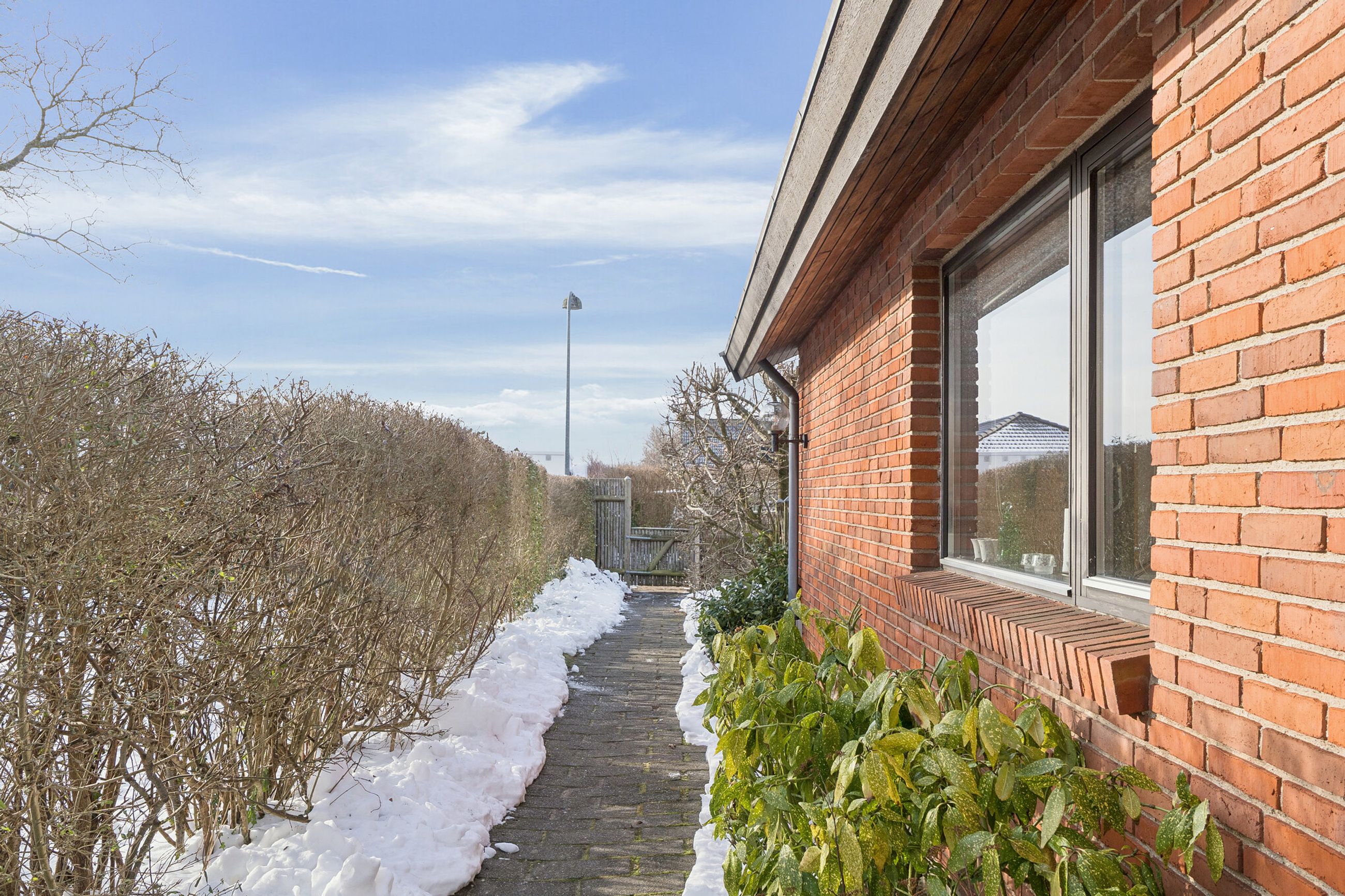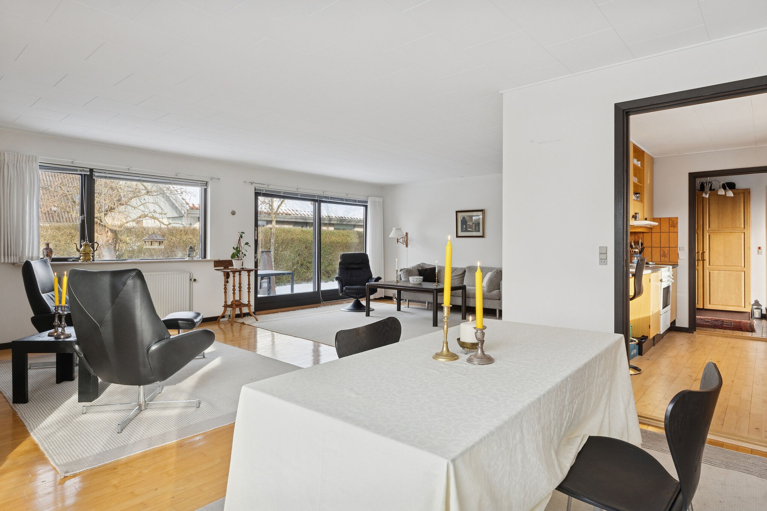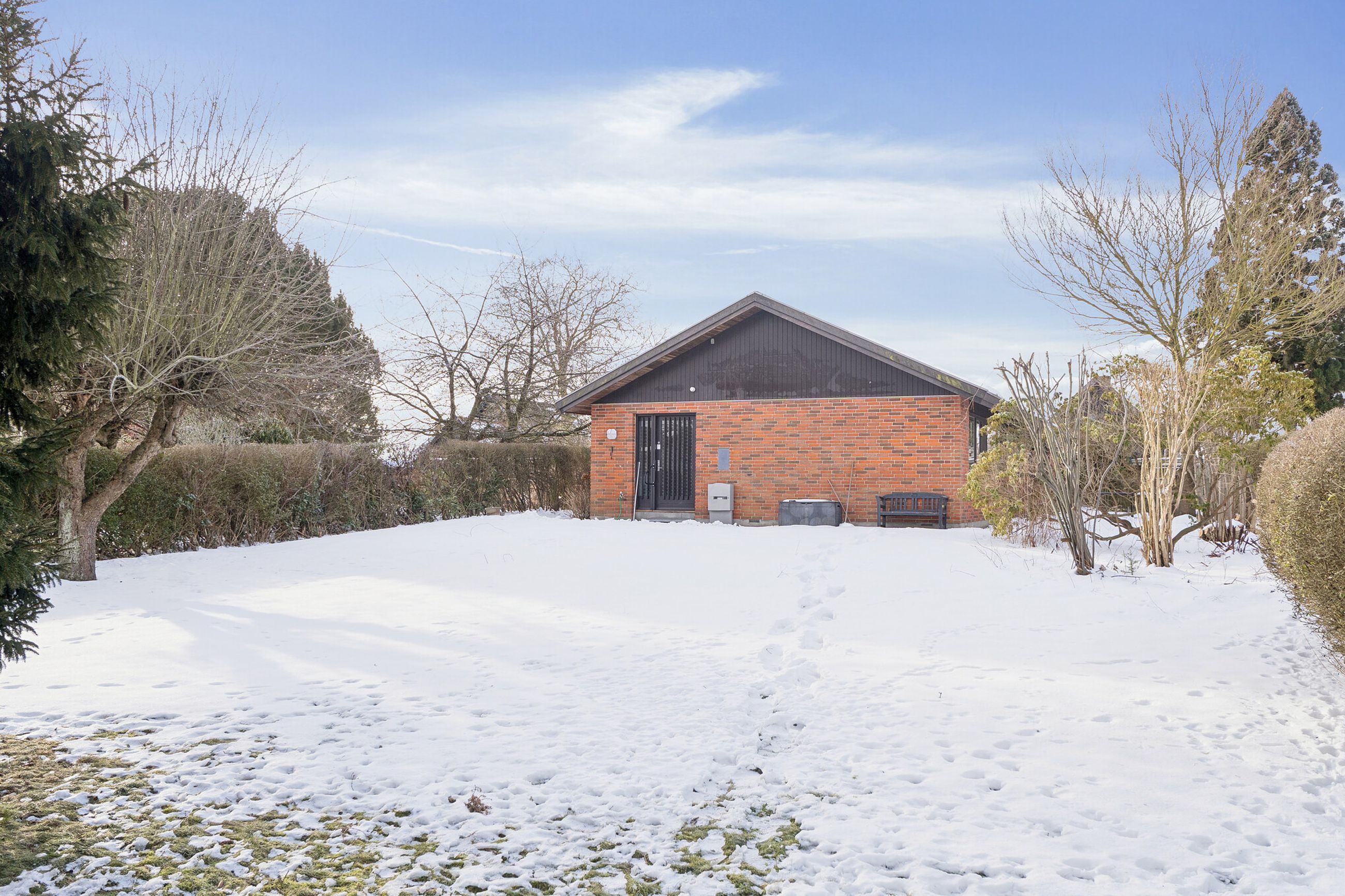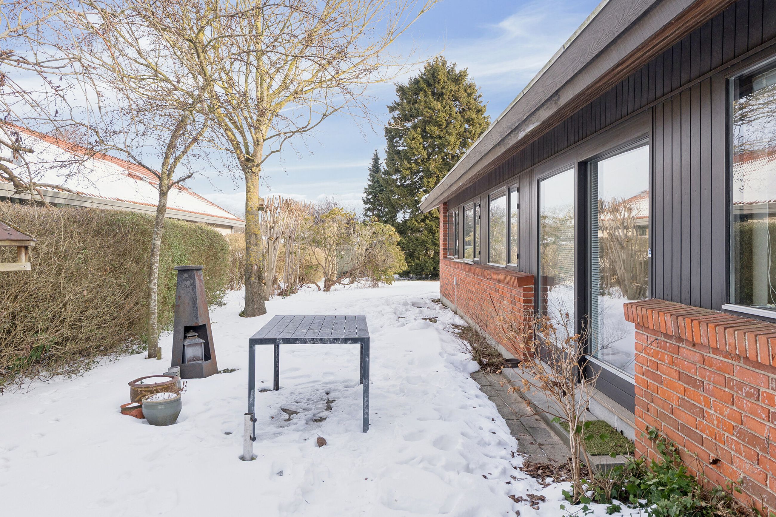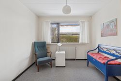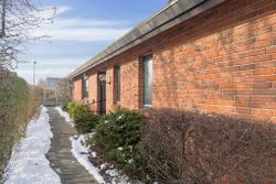 Ejendommen er på 137 kvm i 1 plan og indrettet som følger: Ankomst via havegang til indgangsparti med bred hall. Gæstebadeværelse med muret bruseniche. Mellemgang til to gode børneværelser og et stort soveværelse, alle med faste skabe. Badeværelse med badekar og muret bruseniche. Stort praktisk bryggers med egen indgang fra haven. Lys vinkelstue med udgang ti terrasse og haven og spiseplads i forbindelse med køkken. Huset har mange vinduer, hvilket giver masser af lys overalt. Haven er aflukket og privat og med en god variation i træer, planter og buske.