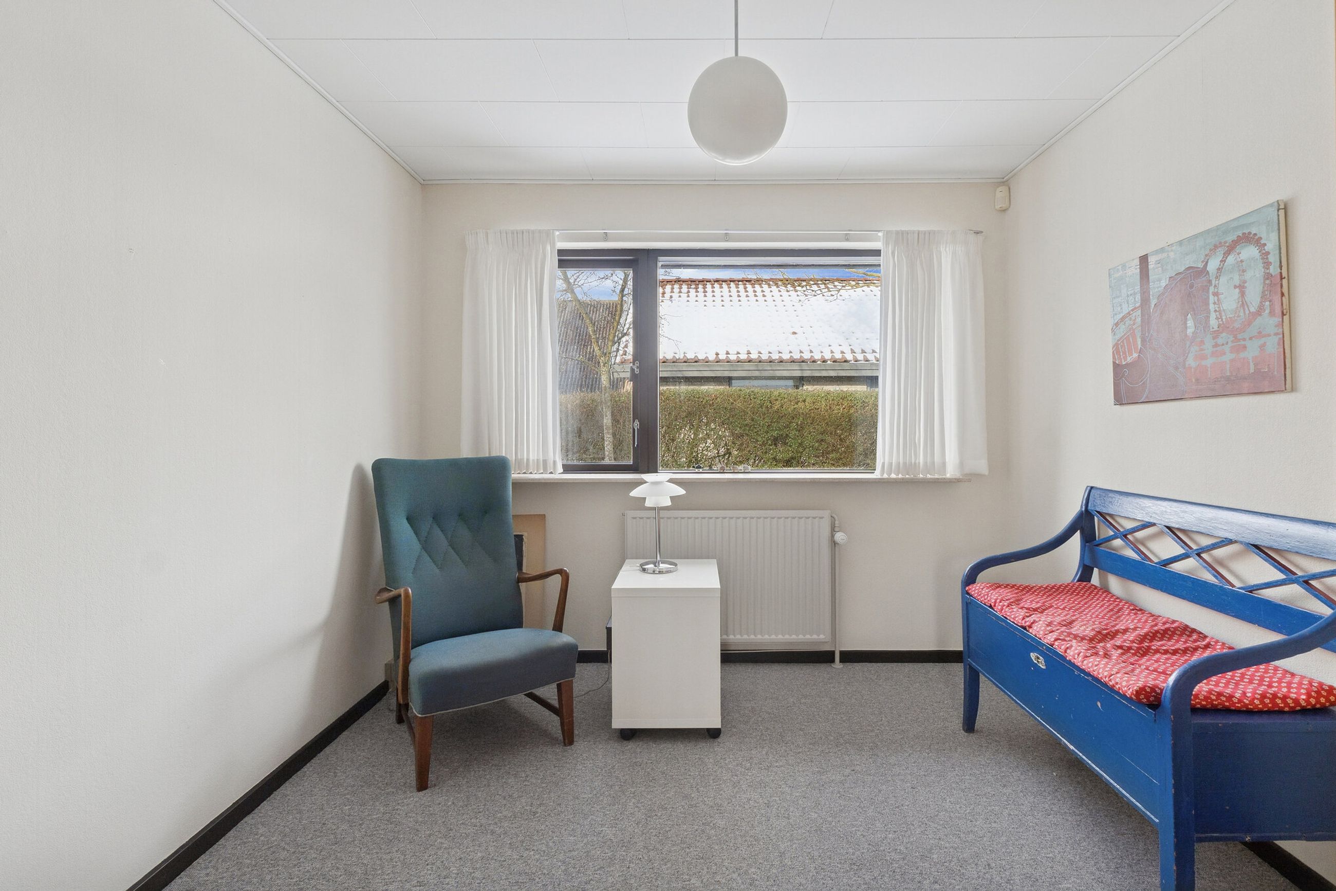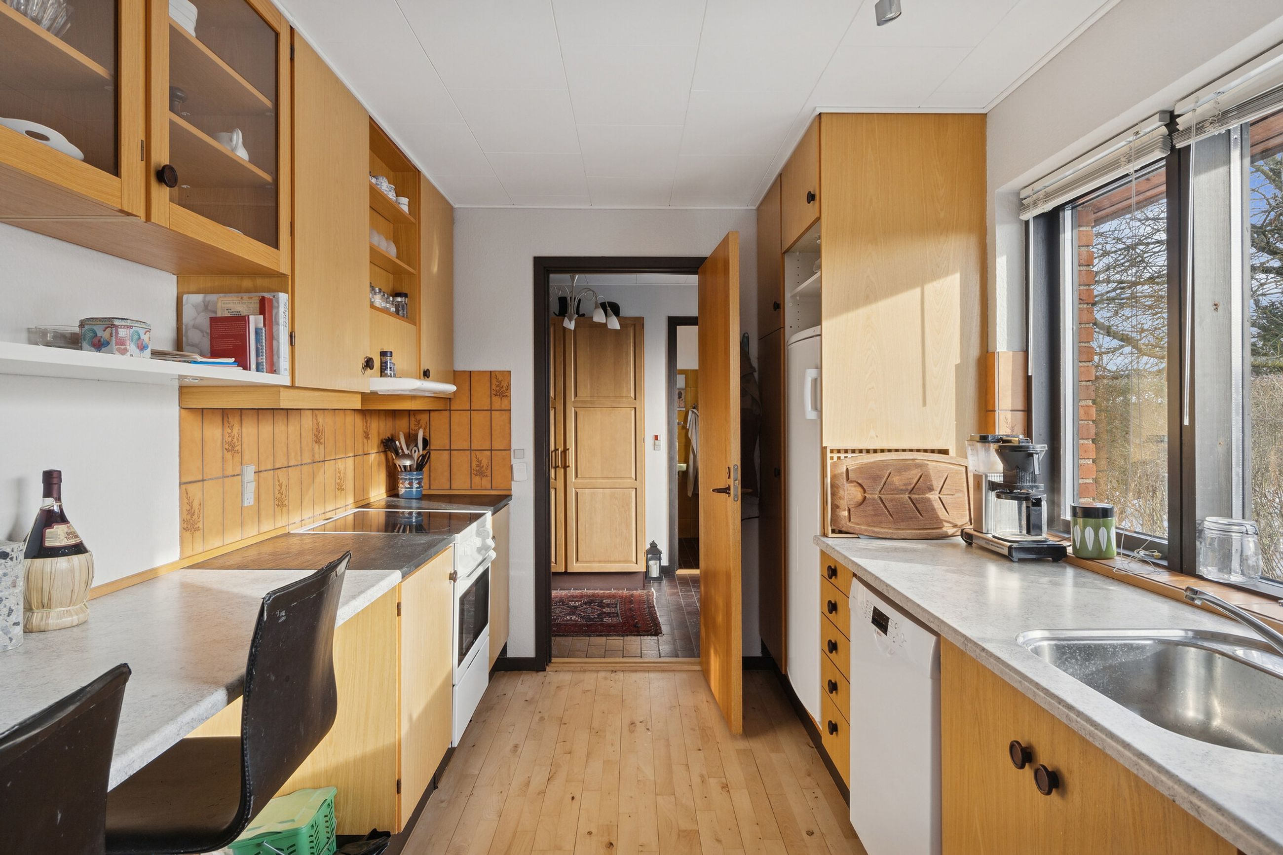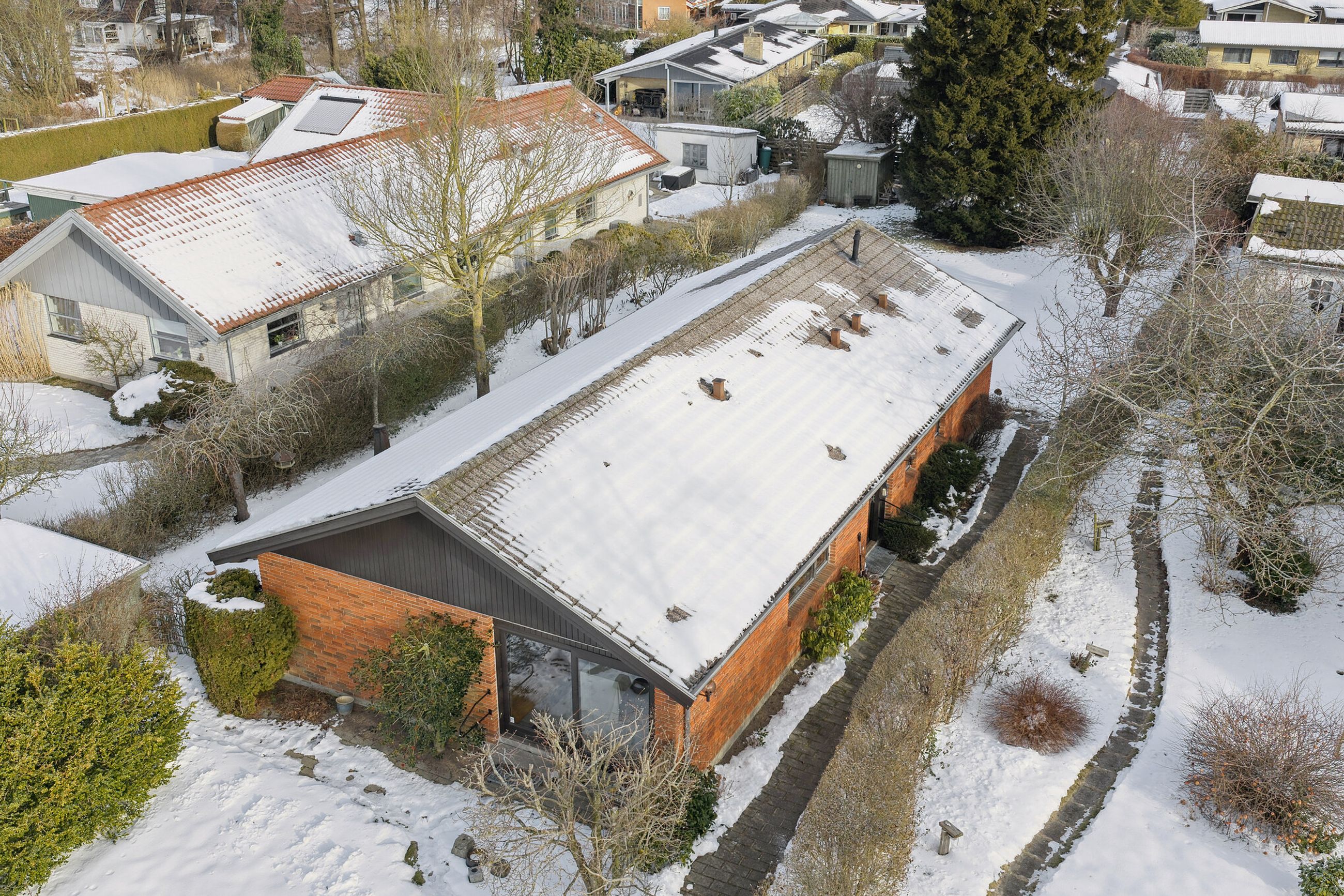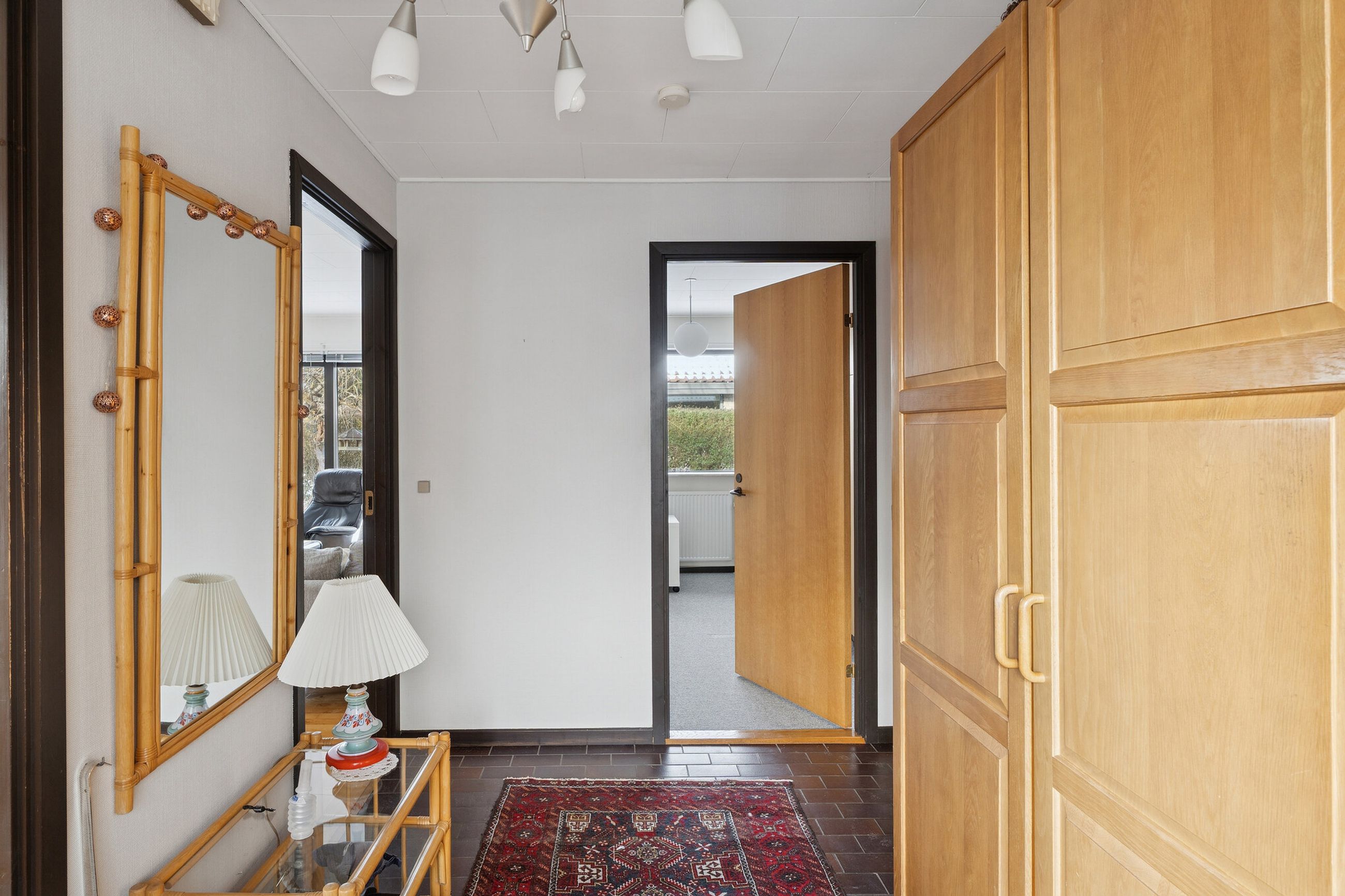 Ejendommen er på 137 kvm i 1 plan og indrettet som følger: Ankomst via havegang til indgangsparti med bred hall. Gæstebadeværelse med muret bruseniche. Mellemgang til to gode børneværelser og et stort soveværelse, alle med faste skabe. Badeværelse med badekar og muret bruseniche. Stort praktisk bryggers med egen indgang fra haven. Lys vinkelstue med udgang ti terrasse og haven og spiseplads i forbindelse med køkken. Huset har mange vinduer, hvilket giver masser af lys overalt. Haven er aflukket og privat og med en god variation i træer, planter og buske.