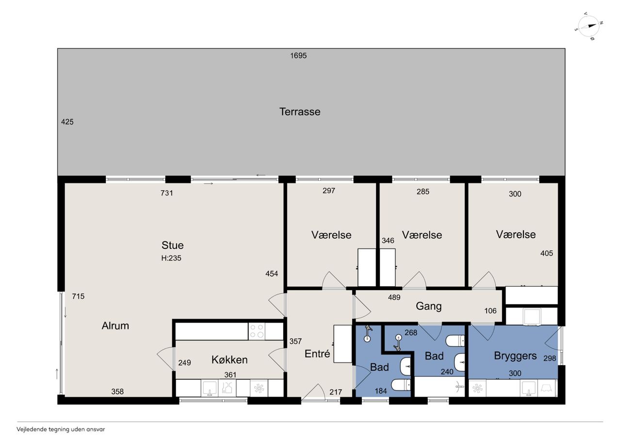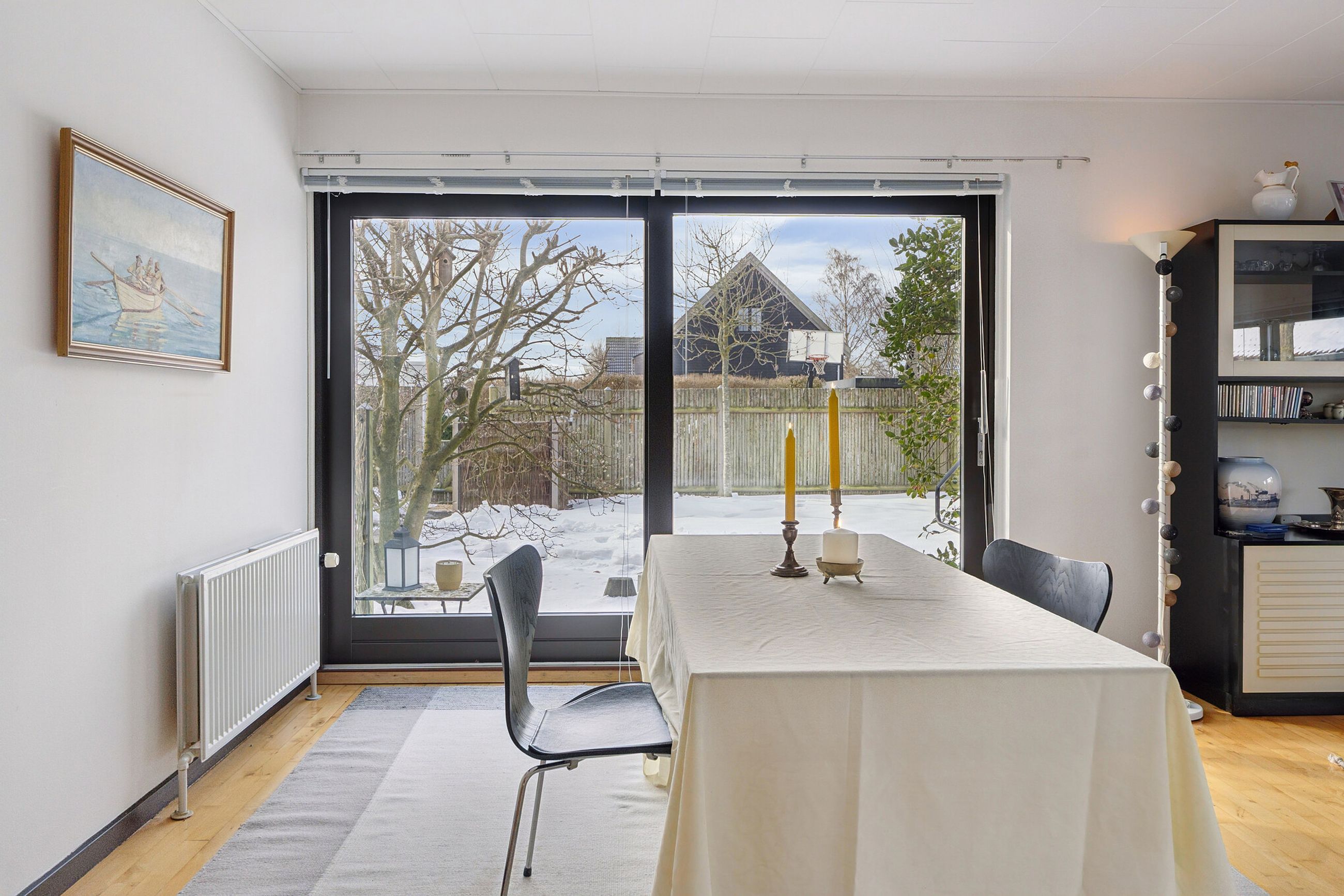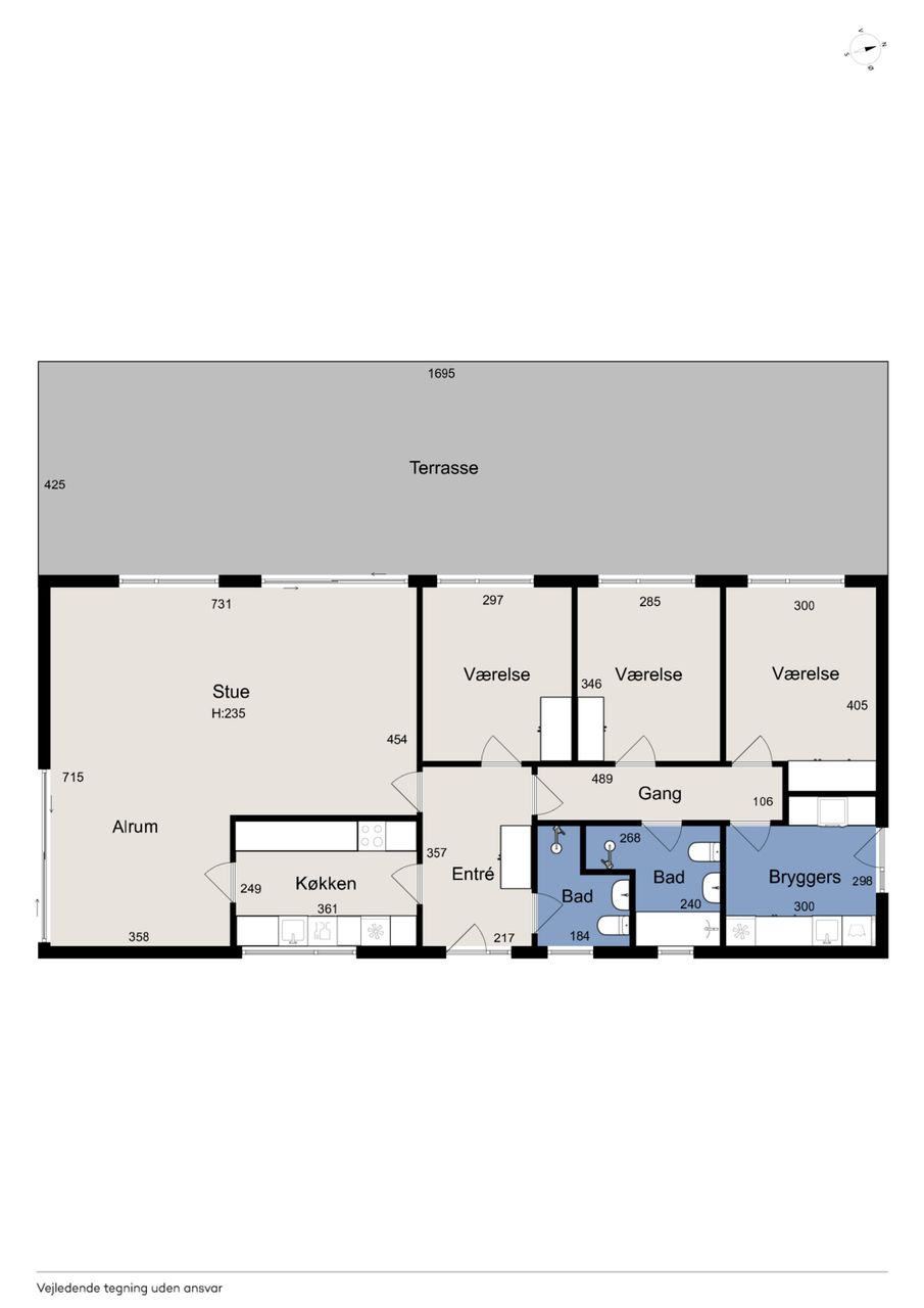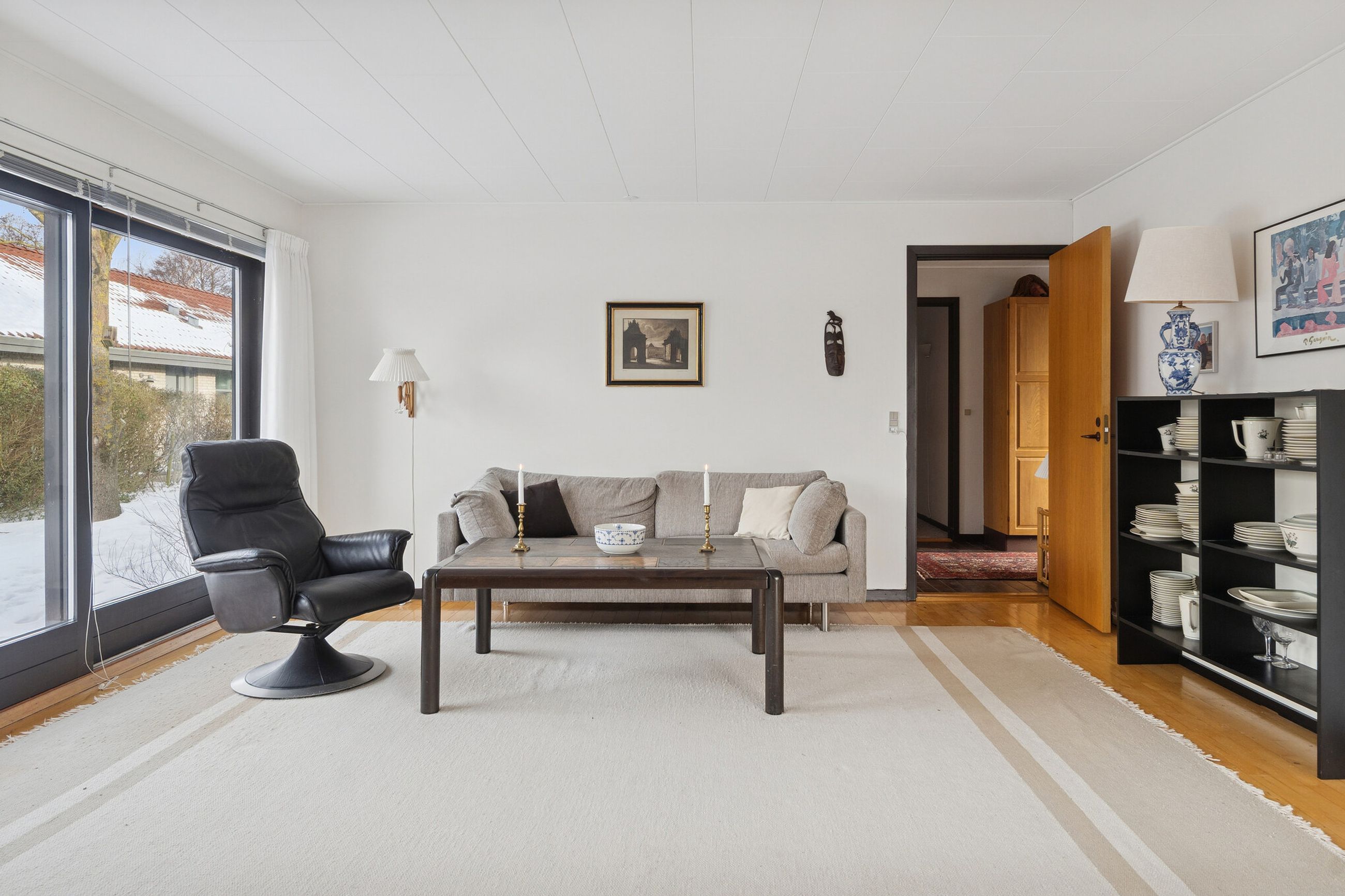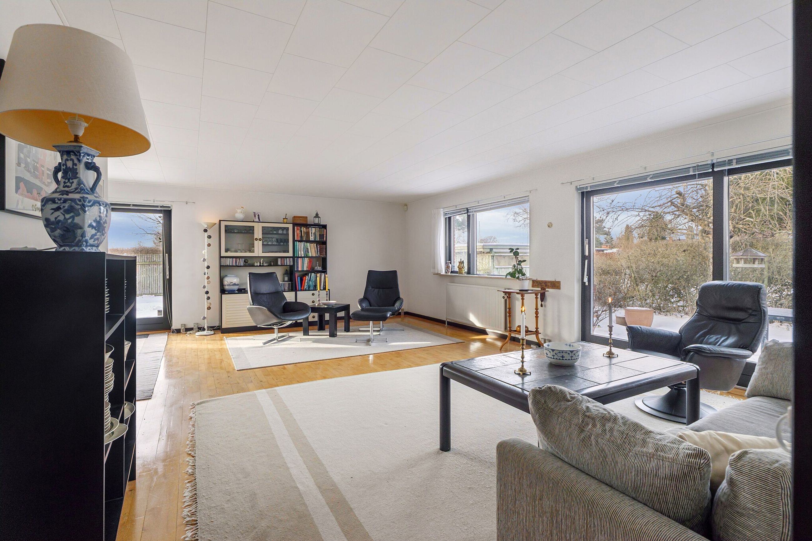 Ejendommen er på 137 kvm i 1 plan og indrettet som følger: Ankomst via havegang til indgangsparti med bred hall. Gæstebadeværelse med muret bruseniche. Mellemgang til to gode børneværelser og et stort soveværelse, alle med faste skabe. Badeværelse med badekar og muret bruseniche. Stort praktisk bryggers med egen indgang fra haven. Lys vinkelstue med udgang ti terrasse og haven og spiseplads i forbindelse med køkken. Huset har mange vinduer, hvilket giver masser af lys overalt. Haven er aflukket og privat og med en god variation i træer, planter og buske.