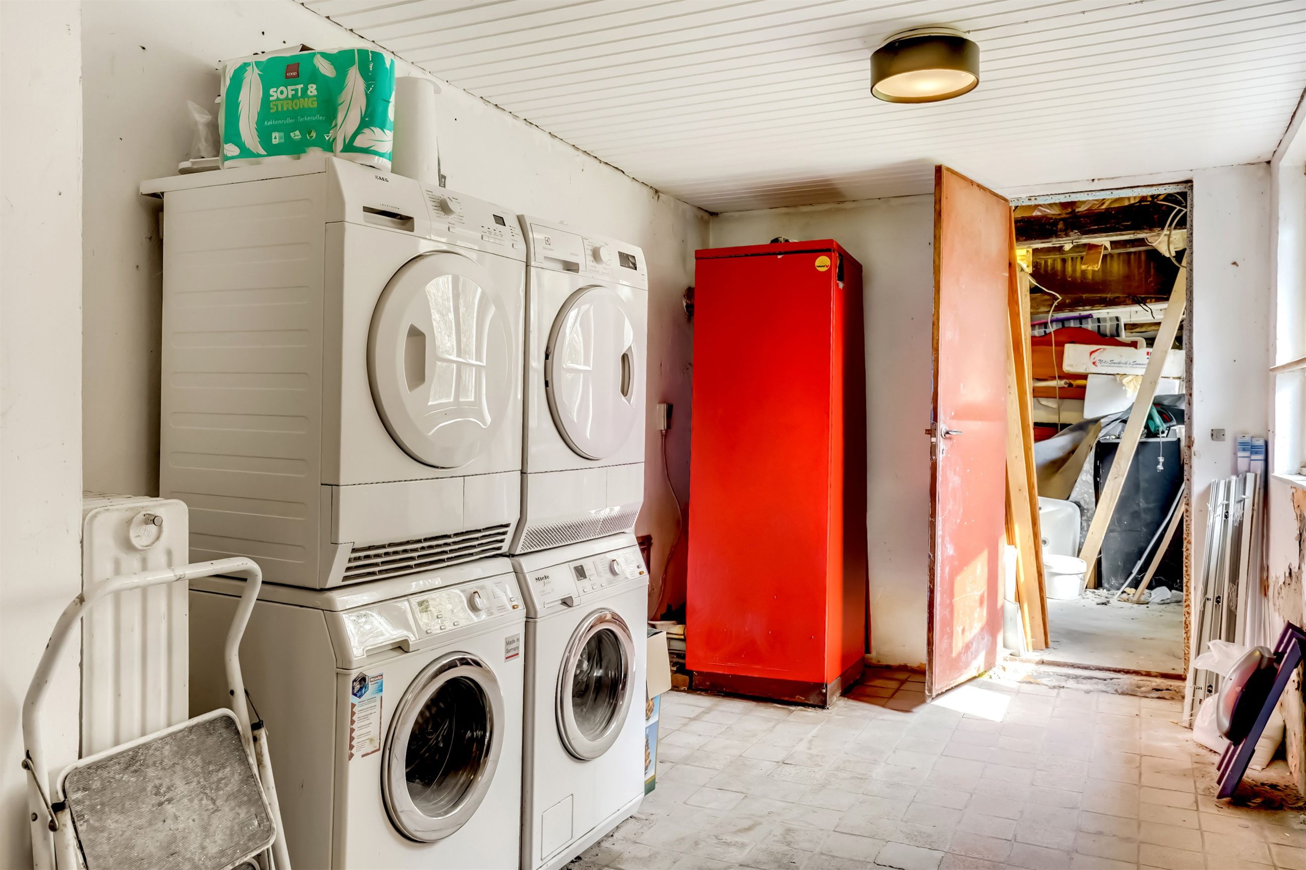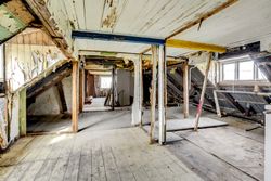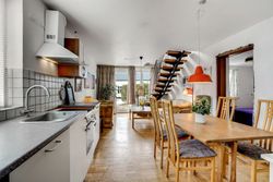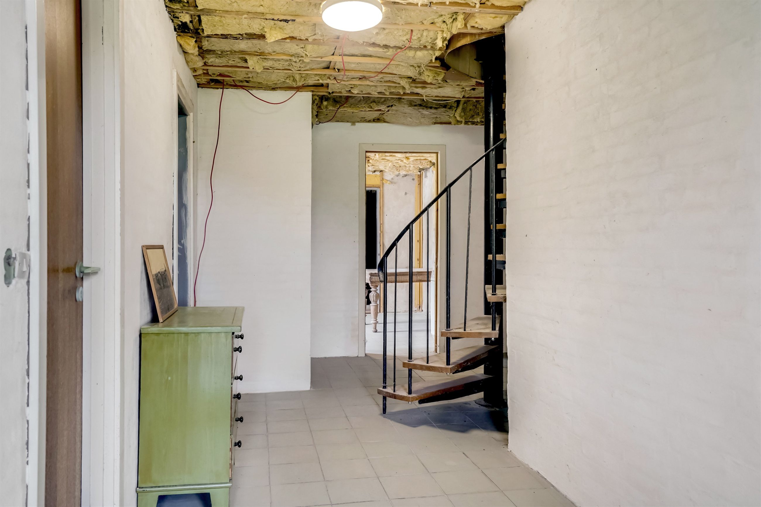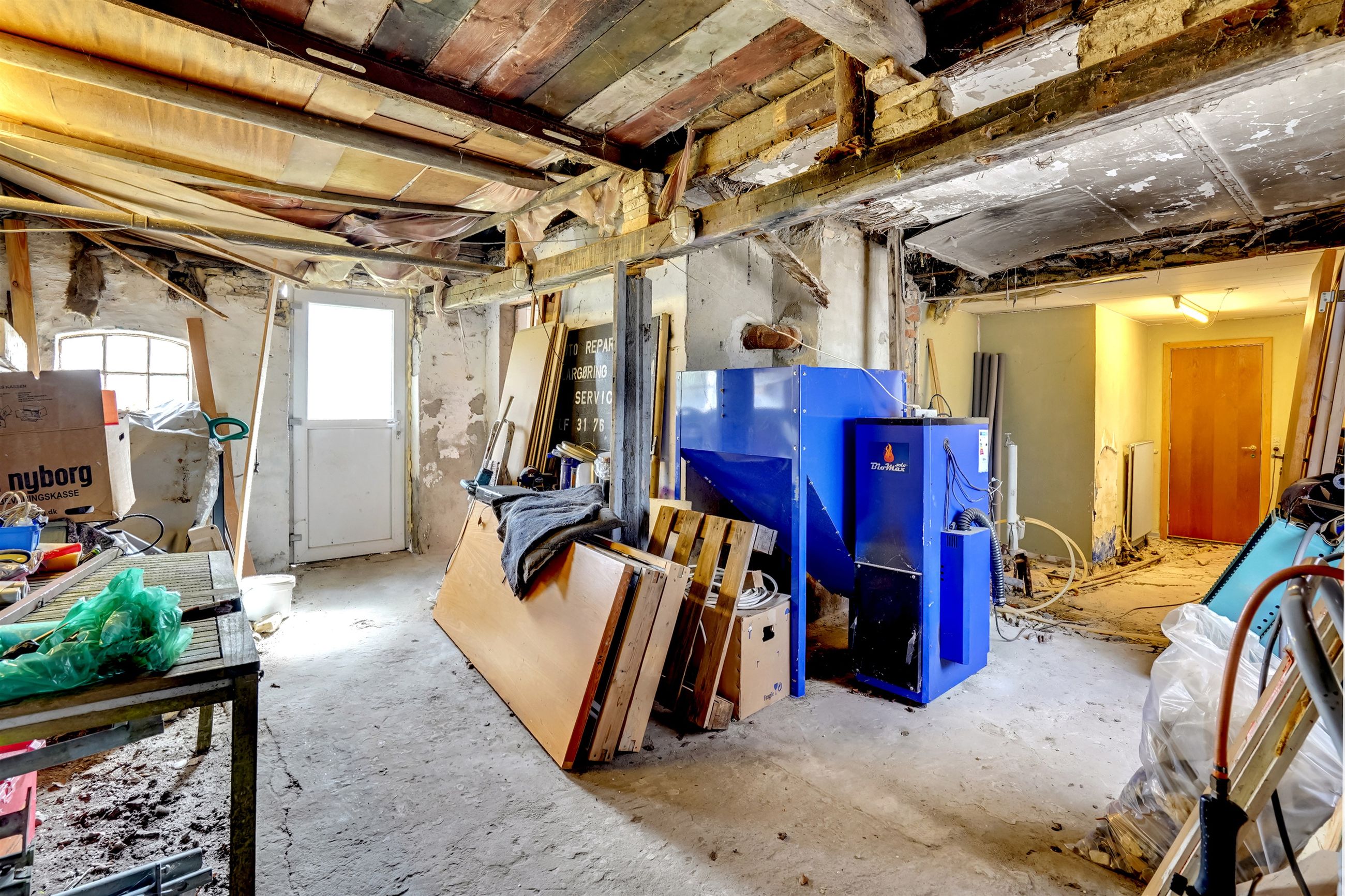 Bolig 1 udgør 188 kvm og rummer også det store værksted/hobbyrum. Boligen har tidligere været opdelt i to enheder, og byder derfor på fleksible indretningsmuligheder. I stueplan er det gamle køkken fjernet, og førstesalen står klar til nyindretning med toilet og store disponible loftarealer – ideelt for dig, der vil skabe noget unikt.