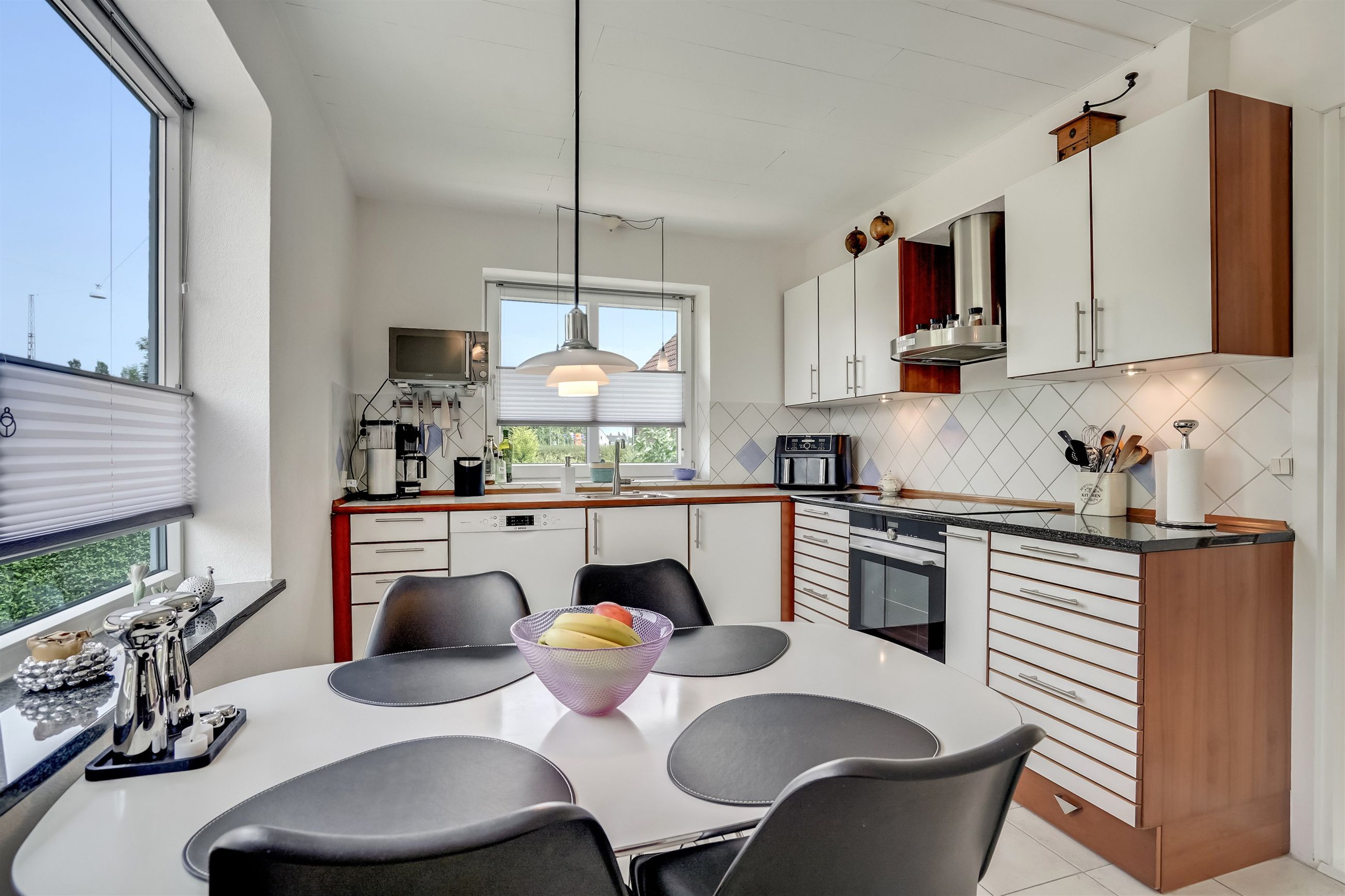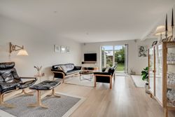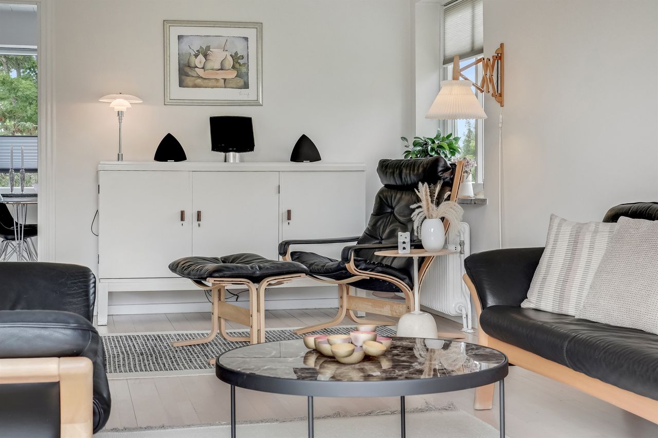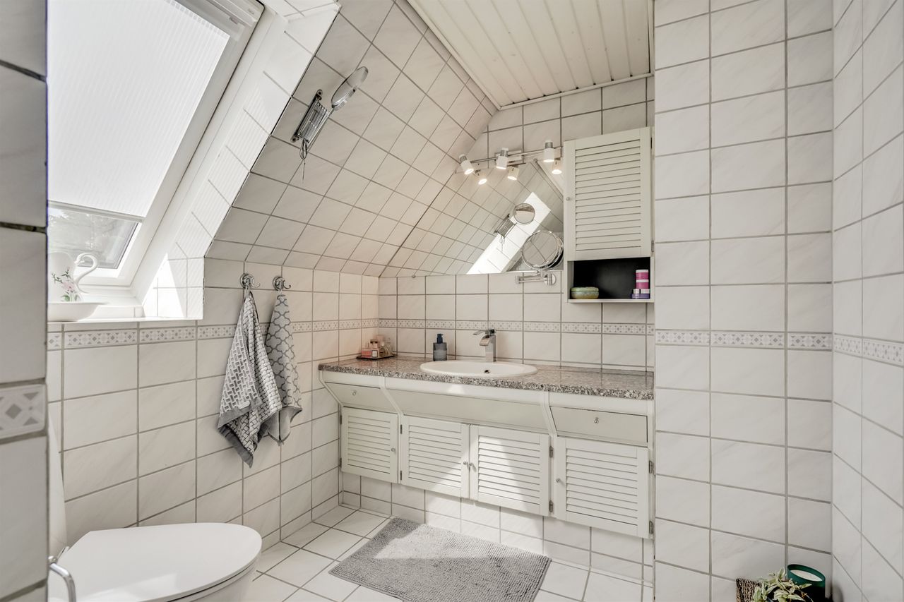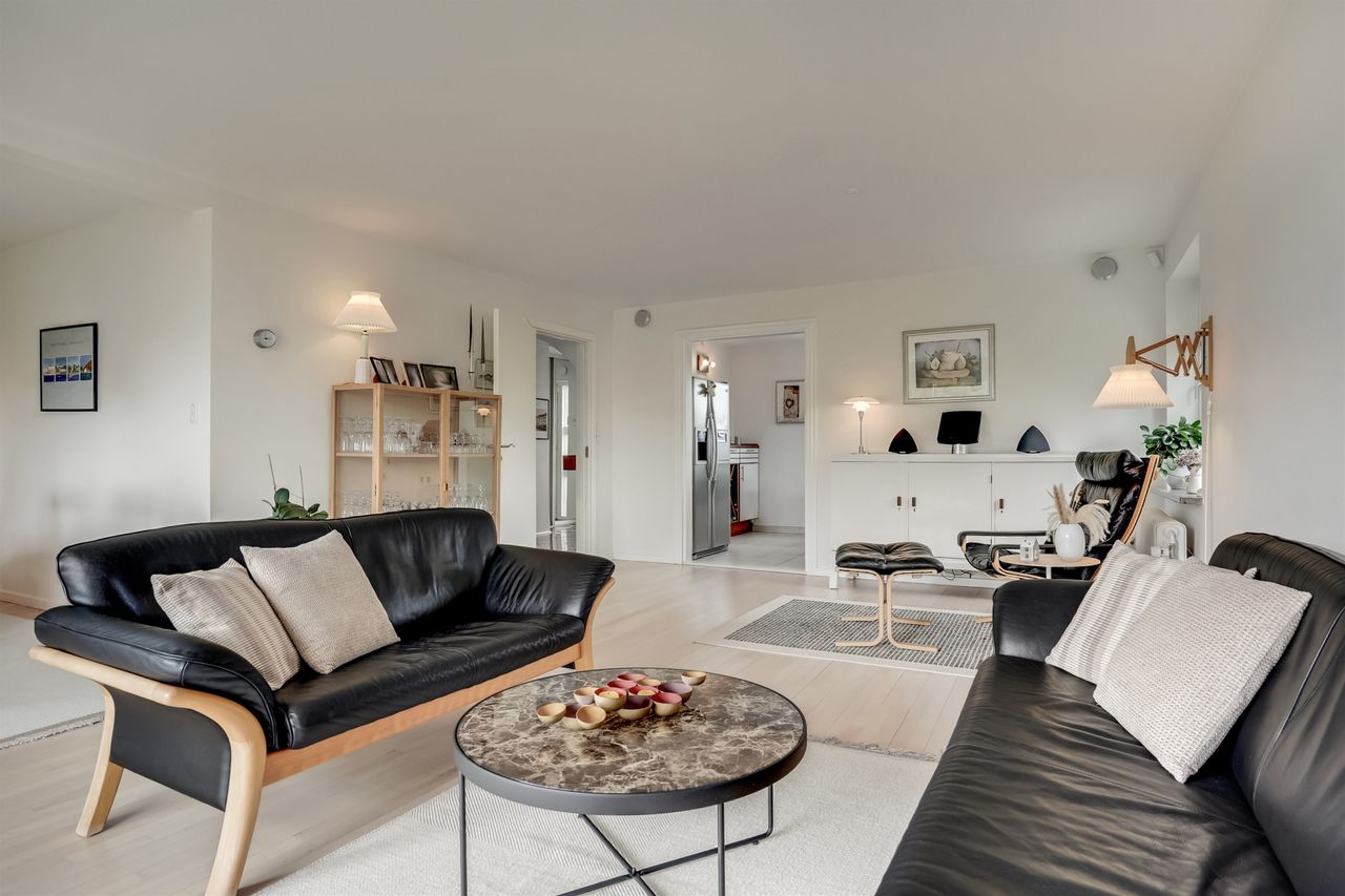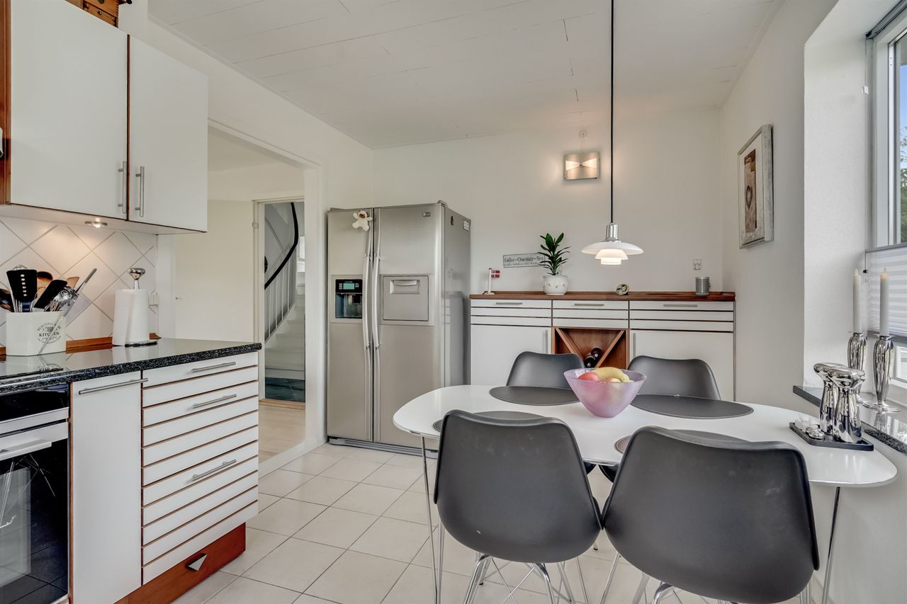 I stueplan træder du ind i en lys og indbydende hall, hvor der også findes et praktisk gæstetoilet. Herfra er der adgang til boligens store, åbne vinkelstue med rigelig plads til både opholdsstue og spisestue – et fleksibelt rum med direkte udgang til terrasse og have. Det tilstødende køkken fremstår lyst og velholdt med god spiseplads. Ønsker du et mere åbent plan, er der oplagt mulighed for at skabe et moderne køkkenalrum i forbindelse med stuen.
