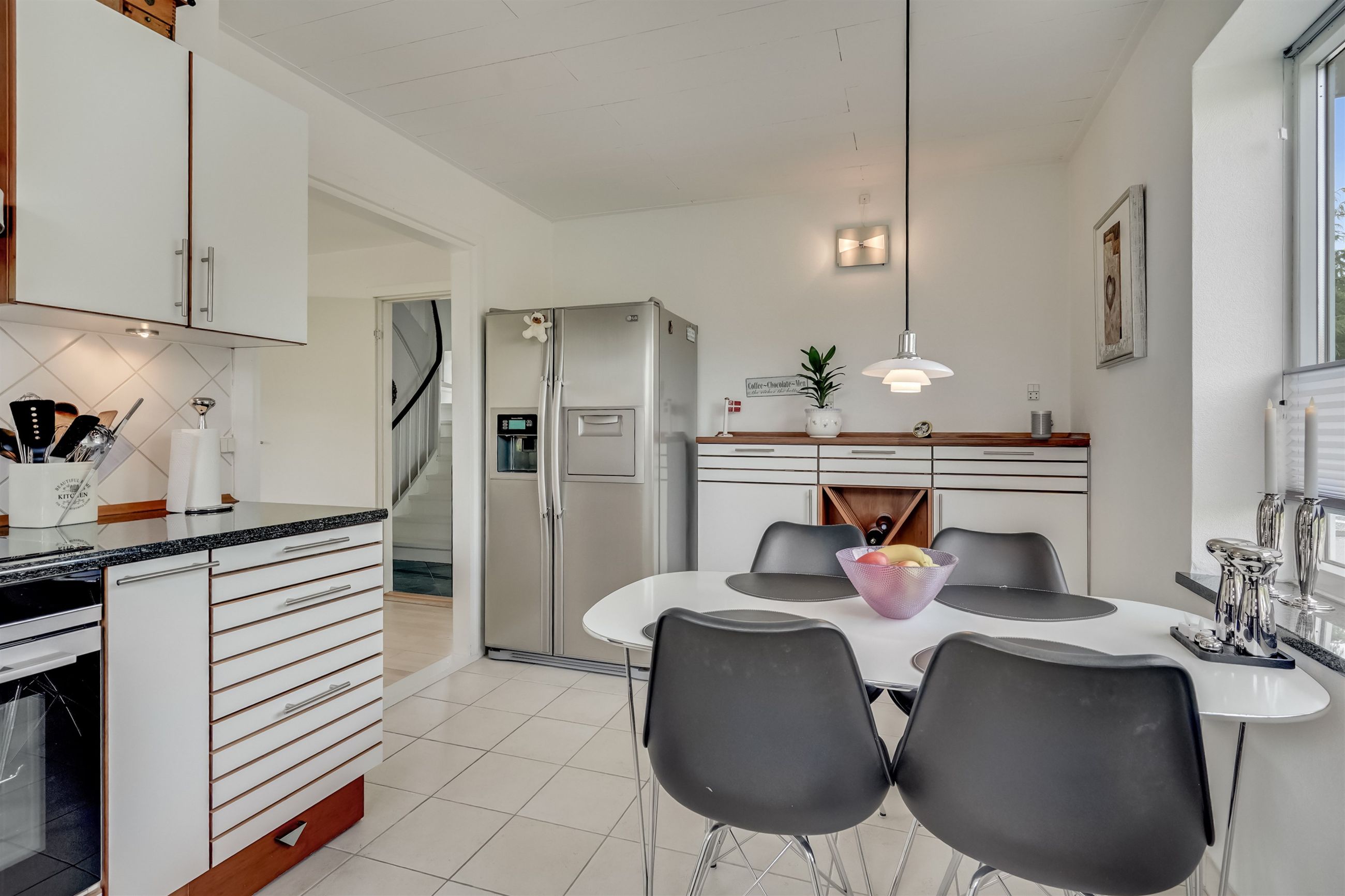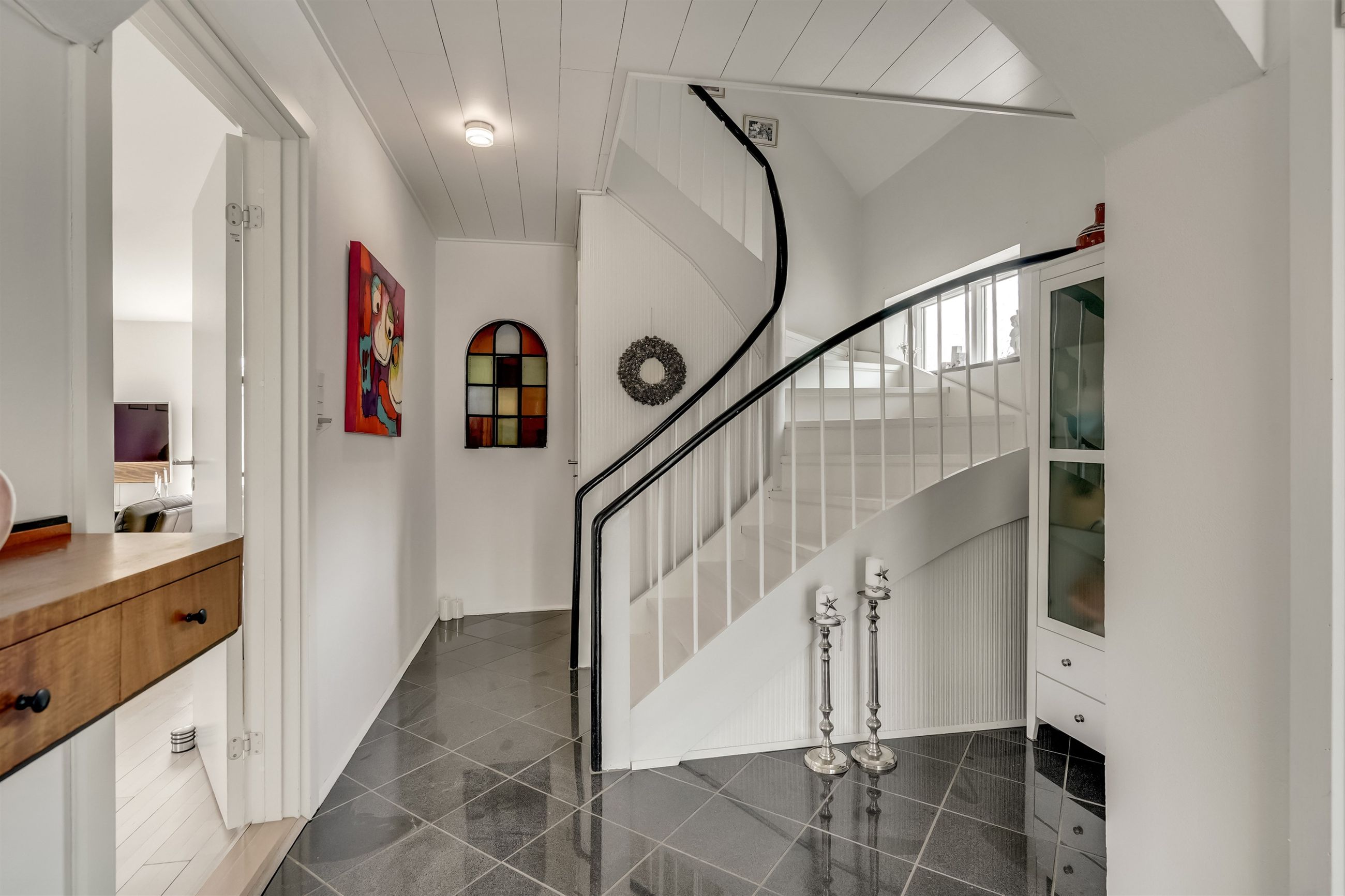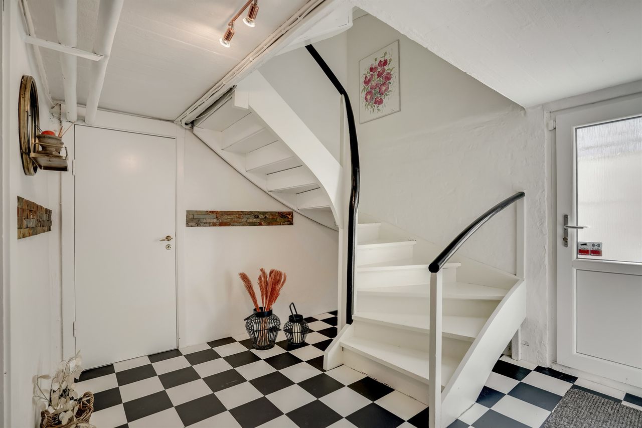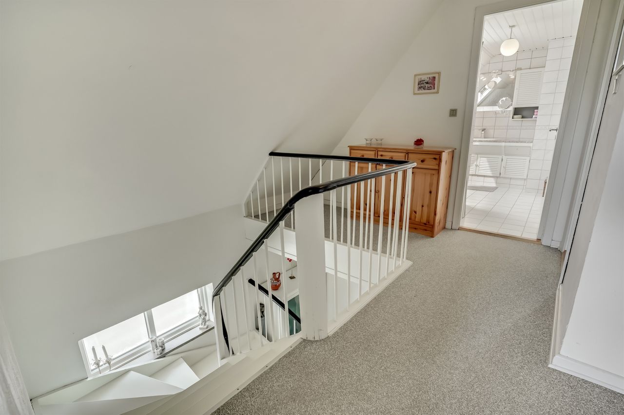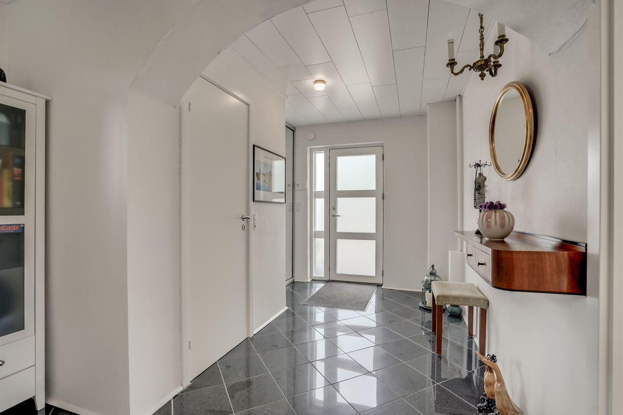 Ejendommen byder på en skøn atmosfære med masser af lys og rummelighed. Allerede ved ankomsten mødes man af en præsentabel hall med den originale, smukt svungne trappe, der elegant fører op til første sal – et tydeligt tegn på den klassiske charme, huset besidder.