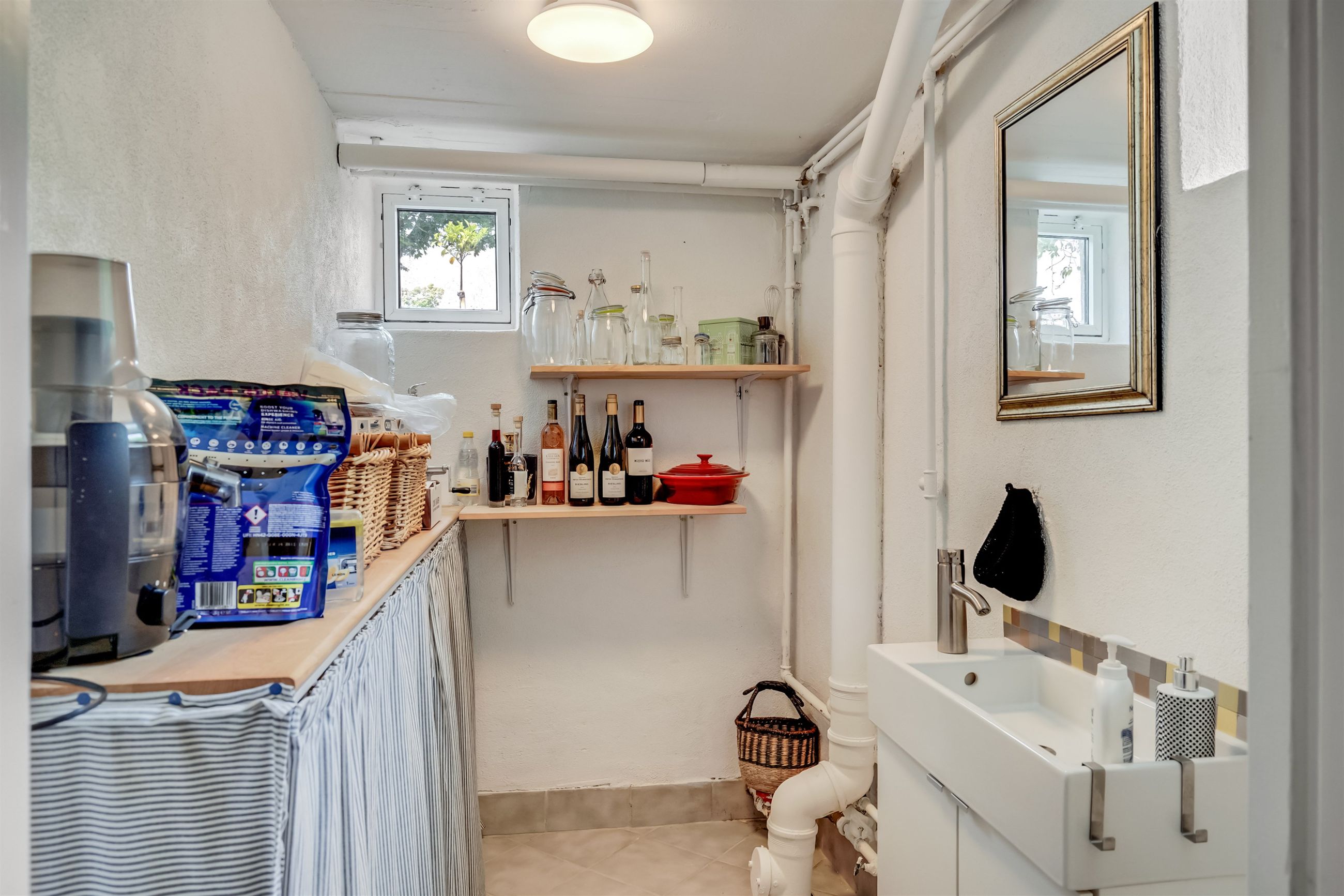 Kælderen er i en klasse for sig. Her får du tre gode disponible rum med mange anvendelsesmuligheder, et stort vaskerum med bordplads, opbevaring og mulighed for vaskefaciliteter i højden samt et viktualierum.
