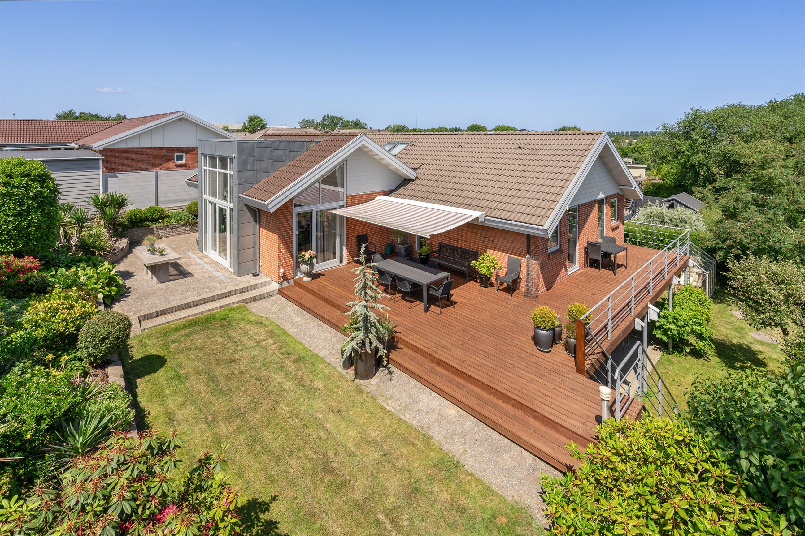 Haven er skøn, ugeneret og velanlagt med varieret beplantning og flere uderum. Den store, nyopførte træterrasse giver optimale rammer for afslapning og sociale sammenkomster med en fantastisk udsigt over det grønne. Derudover findes en overdækket terrasse, carport med tilhørende redskabsrum og ekstra disponible rum i underetagen.
