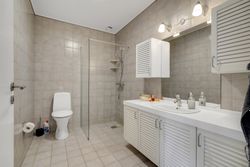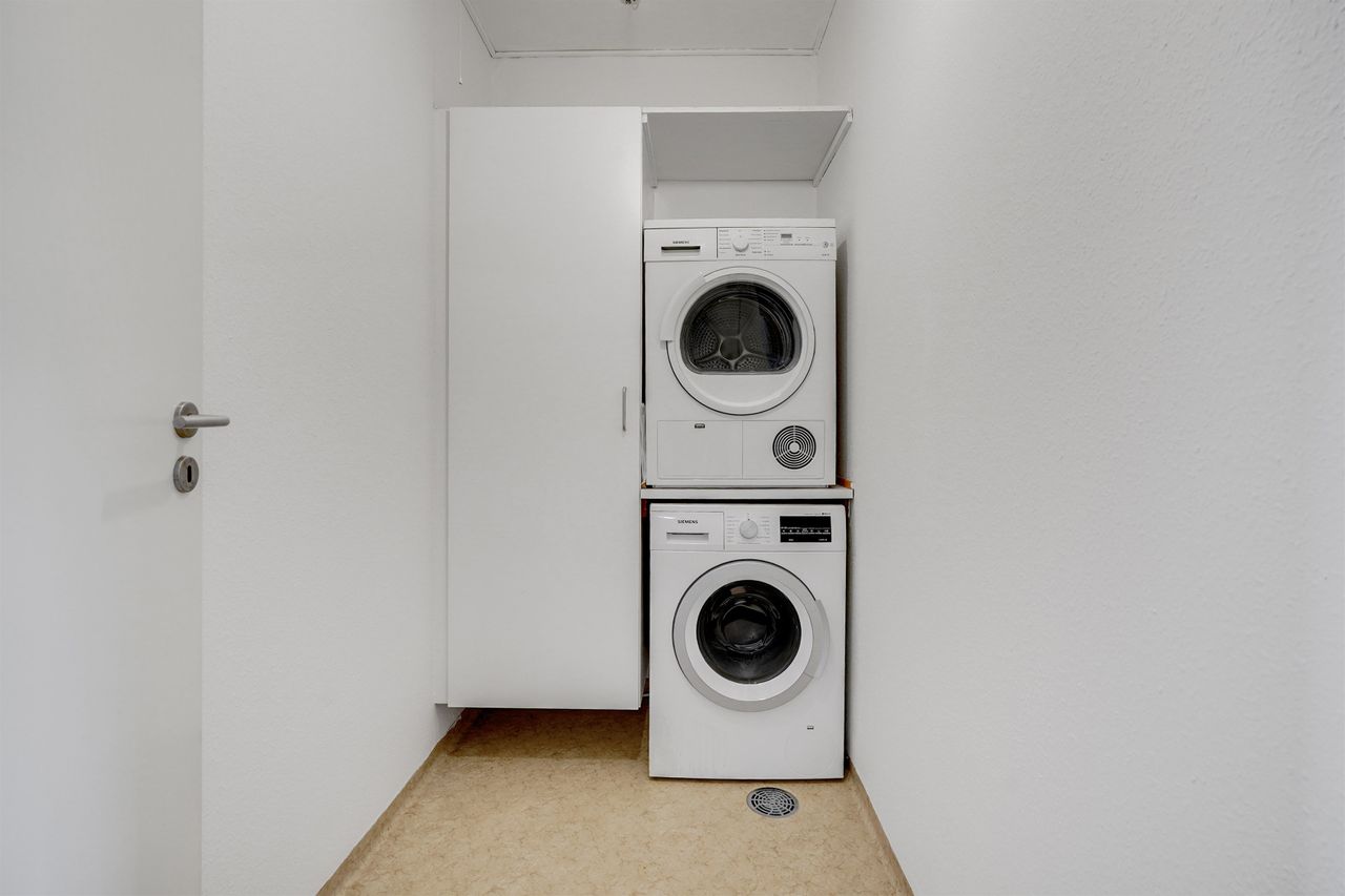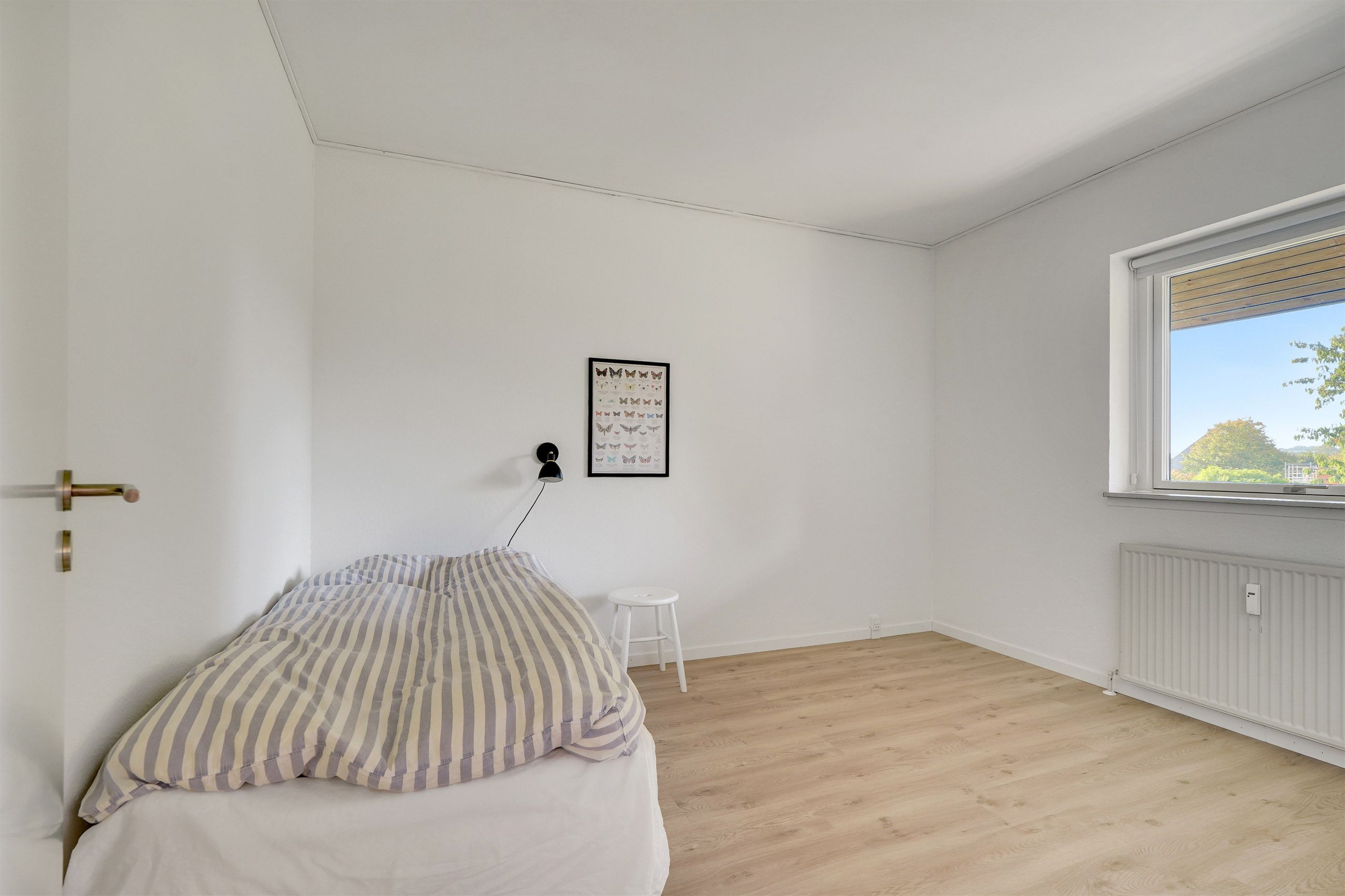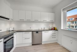 Lejligheden rummer to gode værelser, hvoraf det ene har indbyggede skabe – perfekt som soveværelse. Badeværelset er praktisk indrettet i tidløst design og placeret centralt ved værelserne. Køkkenet fremstår lyst og rummeligt med god arbejdsplads, og som en særlig bonus findes et bryggers med plads til vaskefaciliteter – en sjælden luksus i en ejerlejlighed.