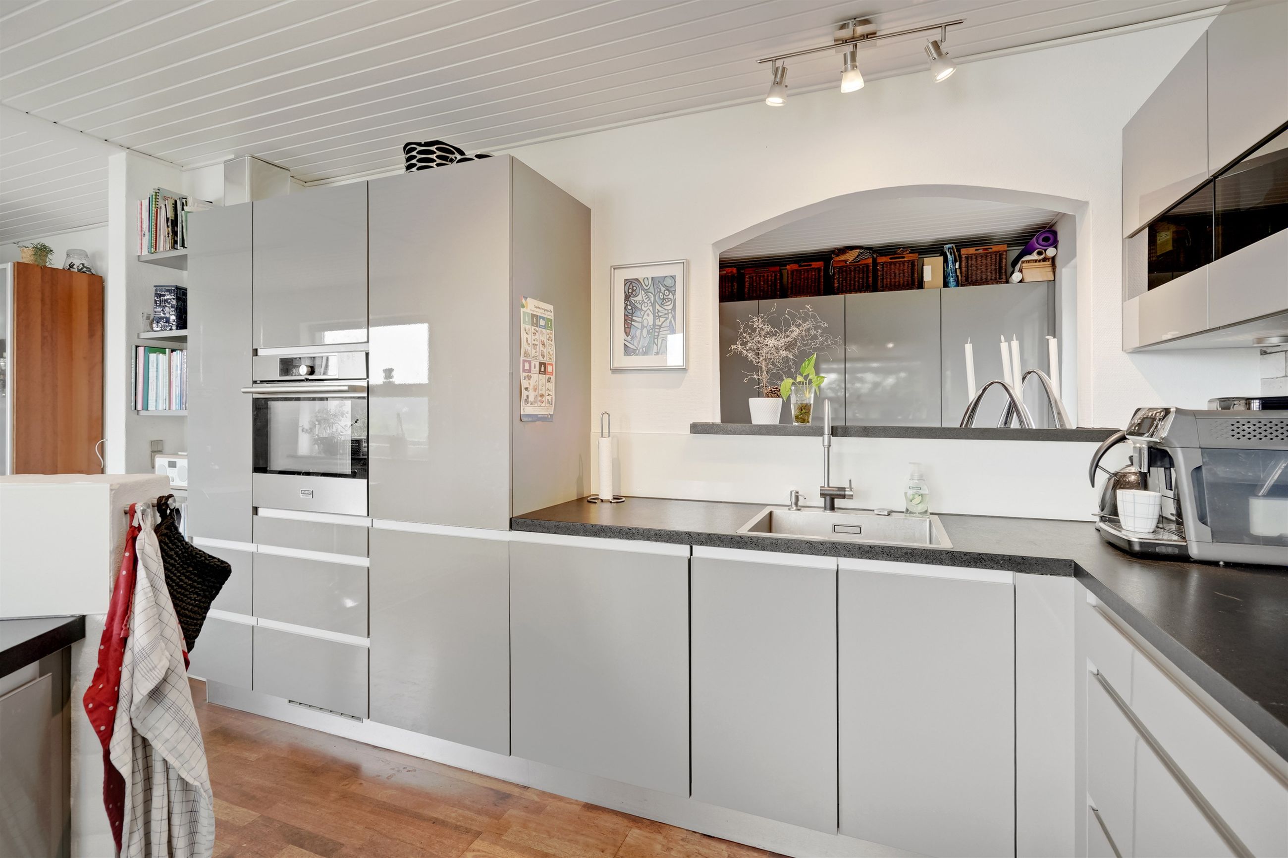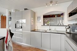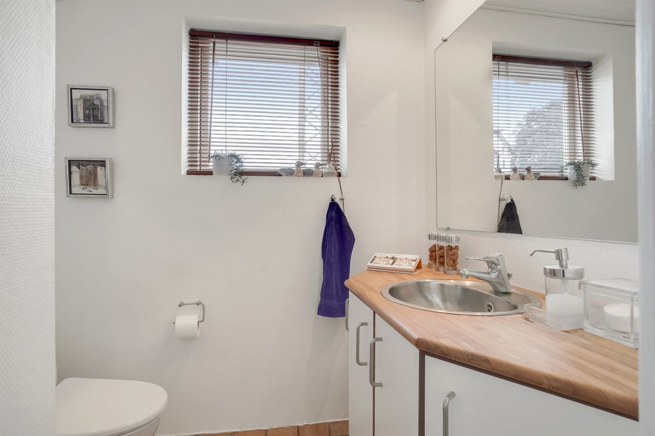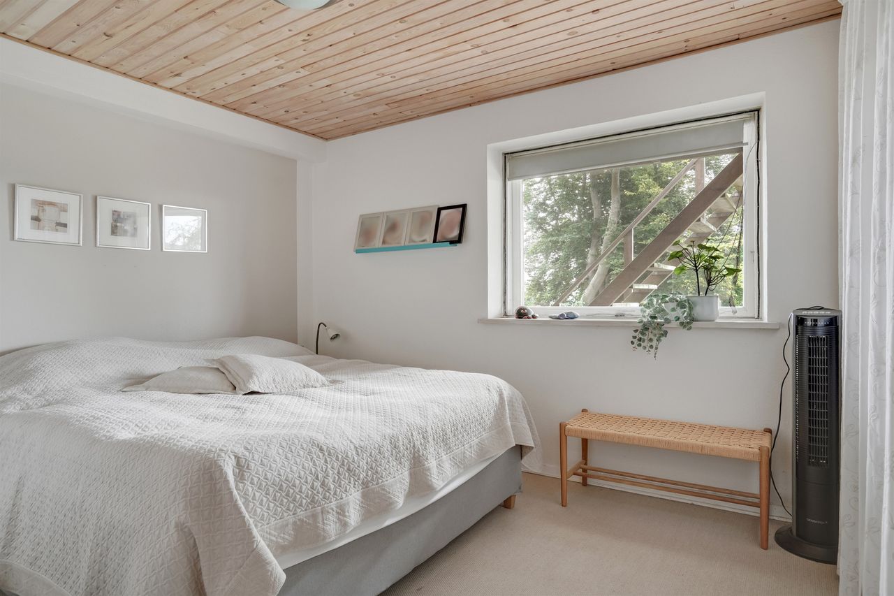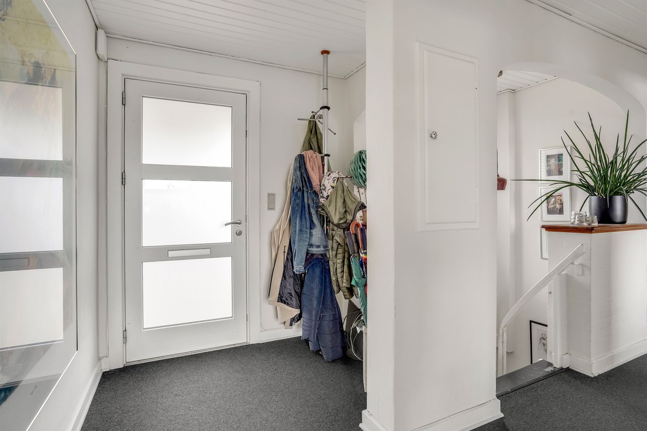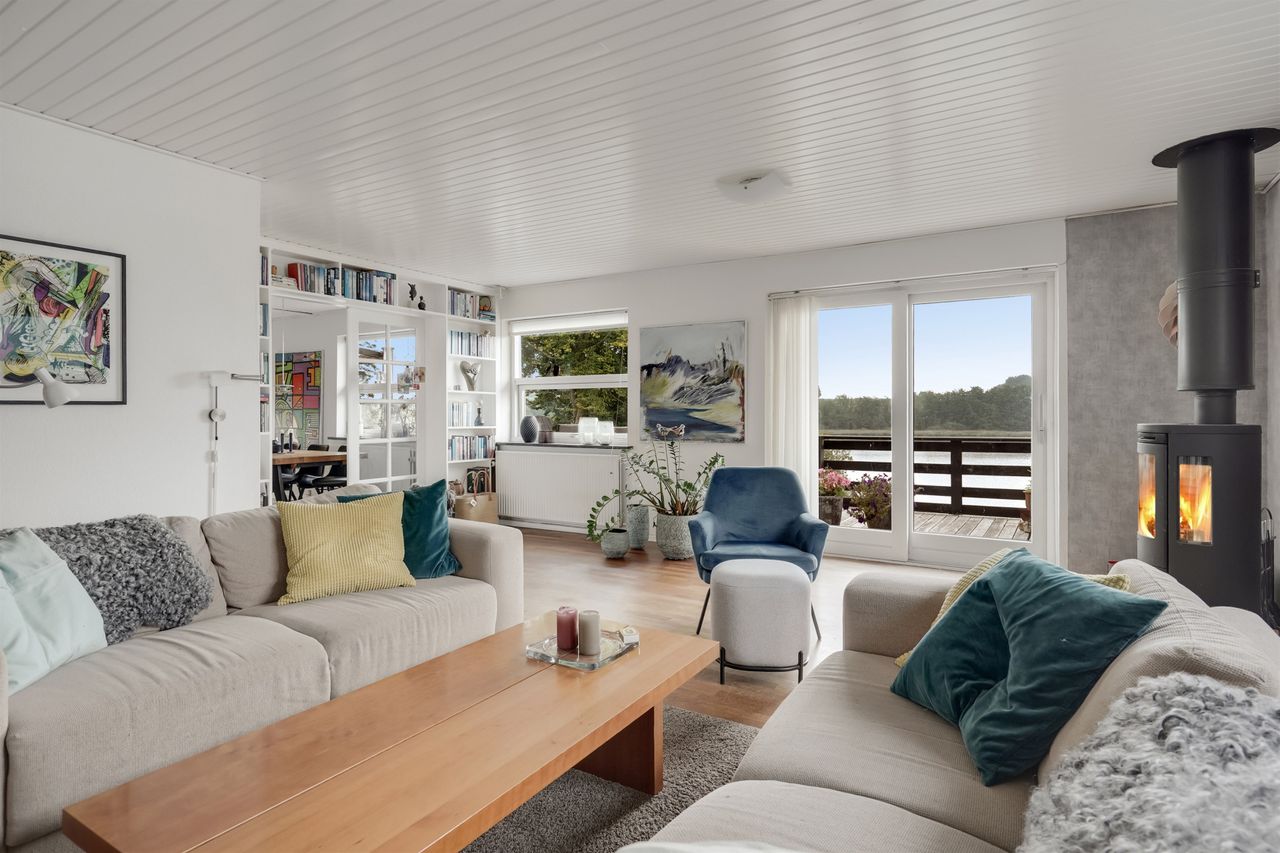 Når du træder ind i den lyse og rummelige entré, åbner boligen sig mod en stor stue, hvor det første øjet fanger er den betagende udsigt over Lillehav. Fra stuen er der direkte udgang til den store træterrasse – så drømmer du om det perfekte sted til afslapning, gæster eller en stille kop kaffe i morgensolen så er muligheden her. Via elegante dobbeltdøre er der adgang til det lyse og indbydende køkken-alrum med køkken fra Vordingborg Køkken. Også her kan udsigten nydes, mens madlavningen står på, og rummenes åbne forbindelse skaber en naturlig ramme om samvær og hverdag. I stueplan findes desuden et lyst badeværelse samt en praktisk baggang med direkte adgang til carporten, så du altid kan komme tørskoet ind.