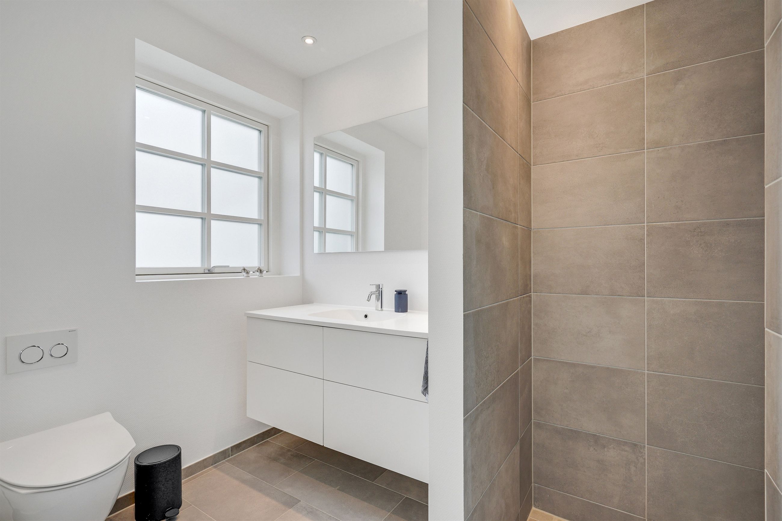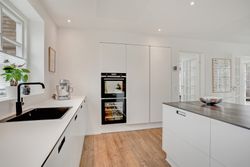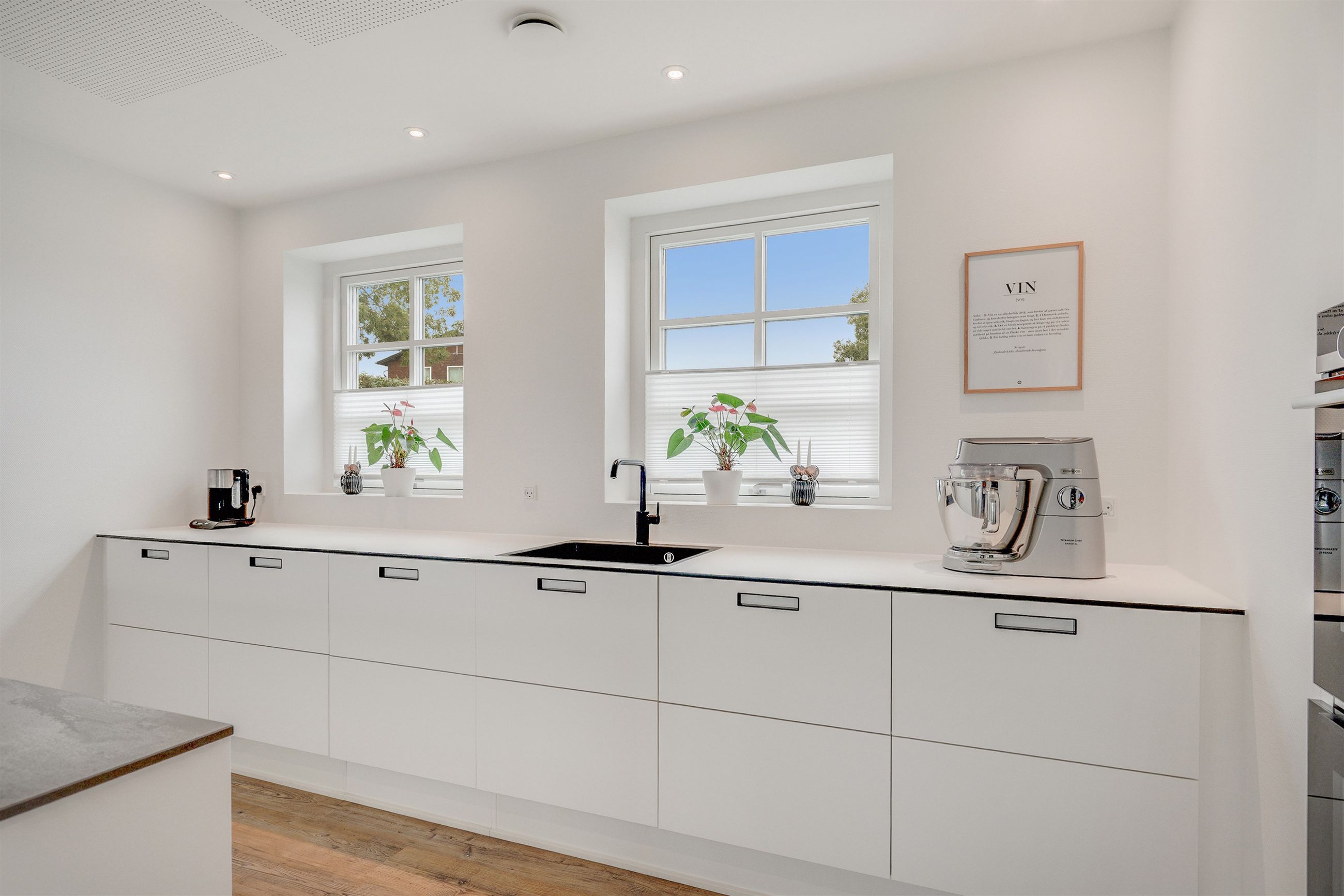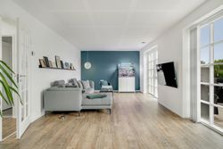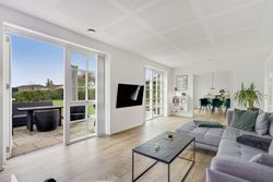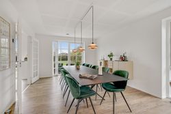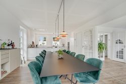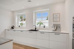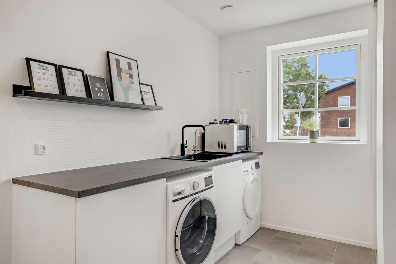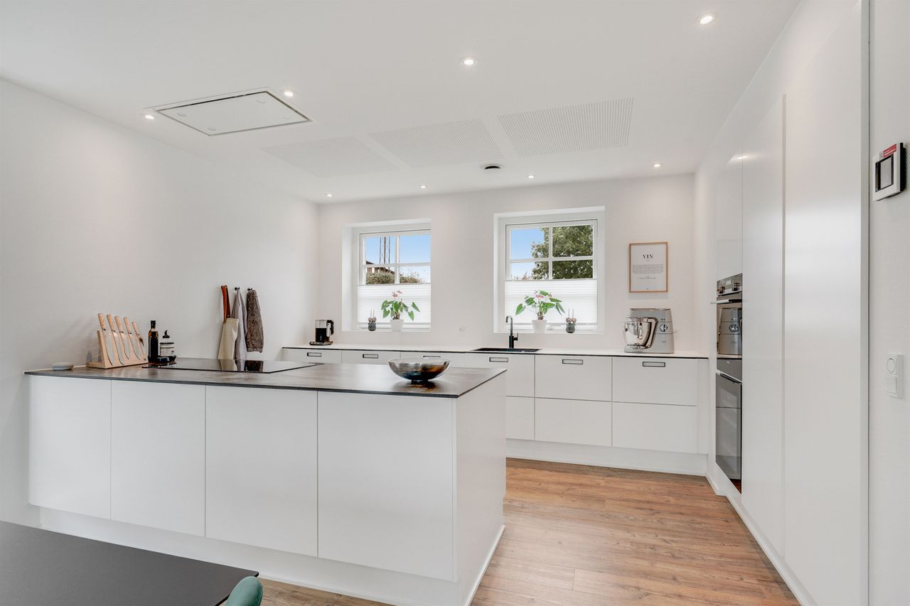 Fra hallen bevæger du dig ind i den store opholdsstue, som byder på god plads til både sofahjørne og samvær med familie og venner. Herfra er der direkte adgang til haven og den dejlige sydvendte terrasse, som forlænger opholdsrummet udendørs i sommermånederne. Via dobbelte franske døre kommer man ind i det lyse og rummelige køkkenalrum, hvor det stilrene Svane-køkken sætter en moderne ramme om hverdagens madlavning og hyggelige middage. Der er god plads til spisebord og samvær, og den gennemtænkte planløsning gør rummet ideelt til både hverdag og gæster. Stueplanen rummer desuden et flot badeværelse og et praktisk bryggers med vaskefaciliteter, bordplads, håndvask og egen indgang – en funktionel detalje, der gør hverdagen lettere.