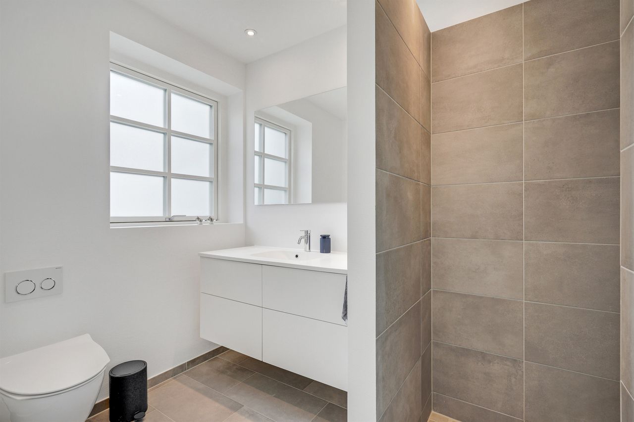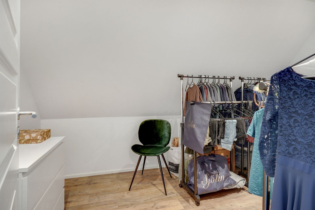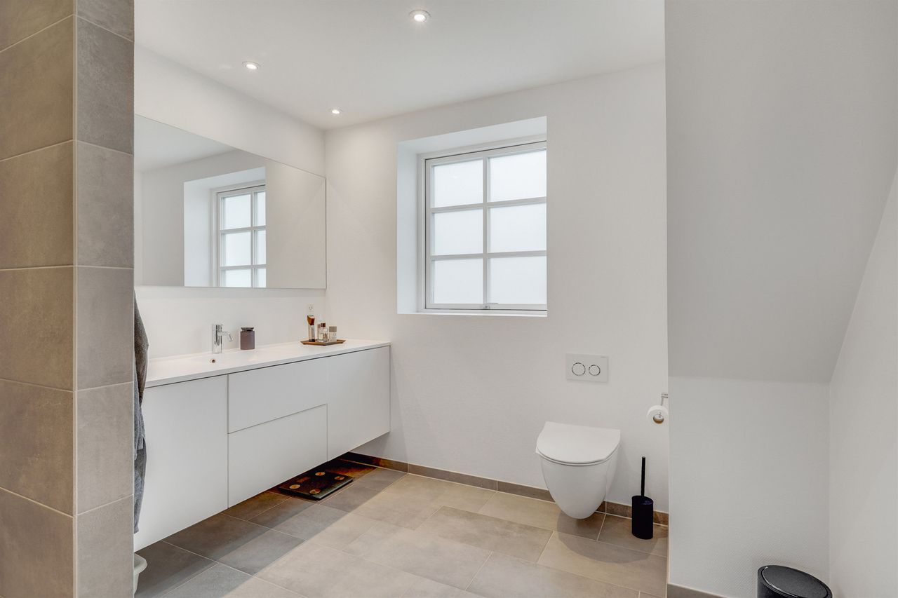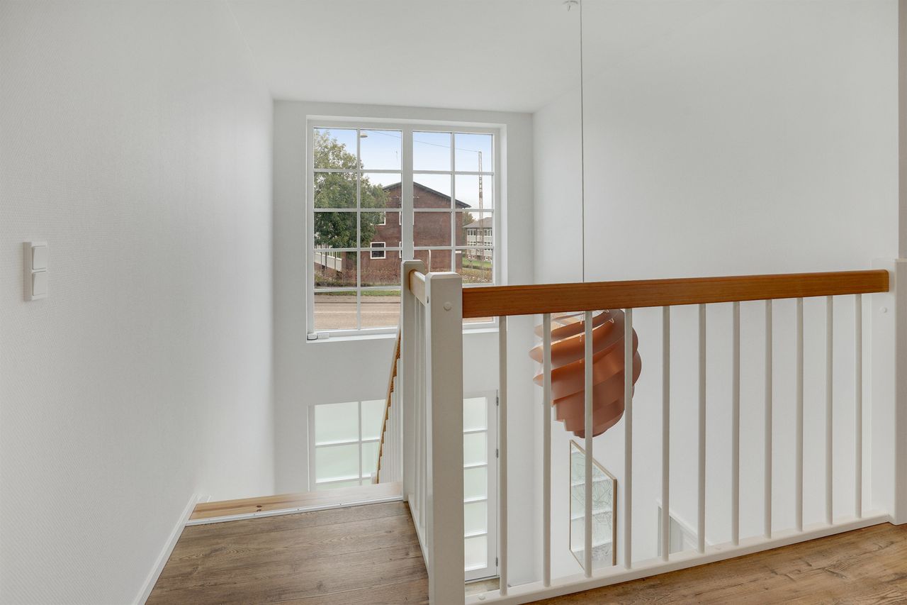 Den elegante trappe fører op til første sal, hvor et lyst repos forbinder værelserne. Her finder du et rummeligt soveværelse med eget walk-in, perfekt som forældreafdeling. Etagen rummer yderligere to gode værelser samt et moderne badeværelse med dobbelt bruser. Villaen er opført med fokus på moderne komfort og energieffektivitet. Her er gulvvarme i hele stueplanen samt på badeværelset på 1. sal, hvilket sikrer en behagelig varmefordeling og et lavere energiforbrug. Derudover er der ventilationsanlæg, BWT-anlæg og effektive løsninger, som sikrer et sundt og behageligt indeklima året rundt.