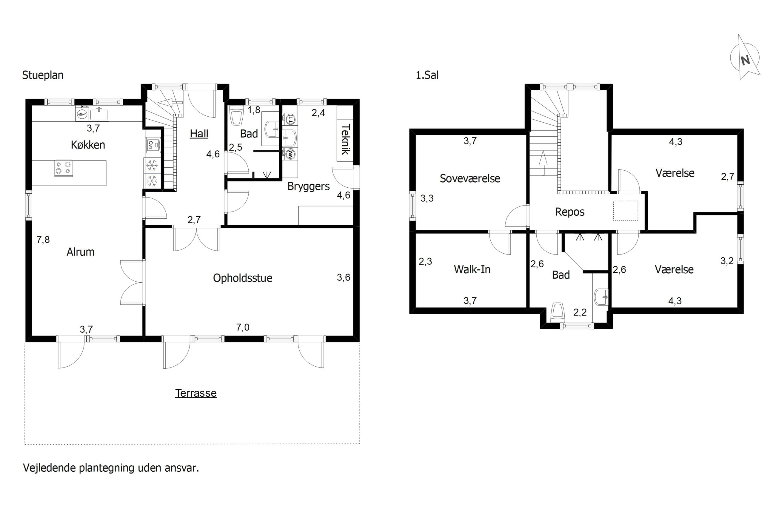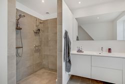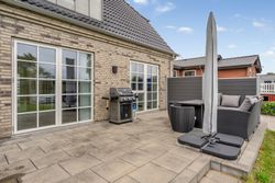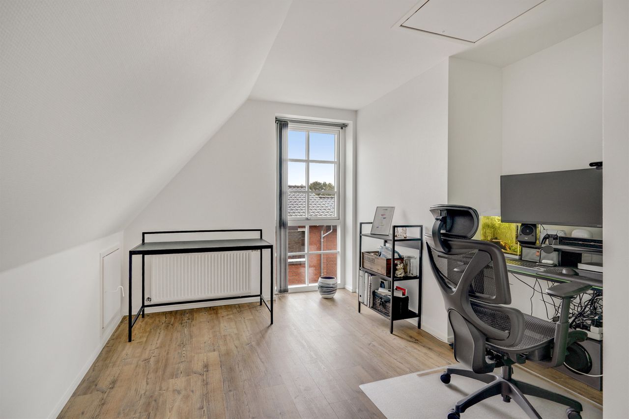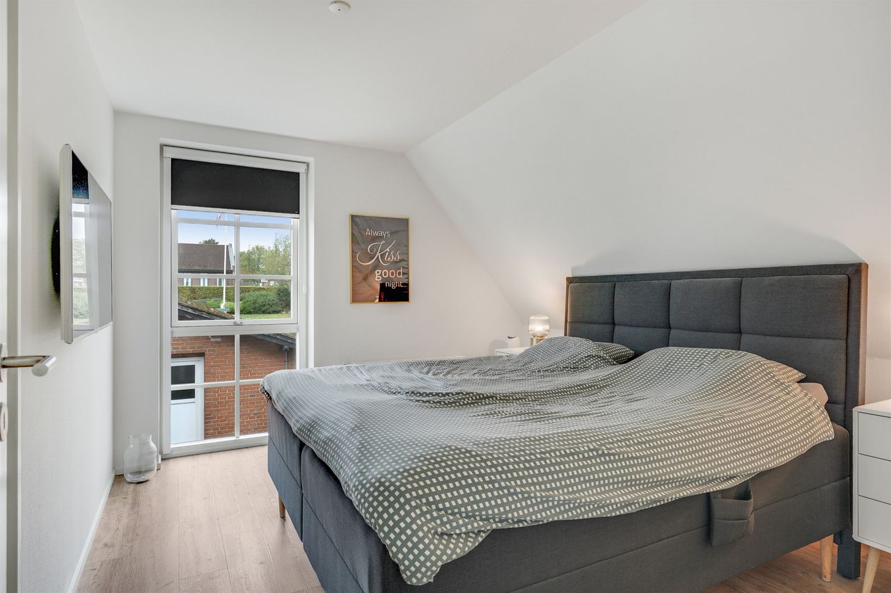 Den elegante trappe fører op til første sal, hvor et lyst repos forbinder værelserne. Her finder du et rummeligt soveværelse med eget walk-in, perfekt som forældreafdeling. Etagen rummer yderligere to gode værelser samt et moderne badeværelse med dobbelt bruser. Villaen er opført med fokus på moderne komfort og energieffektivitet. Her er gulvvarme i hele stueplanen samt på badeværelset på 1. sal, hvilket sikrer en behagelig varmefordeling og et lavere energiforbrug. Derudover er der ventilationsanlæg, BWT-anlæg og effektive løsninger, som sikrer et sundt og behageligt indeklima året rundt.
