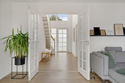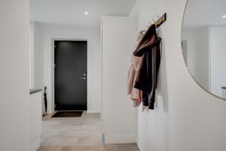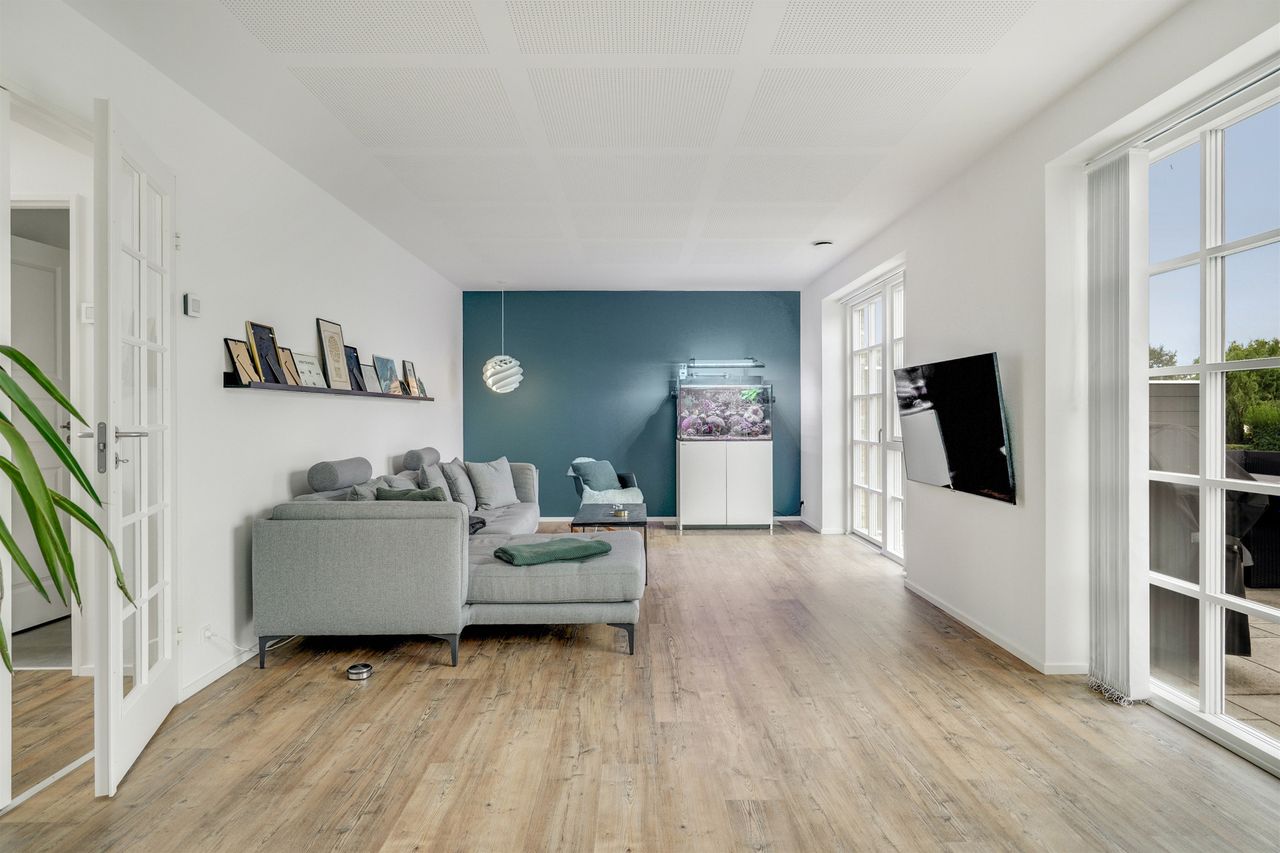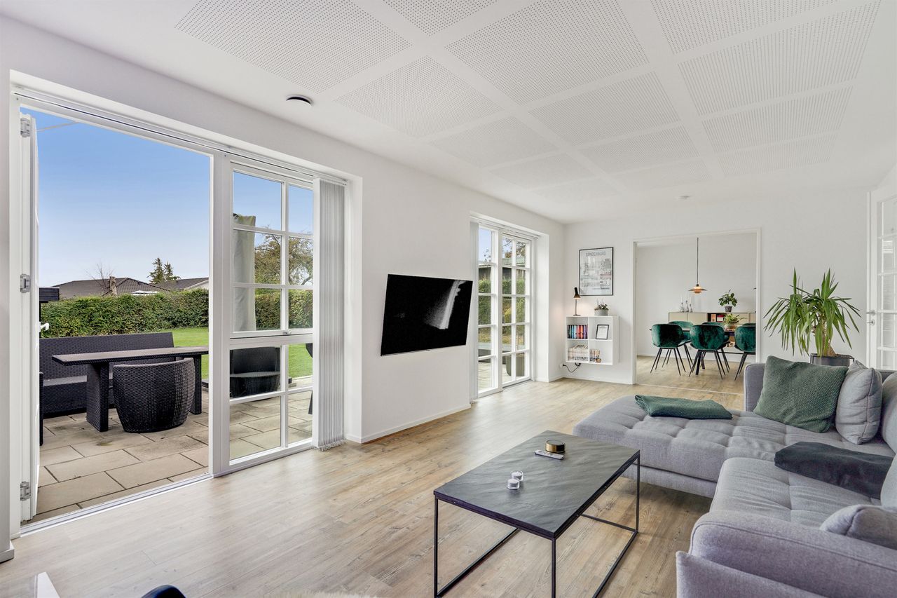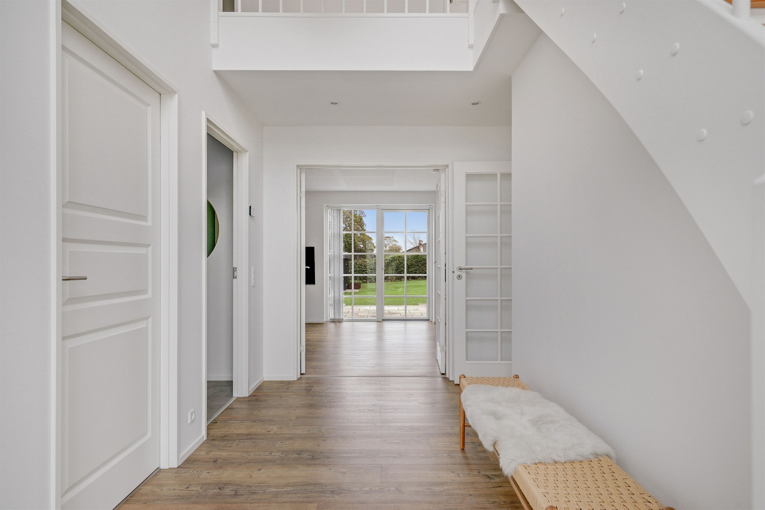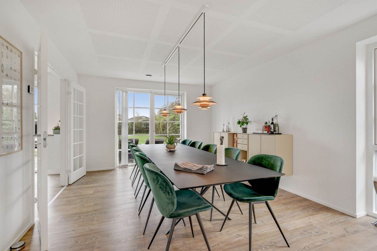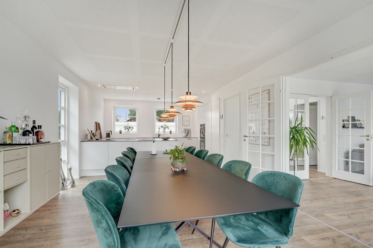 Allerede når du træder ind i den store hall, bliver du mødt af en imponerende rumfornemmelse med højt til loftet og masser af naturligt lys fra de store vinduespartier. Hallen fungerer som hjemmets hjerte og forbinder elegant de forskellige opholdsrum.
