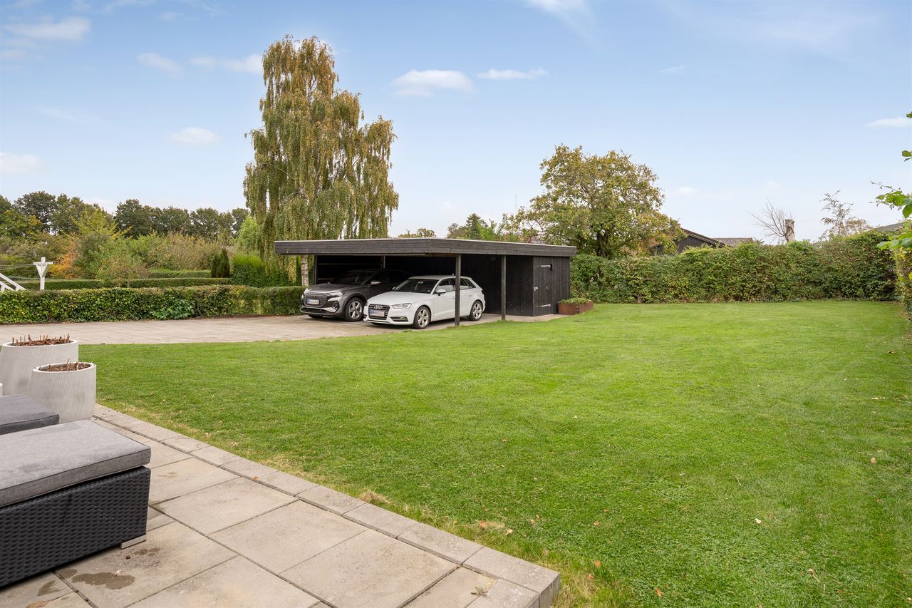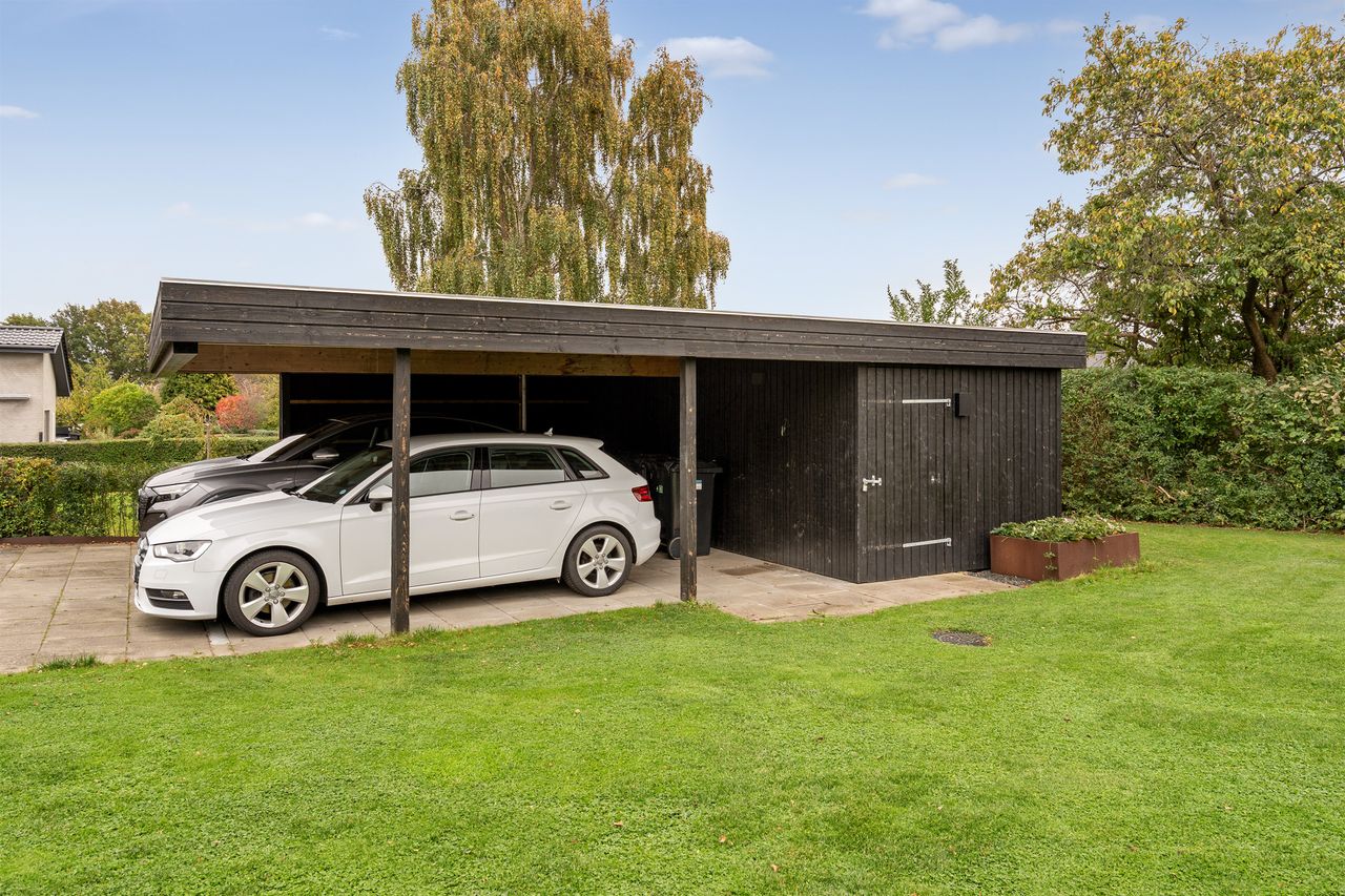 Haven er nem at holde og anlagt, så du kan nyde den uden alt for meget vedligeholdelse. Foran huset er der god parkeringsplads, og bagtil finder du en dobbelt carport med integreret skur – praktisk til både biler og opbevaring. Den sydvendte terrasse indbyder til hyggelige stunder under åben himmel, hvad enten det er grill, leg eller afslapning.