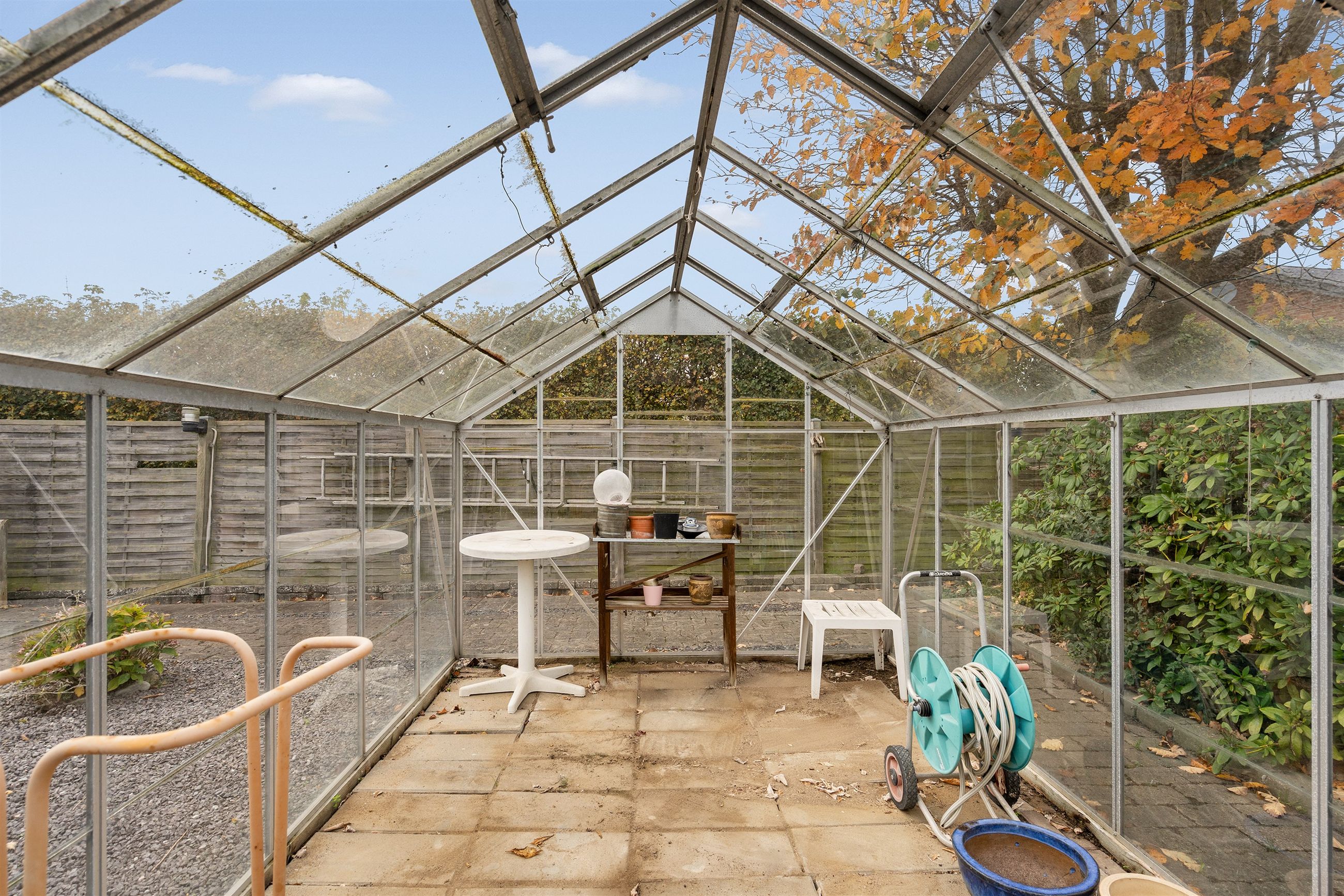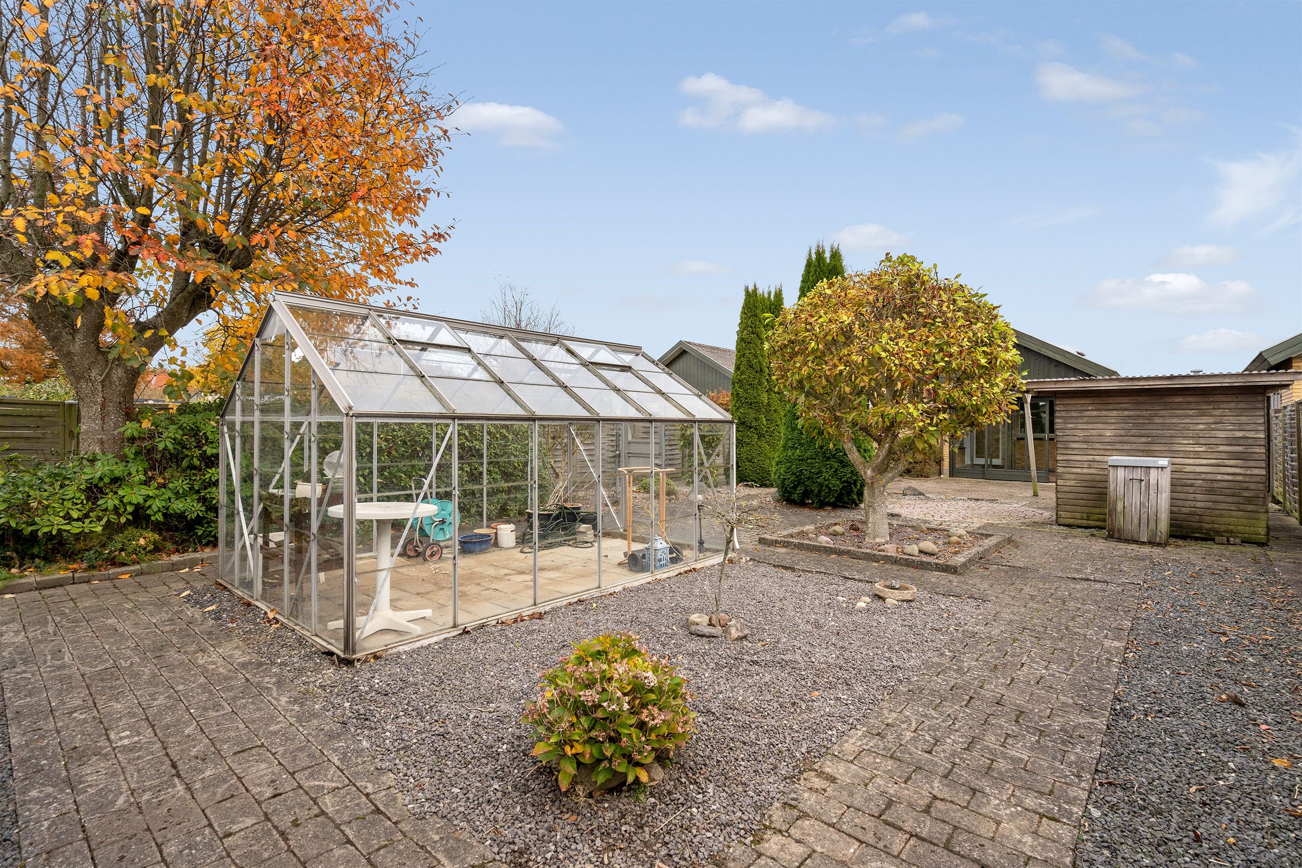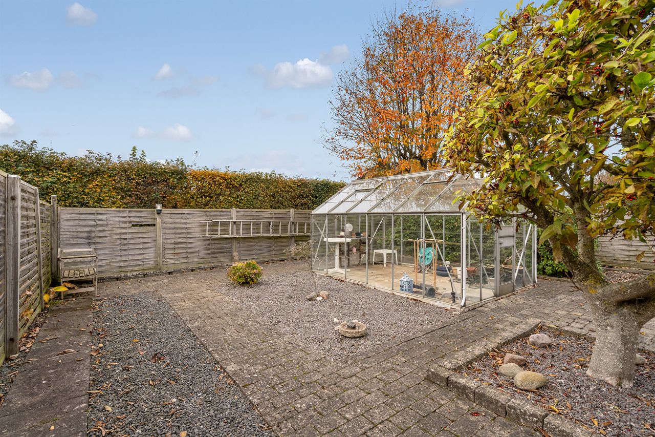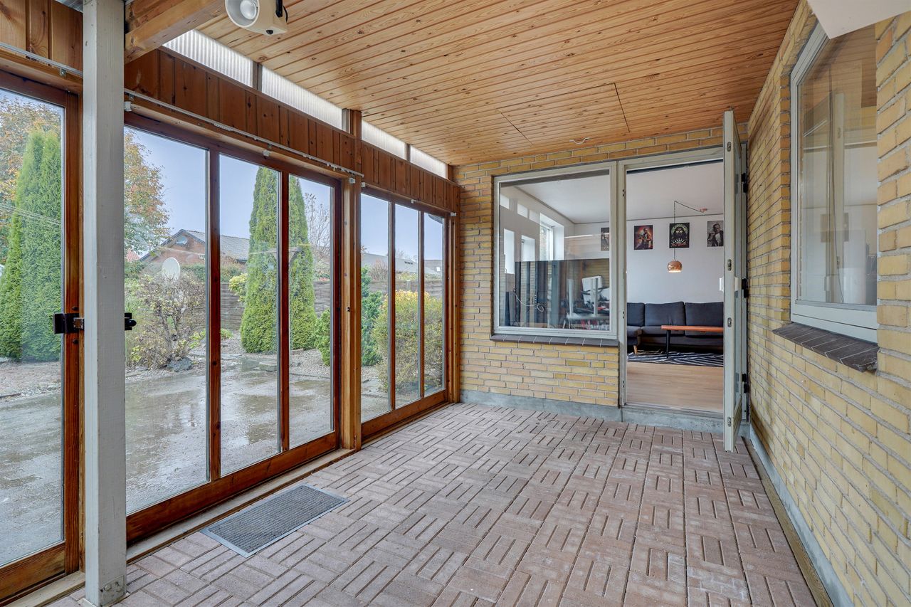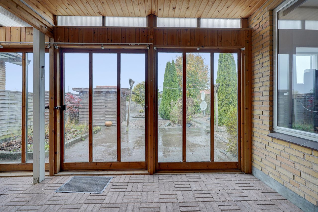 Indenfor byder boligen velkommen i en indbydende entré, hvorfra der er adgang til husets to gode værelser og et rummeligt, velholdt badeværelse. Herfra træder du ind i den store og lyse stue, som danner hjemmets naturlige samlingspunkt. Stuen har direkte udgang til en dejlig udestue – perfekt som ekstra opholdsrum det meste af året – og herfra videre adgang til den hyggelige gårdhave, hvor der er rig mulighed for at nyde udelivet i private omgivelser.