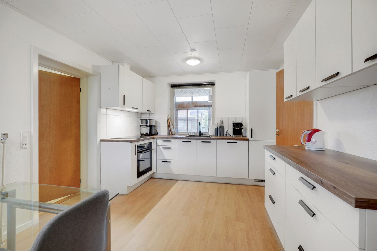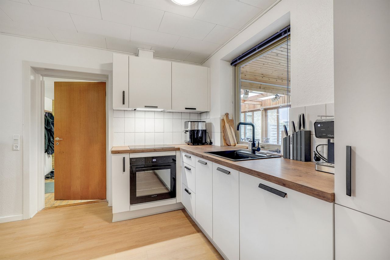 Boligens køkken er et lyst og funktionelt spisekøkken med et flot Vordingborg-køkken fra 2025. Samtidig blev gulvene i køkken og gang udskiftet, så det hele fremstår indbydende og moderne. Fra køkkenet er der adgang til et praktisk bryggers med plads til vaskefaciliteter og opbevaring – en funktionel detalje i hverdagen.
