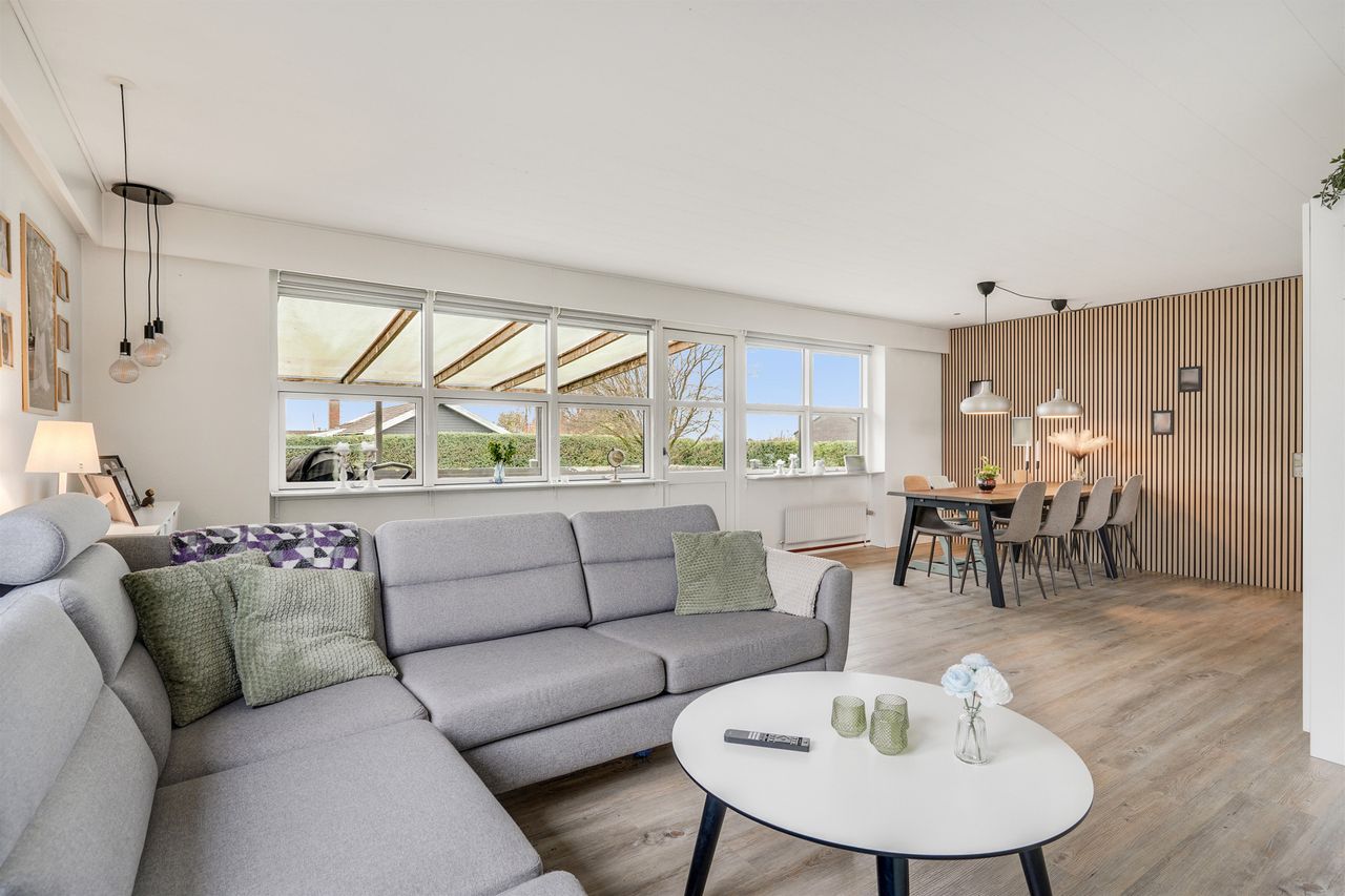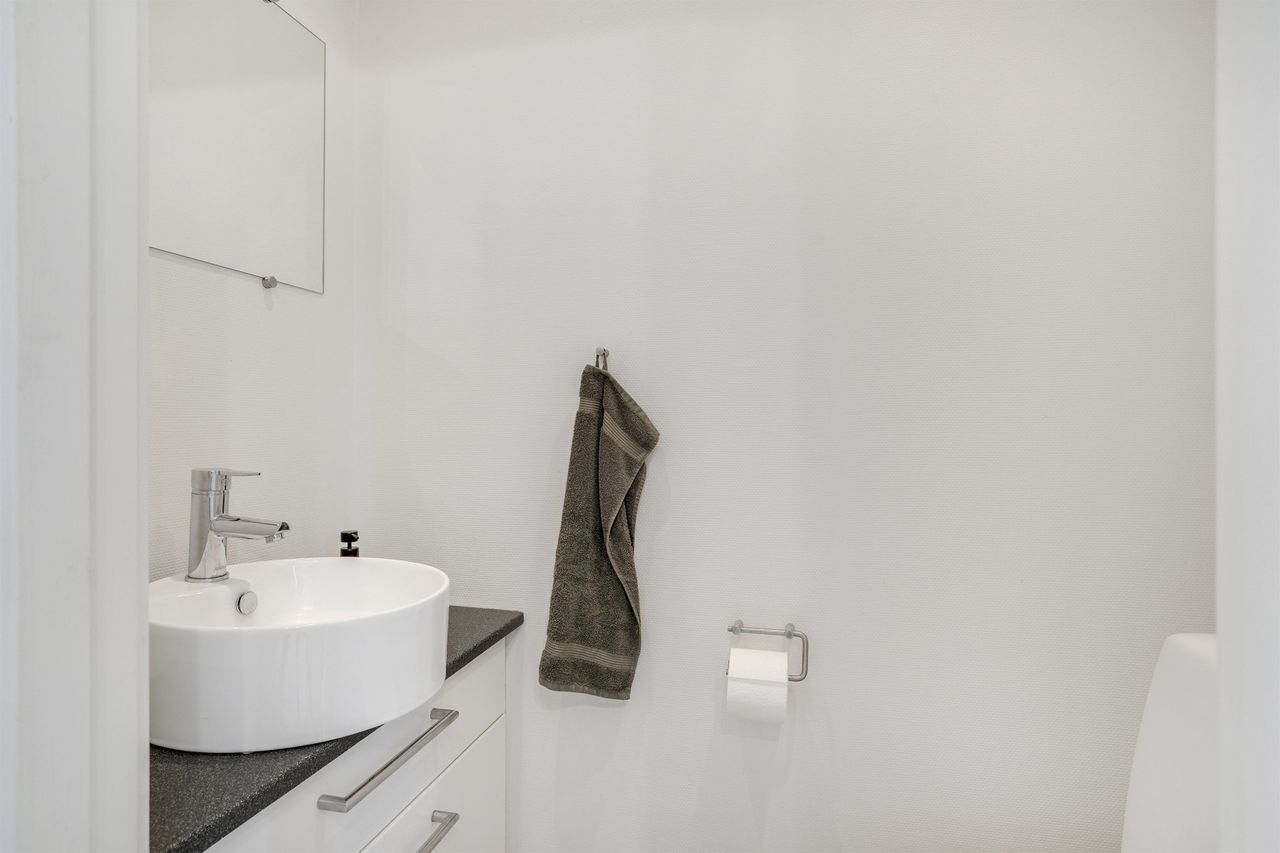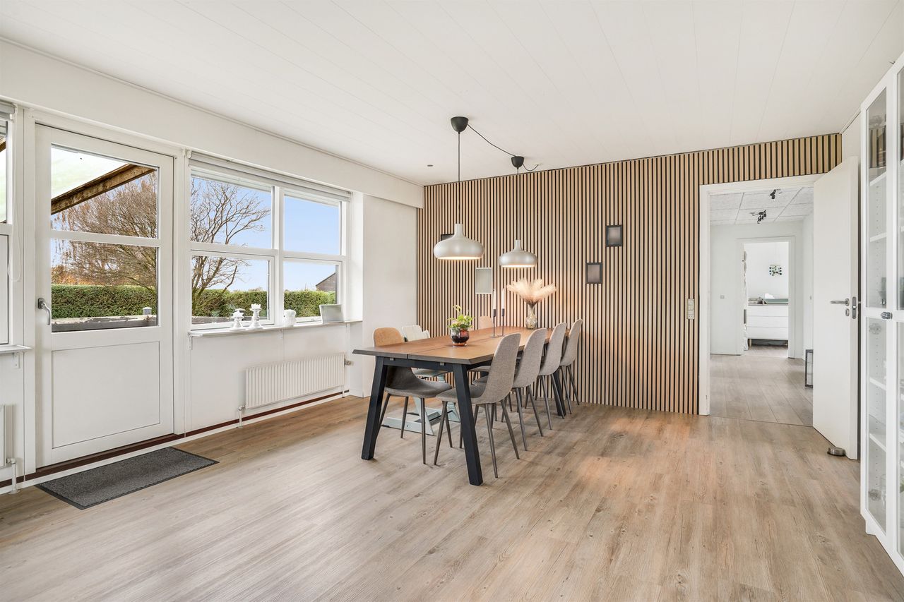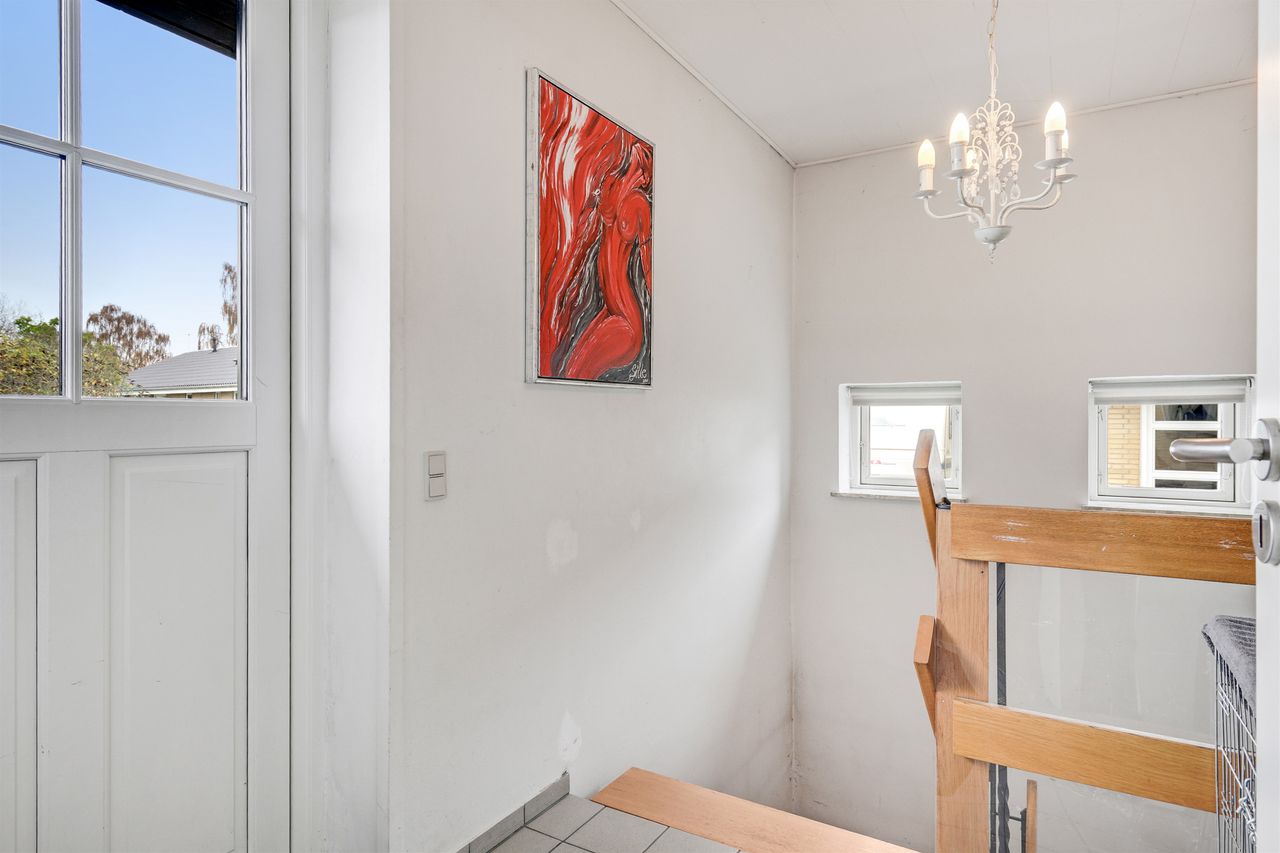 Når du træder ind i den lyse og rummelige entré, fornemmer du straks den imødekommende atmosfære. Her er husets gæstetoilet praktisk placeret. Fra entréen bevæger du dig ind i den store, lyse stue, hvor der er god plads til både sofa- og spiseafdeling. Her strømmer lyset ind gennem de store vinduespartier, og der er direkte udgang til den overdækkede terrasse og den dejlige have – et perfekt sted til afslapning eller hyggelige sommeraftener.