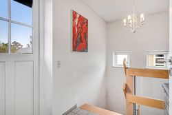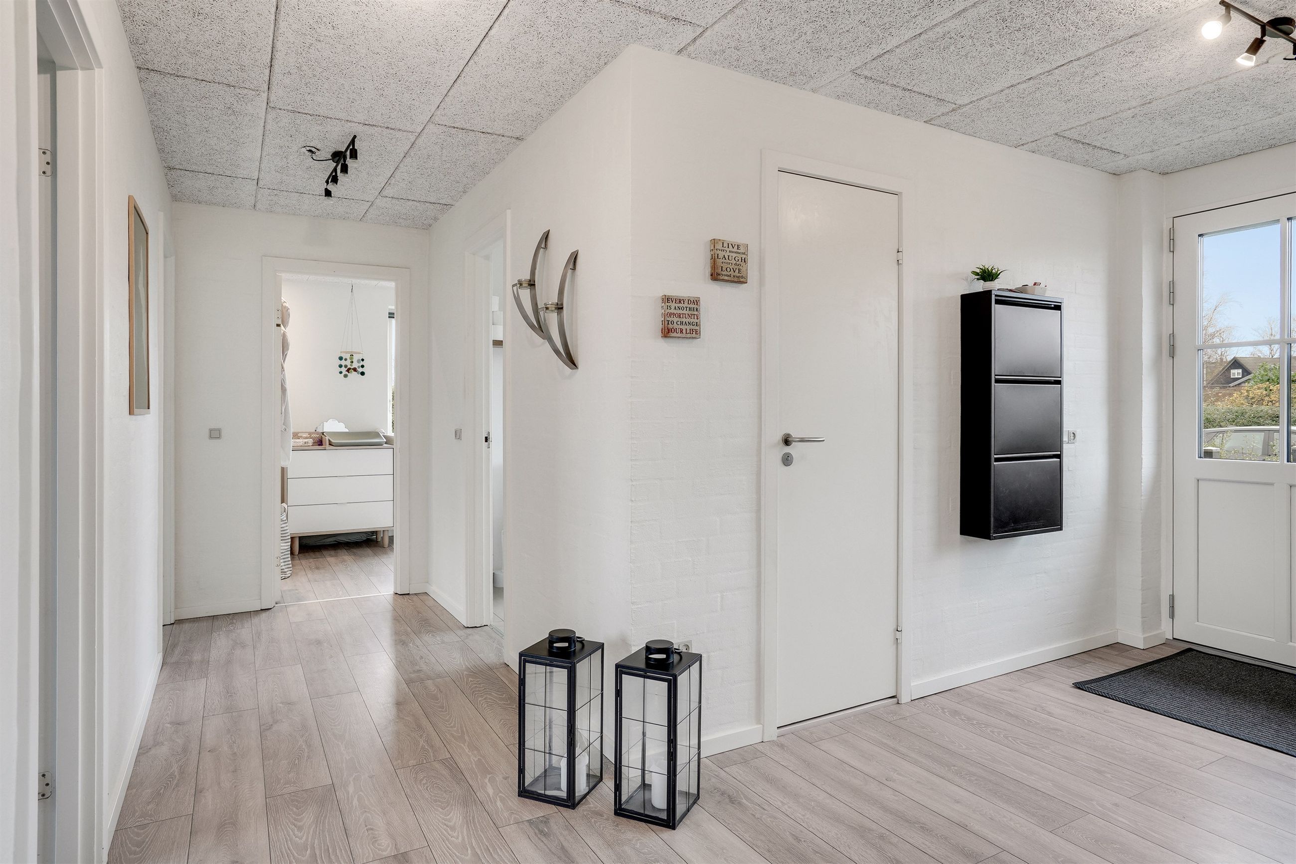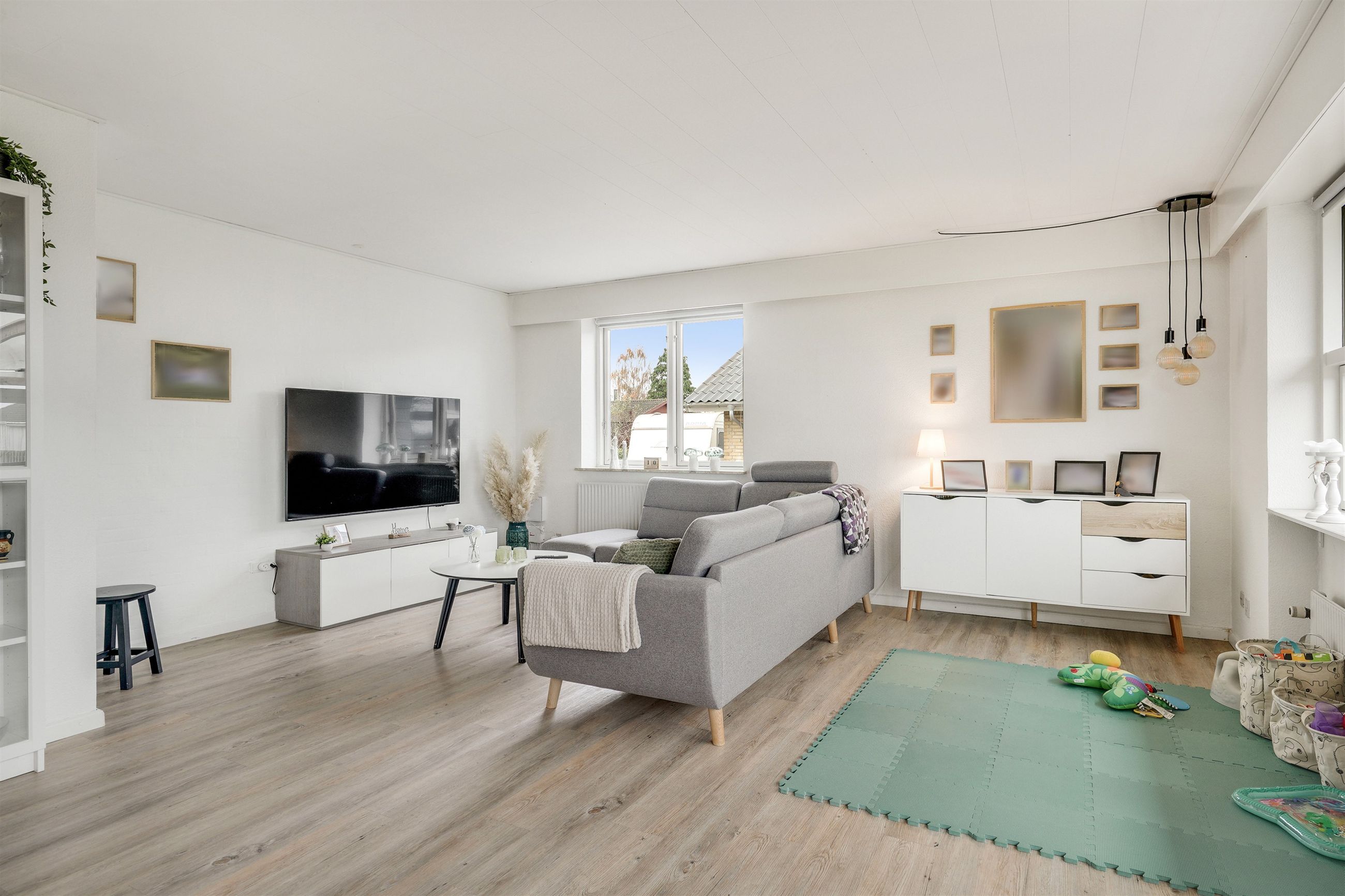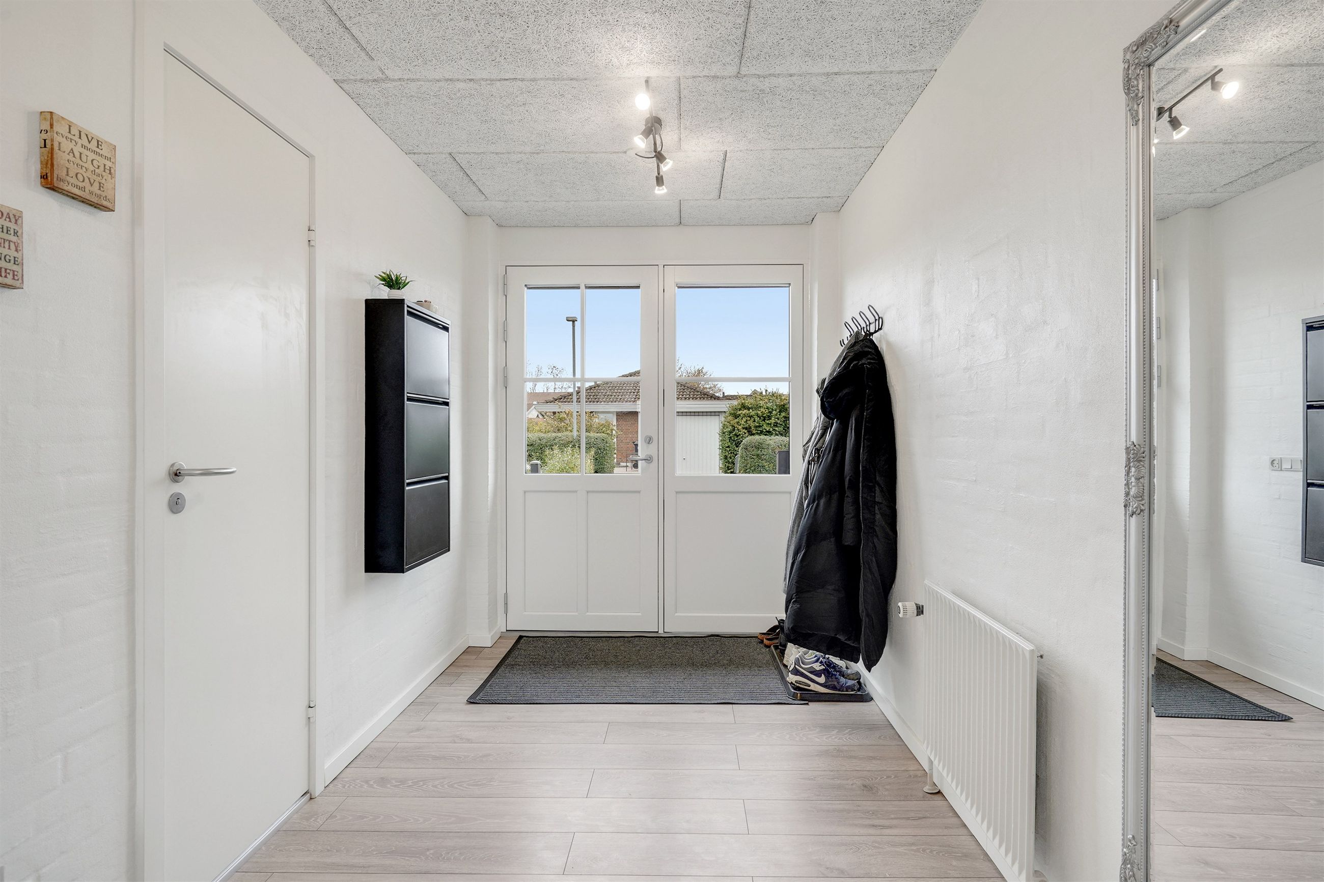 Når du træder ind i den lyse og rummelige entré, fornemmer du straks den imødekommende atmosfære. Her er husets gæstetoilet praktisk placeret. Fra entréen bevæger du dig ind i den store, lyse stue, hvor der er god plads til både sofa- og spiseafdeling. Her strømmer lyset ind gennem de store vinduespartier, og der er direkte udgang til den overdækkede terrasse og den dejlige have – et perfekt sted til afslapning eller hyggelige sommeraftener.