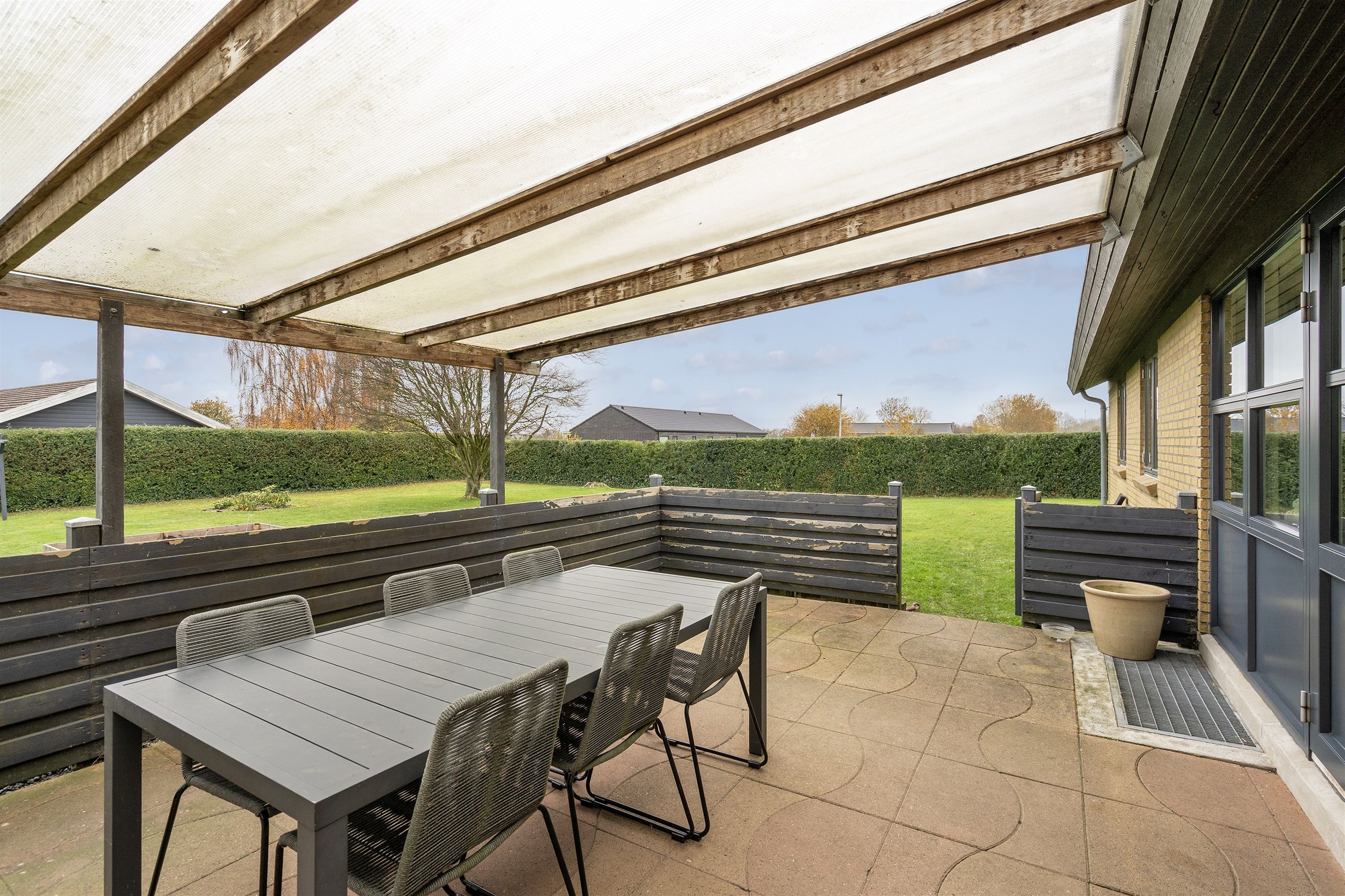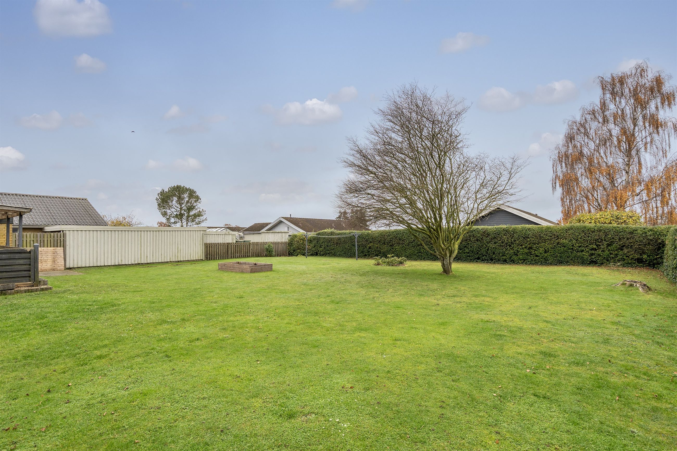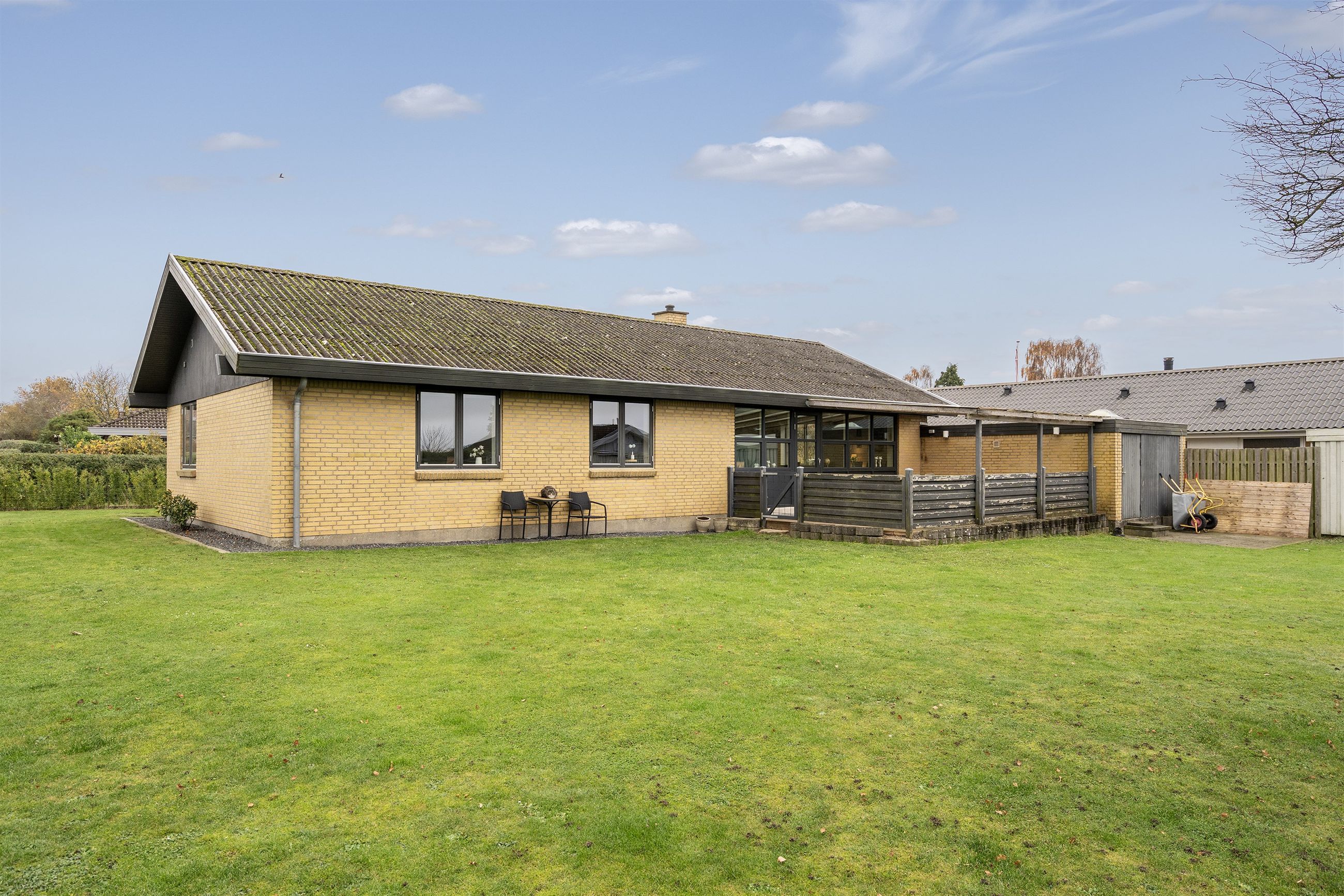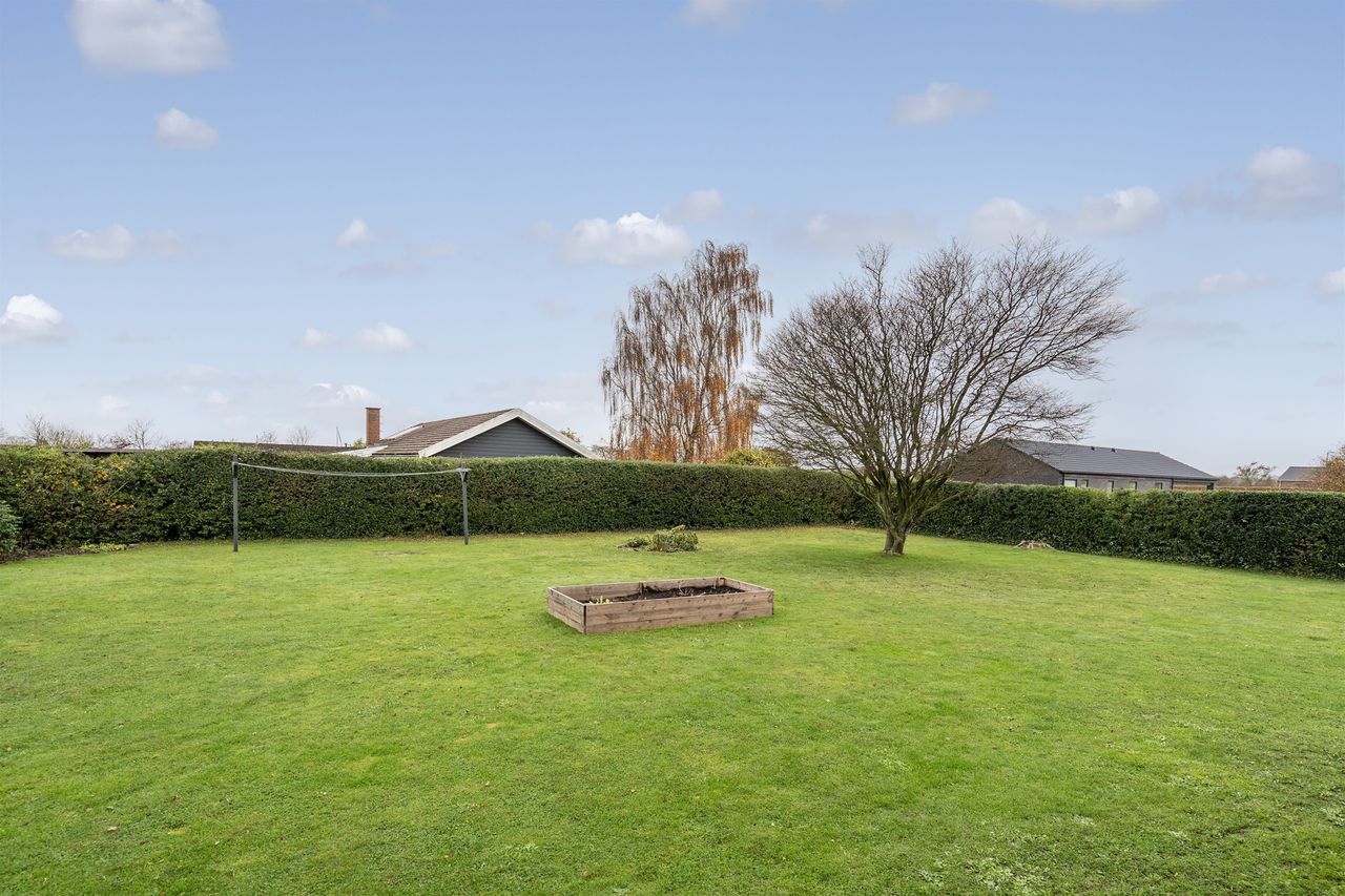 Villaen ligger på en skøn grund med en nem og velholdt have, hvor både børn og voksne kan nyde udelivet. Den overdækkede terrasse skaber et hyggeligt uderum, som kan bruges det meste af året. Derudover finder du et praktisk værksted/udhus – perfekt til gør-det-selv-entusiasten eller opbevaring af haveredskaber.