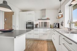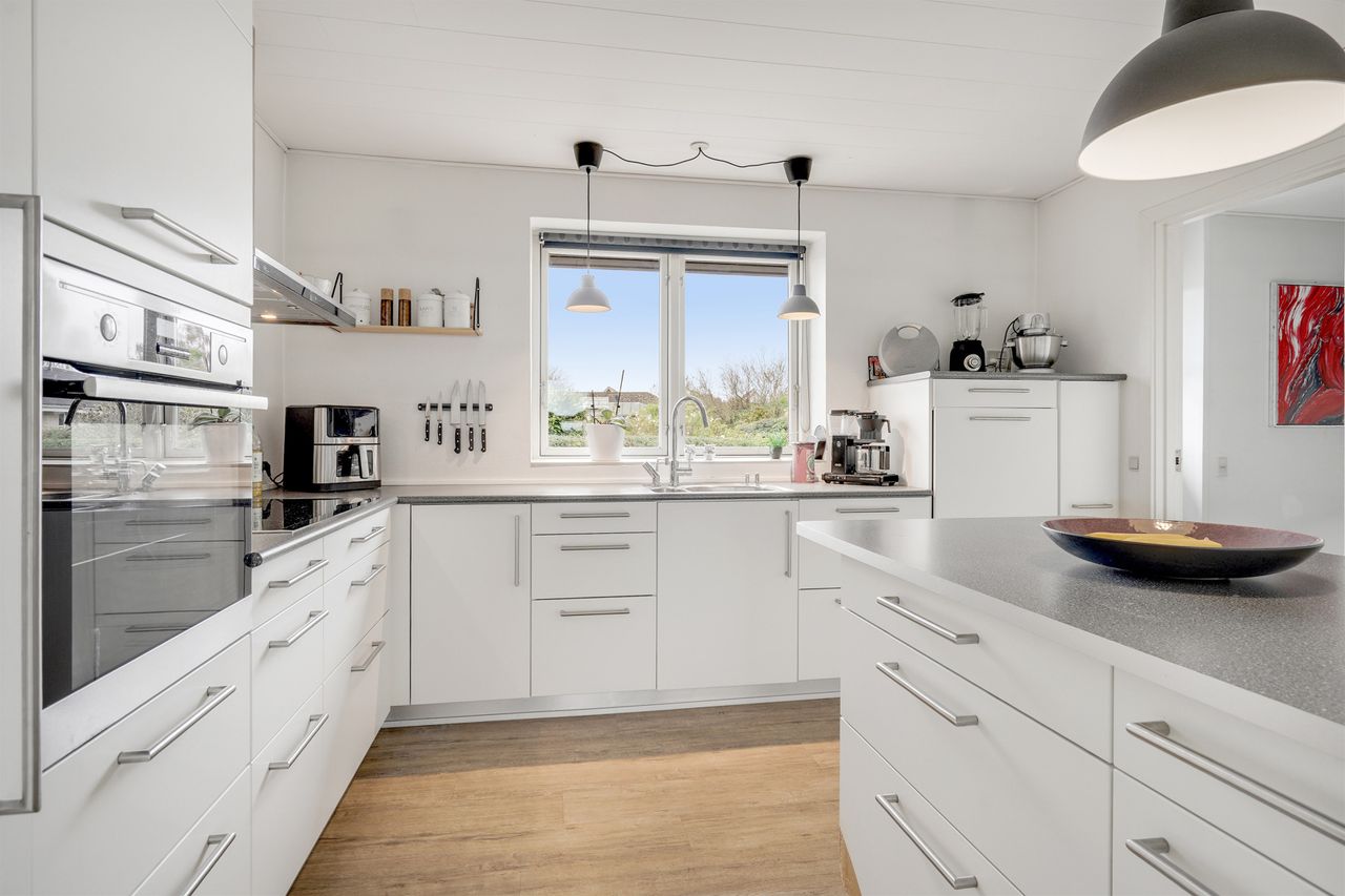 Fra stuen er der adgang til det lyse og moderne køkken, som præsenterer sig med gode løsninger og en stilren indretning.