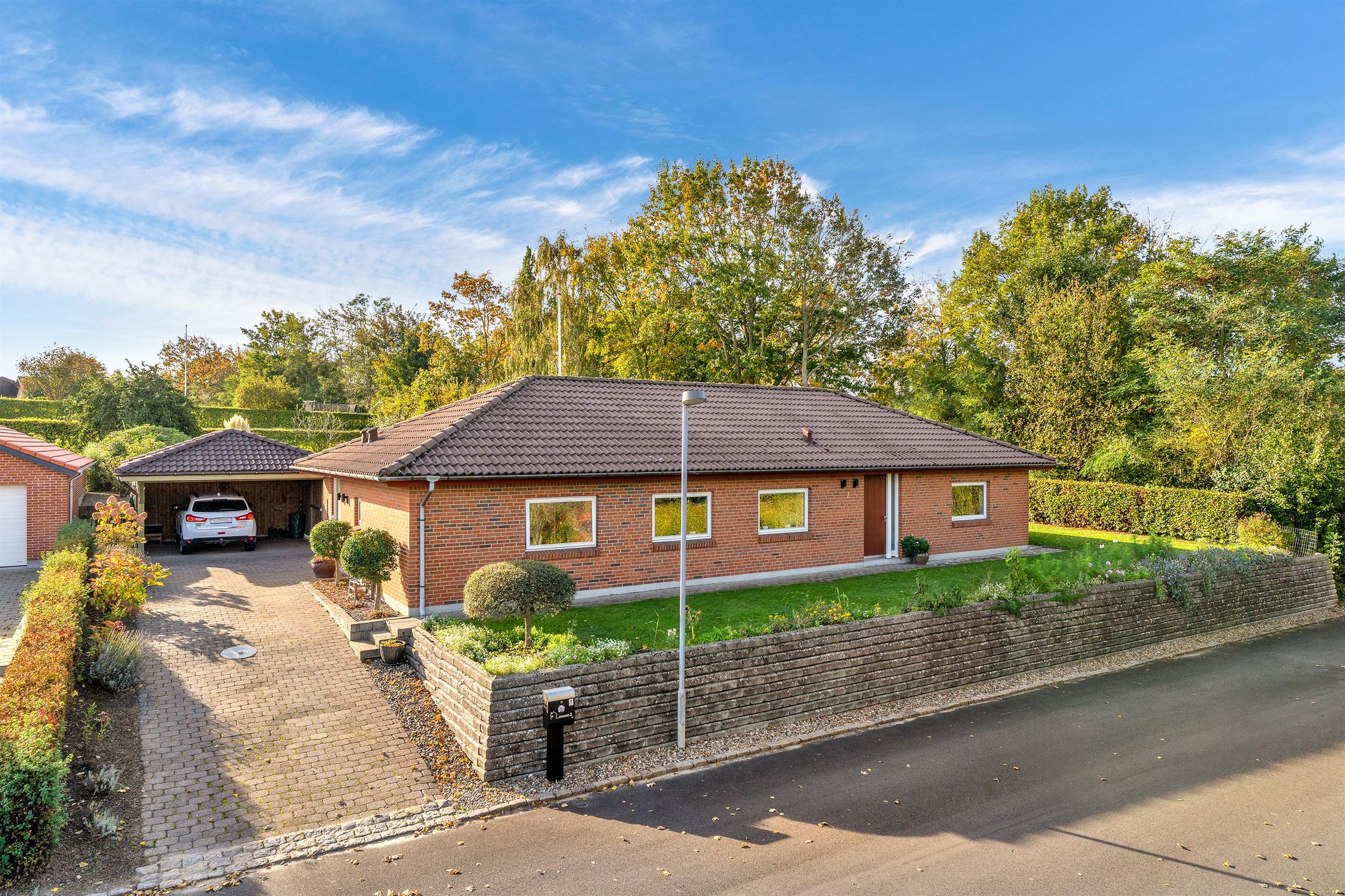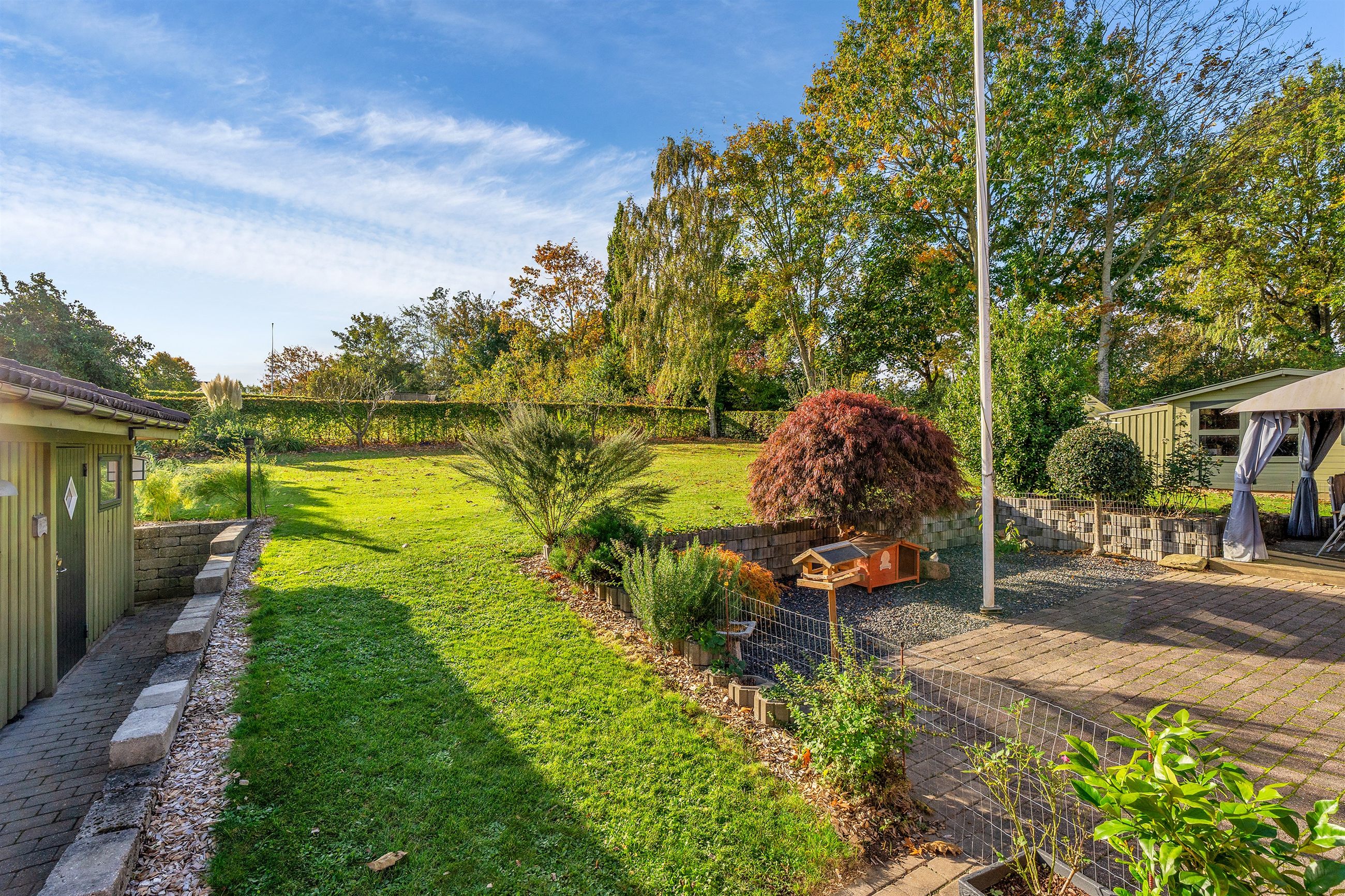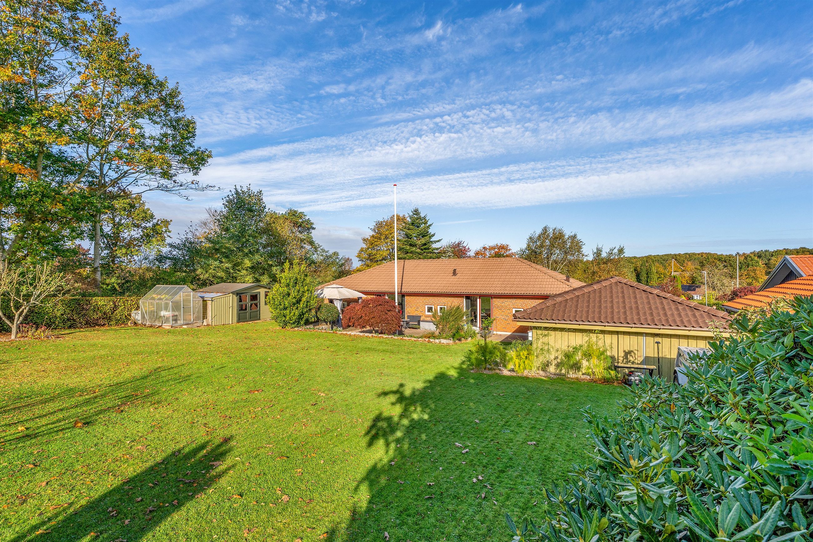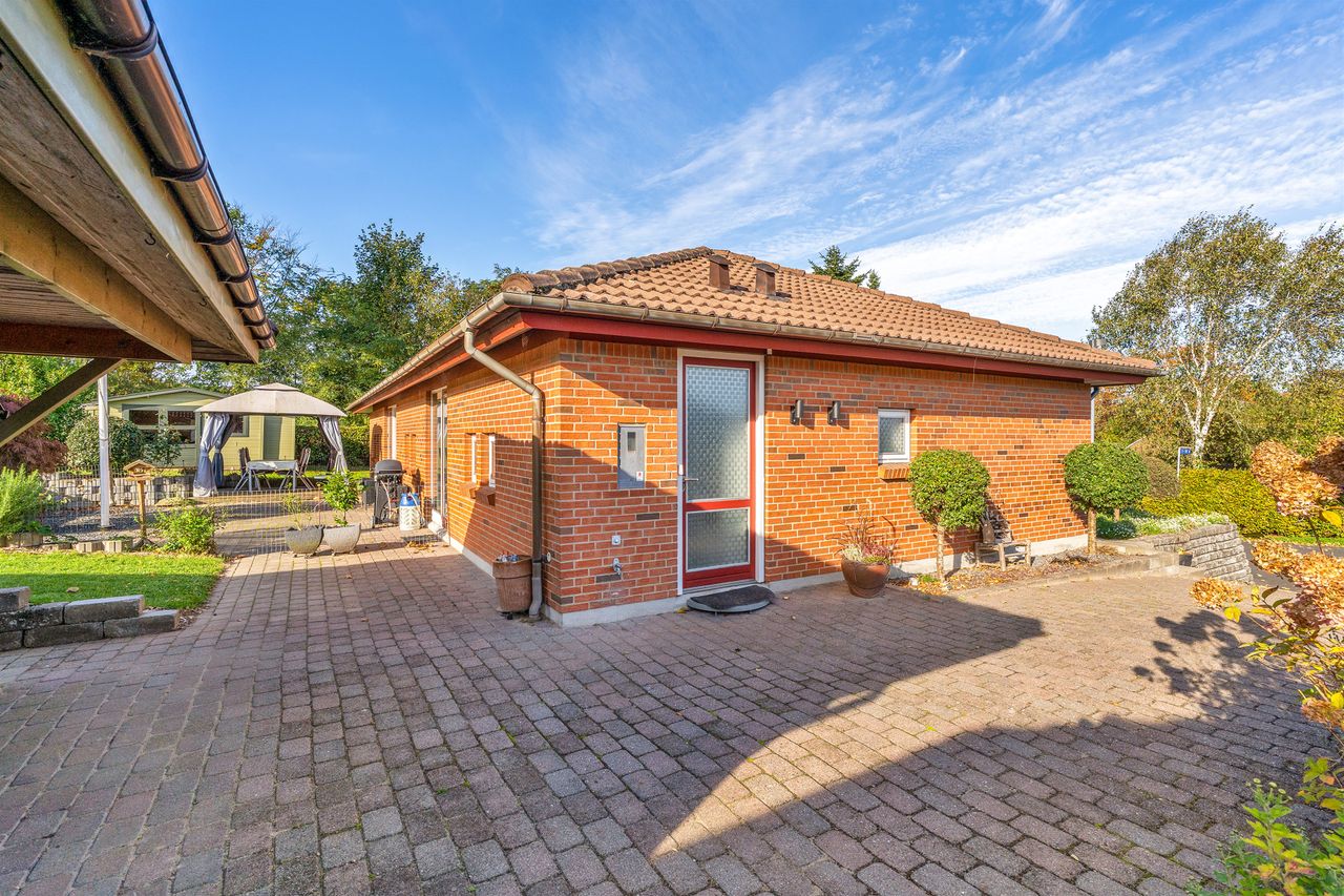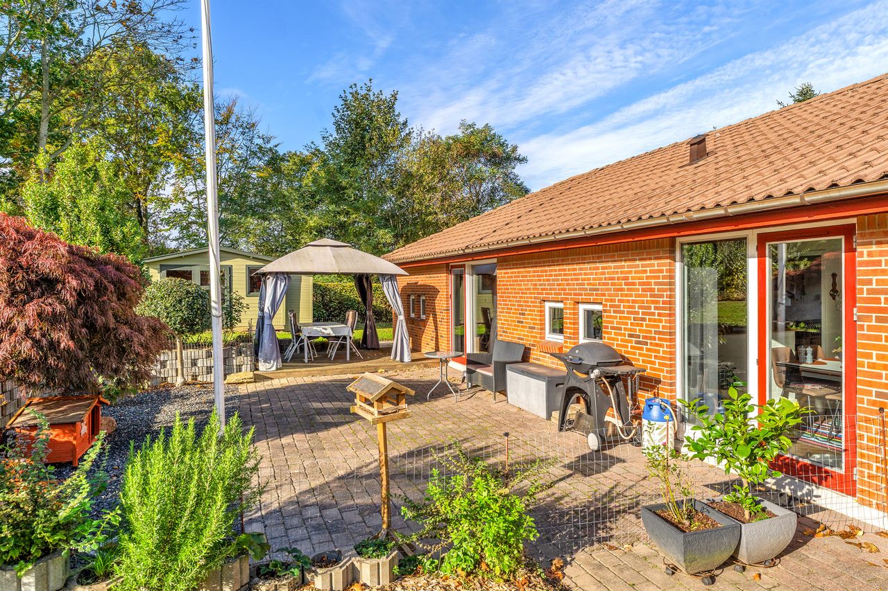 Udendørs venter en parklignende have, der trods sit grønne og indbydende udtryk er nem at vedligeholde. Den sydvendte terrasse indbyder til mange solrige timer, grillhygge og afslapning i private omgivelser.