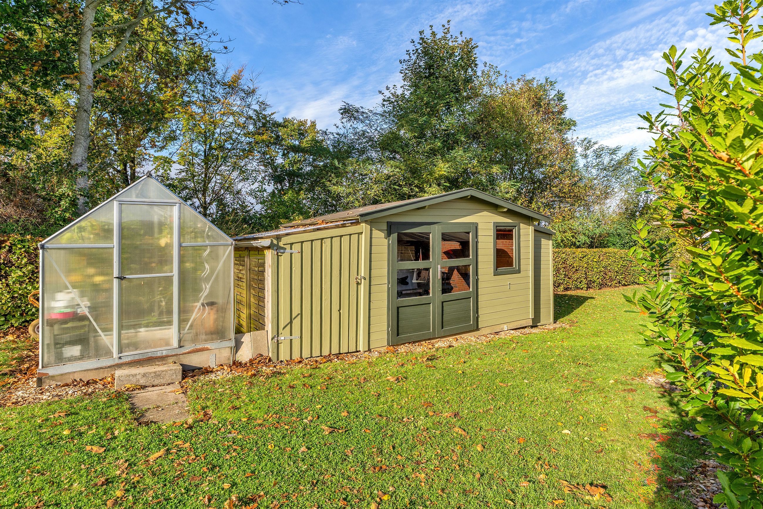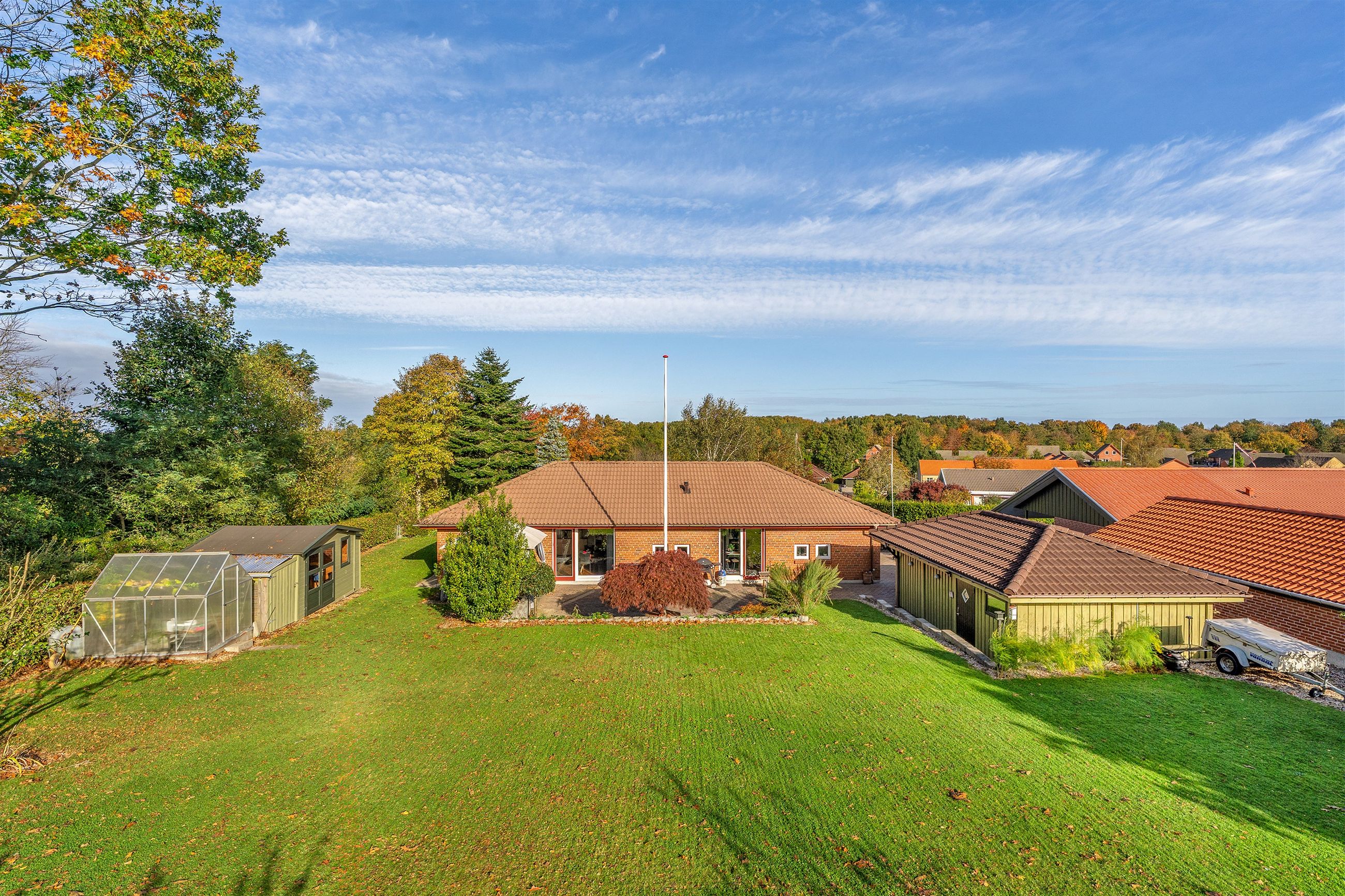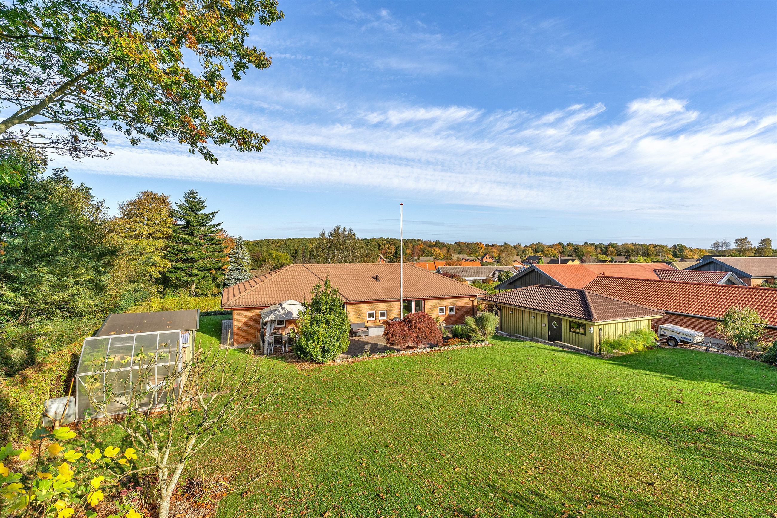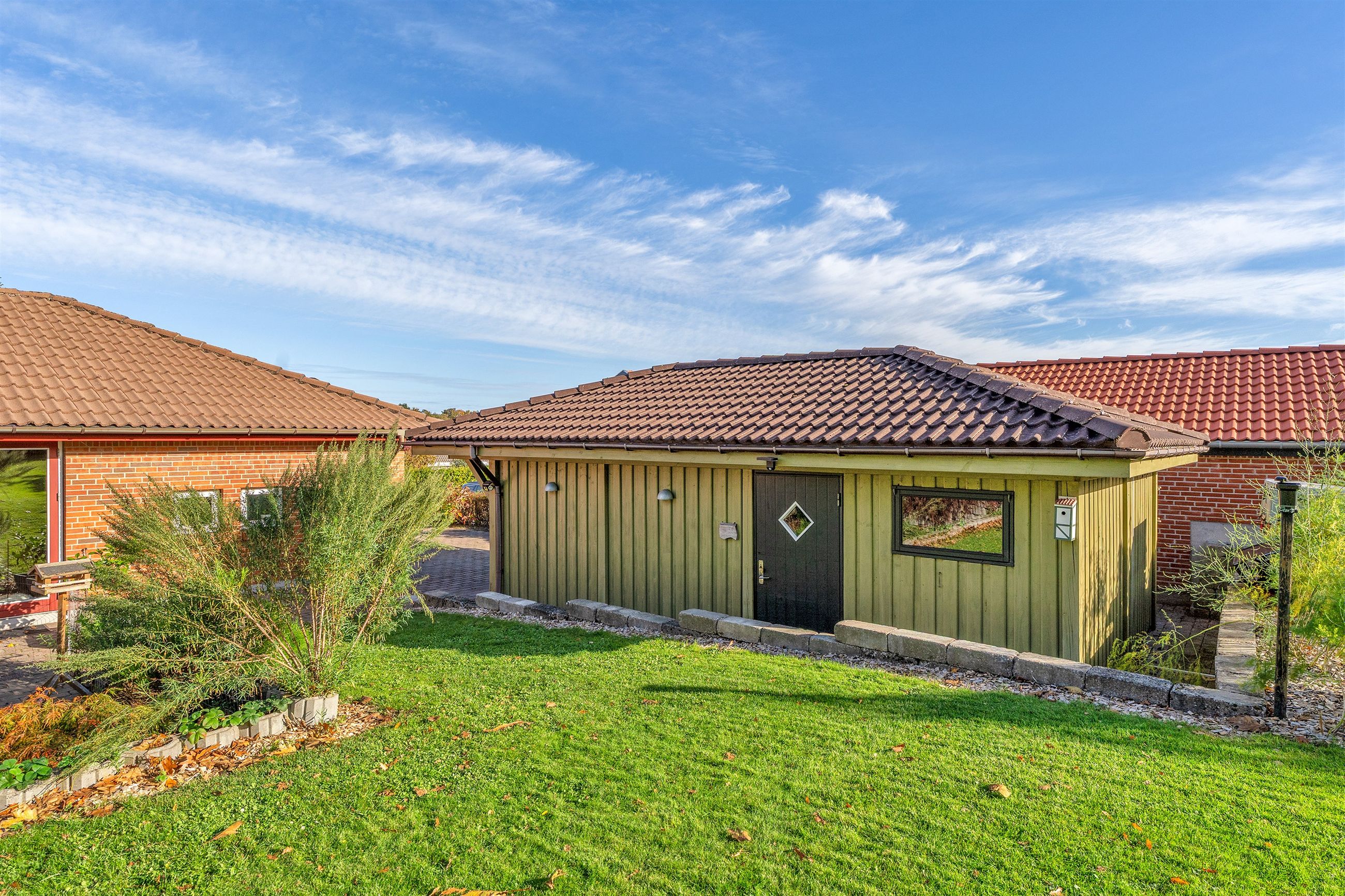 Udendørs venter en parklignende have, der trods sit grønne og indbydende udtryk er nem at vedligeholde. Den sydvendte terrasse indbyder til mange solrige timer, grillhygge og afslapning i private omgivelser.