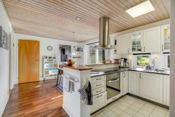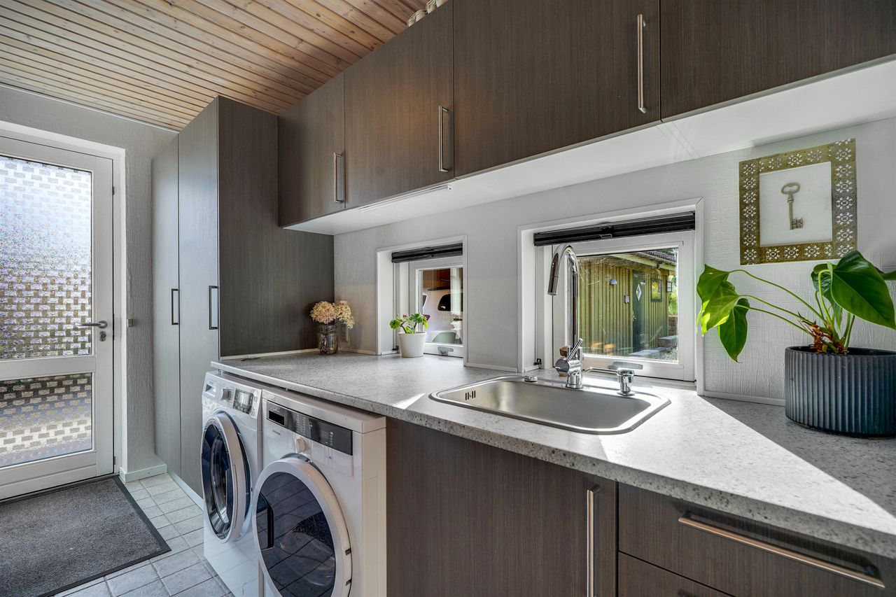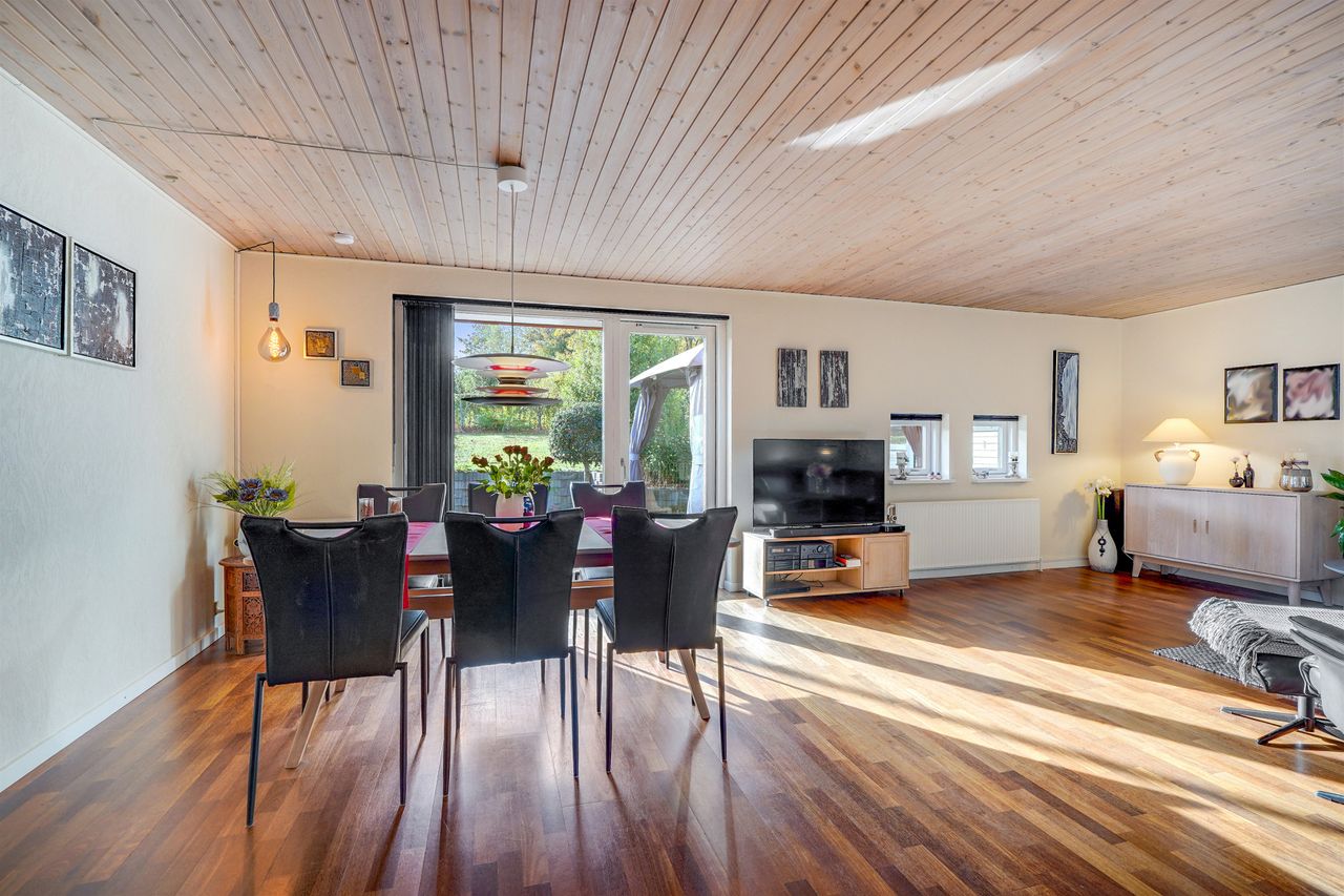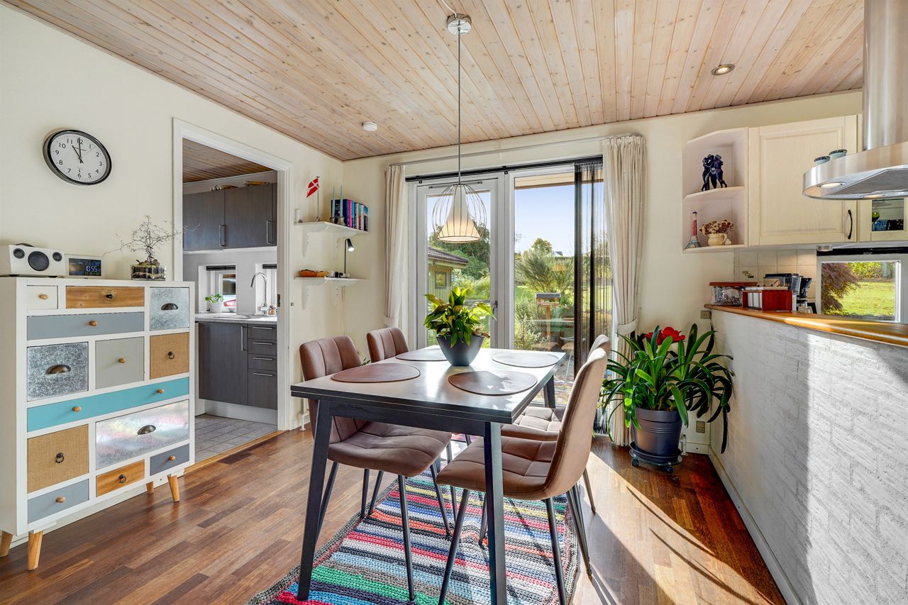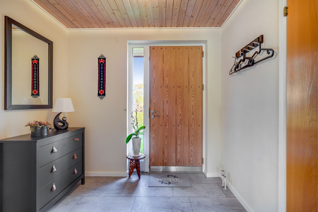 Indenfor mødes I af et indbydende bryggers, som leder videre til boligens naturlige samlingspunkt – det åbne og lyse køkken-alrum. Her er der god plads til både madlavning og samvær, og køkkenet ligger i naturlig forbindelse med den store, lyse stue, hvor vinduespartierne sikrer et behageligt lysindfald. I størstedelen af huset er der lagt et smukt og slidstærkt Merbau-trægulv, som tilfører boligen varme og kvalitet.