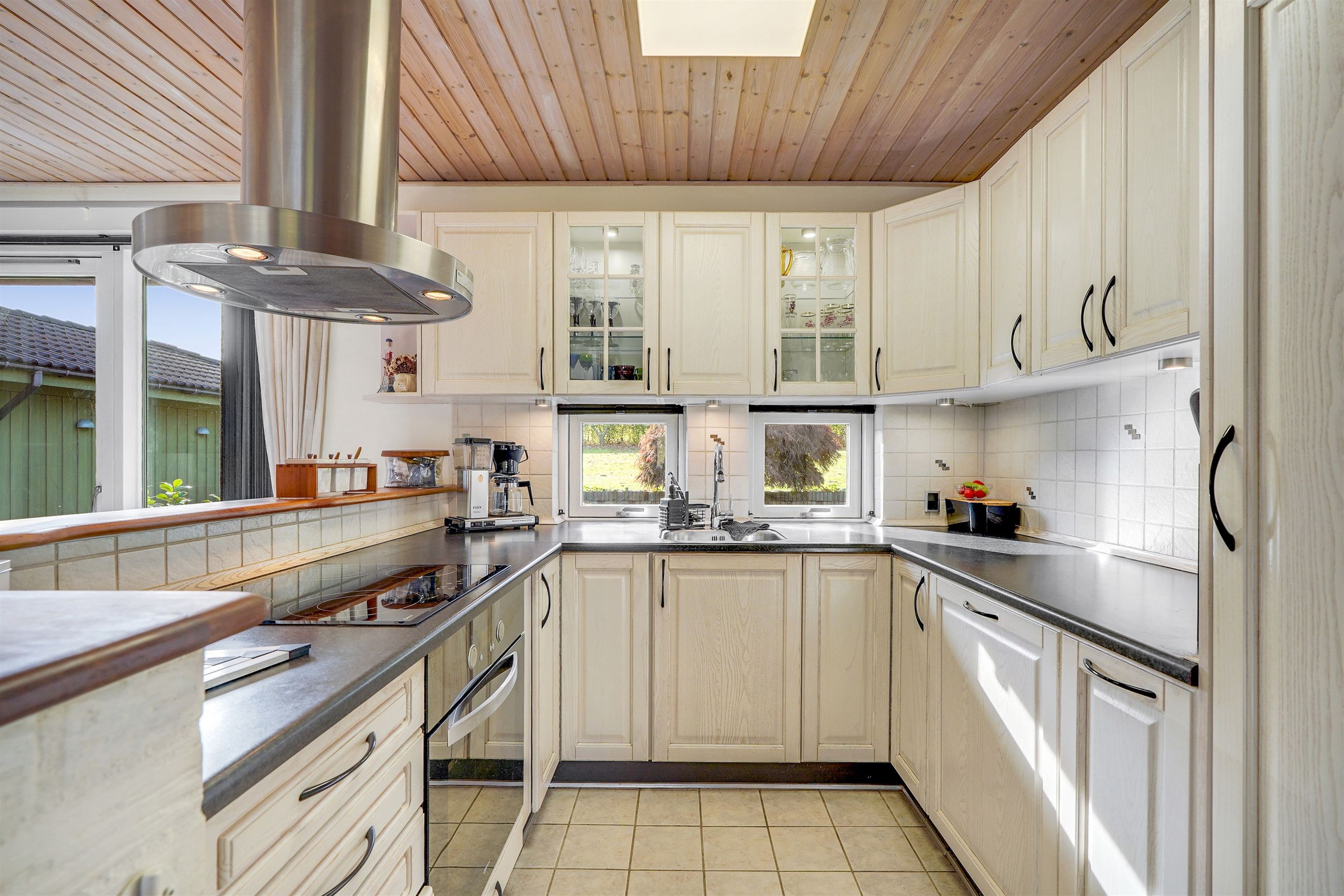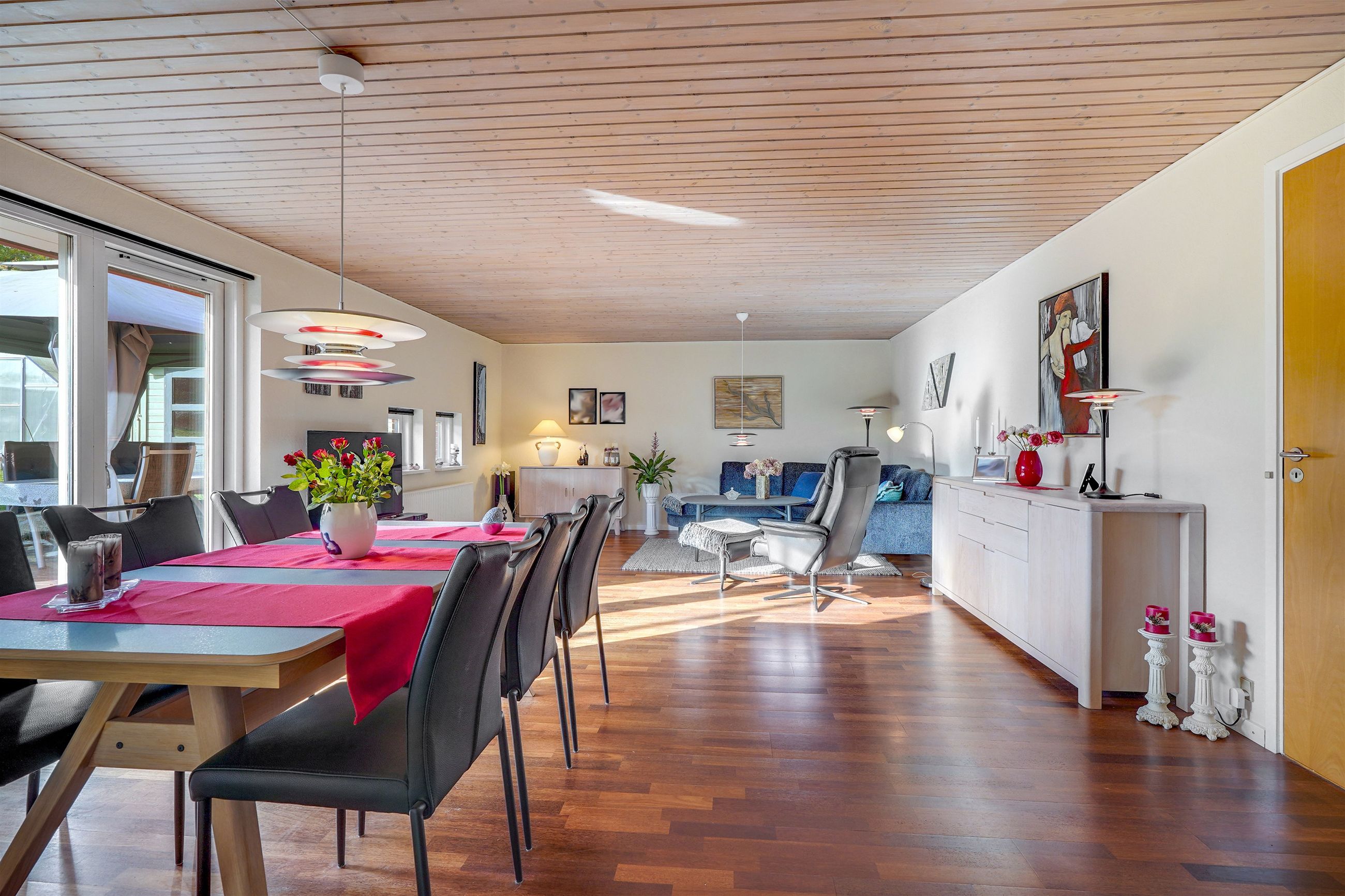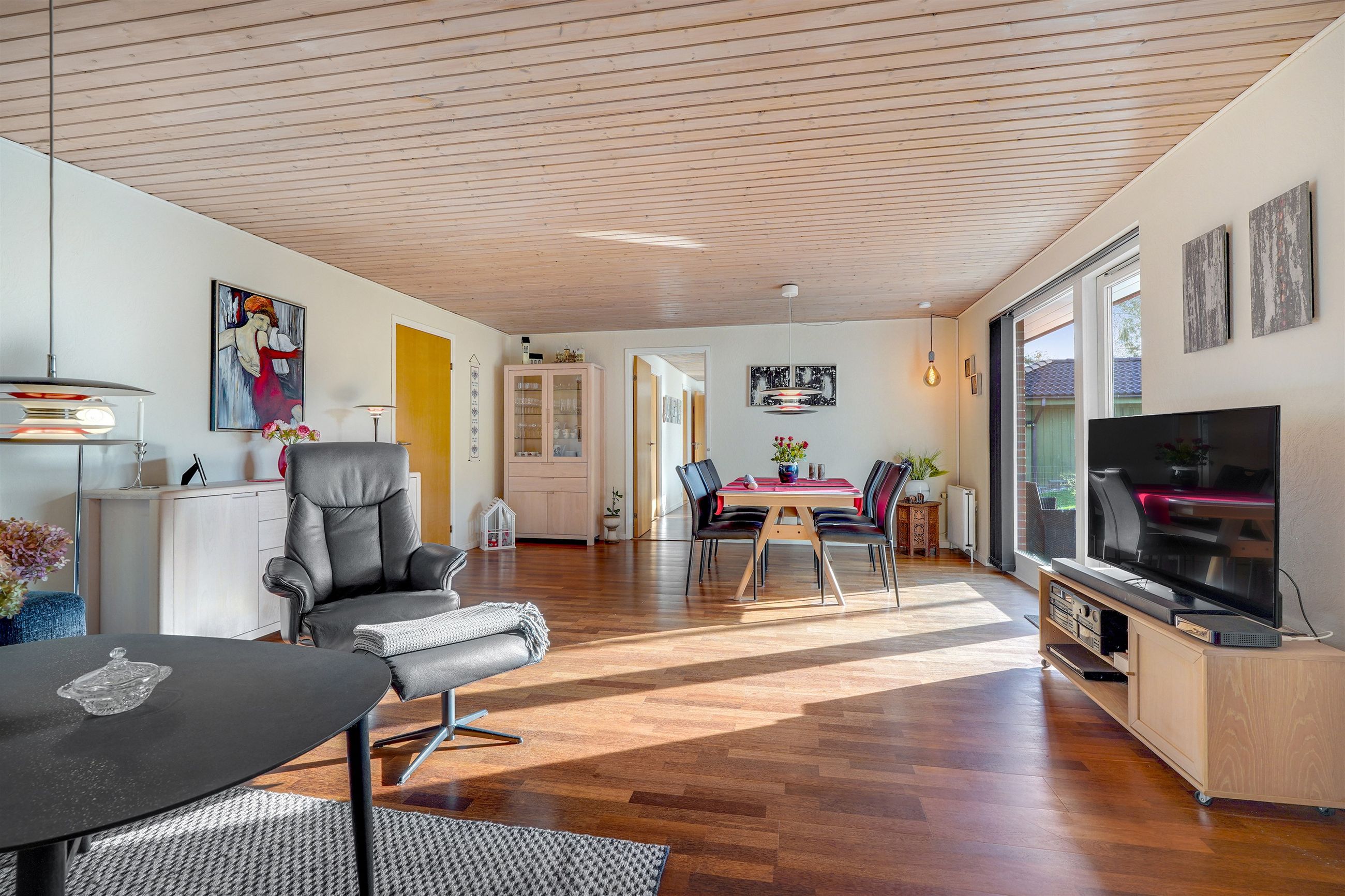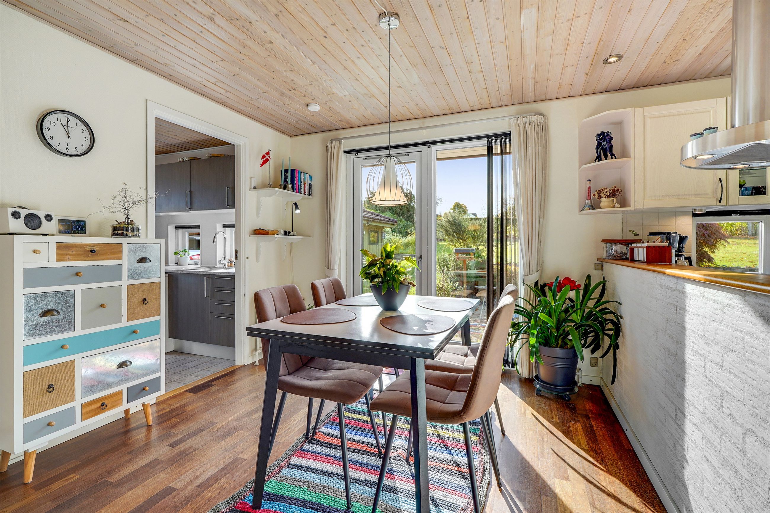 Indenfor mødes I af et indbydende bryggers, som leder videre til boligens naturlige samlingspunkt – det åbne og lyse køkken-alrum. Her er der god plads til både madlavning og samvær, og køkkenet ligger i naturlig forbindelse med den store, lyse stue, hvor vinduespartierne sikrer et behageligt lysindfald. I størstedelen af huset er der lagt et smukt og slidstærkt Merbau-trægulv, som tilfører boligen varme og kvalitet.