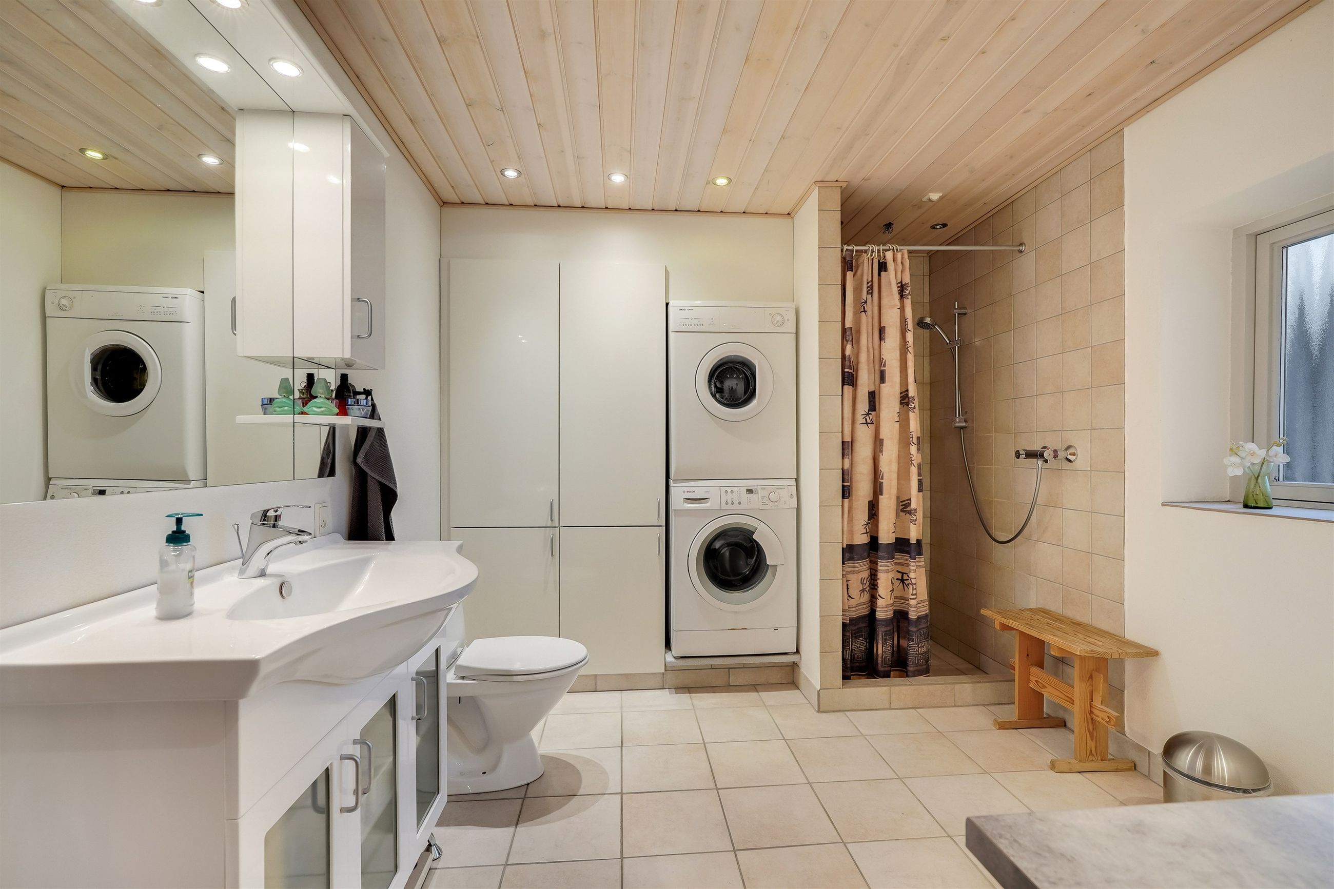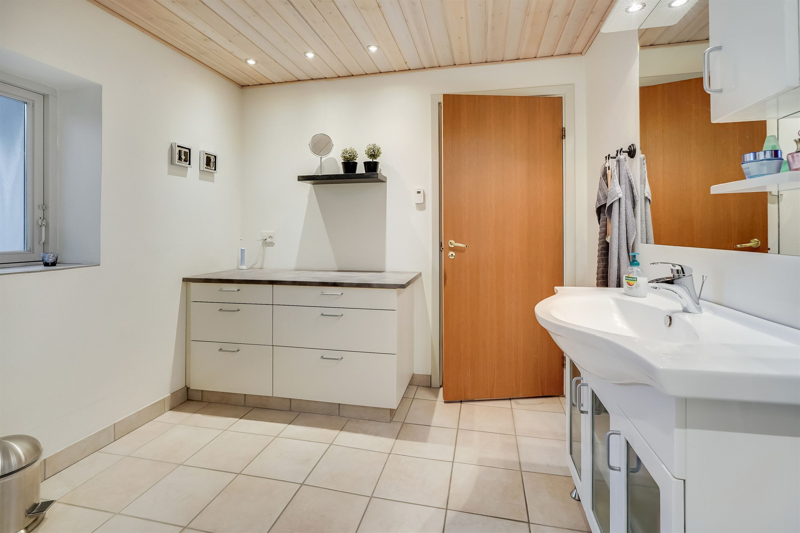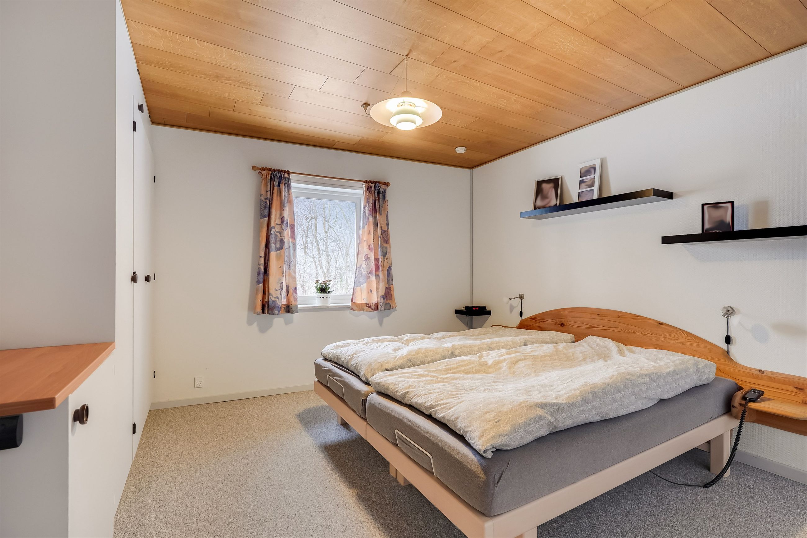 Fra både køkken og entré er der adgang til en fordelergang, der fører til et rummeligt soveværelse med indbyggede skabe, et lyst badeværelse med plads til vaskesøjle, samt et praktisk bryggers med god bordplads og masser af skabsplads.