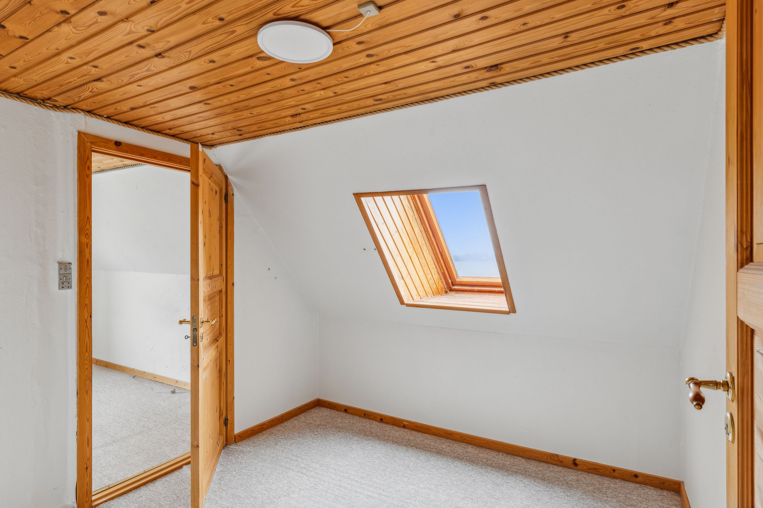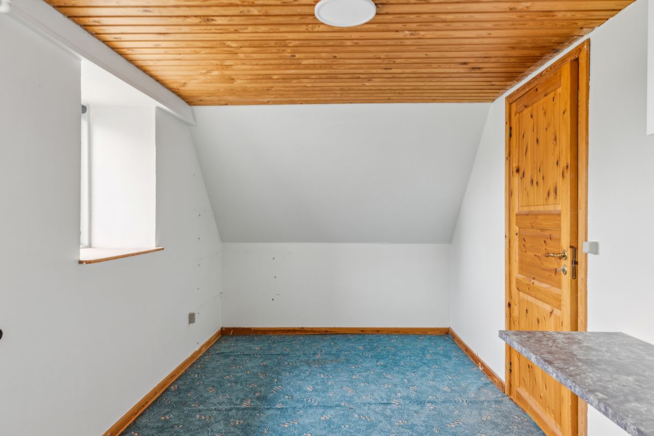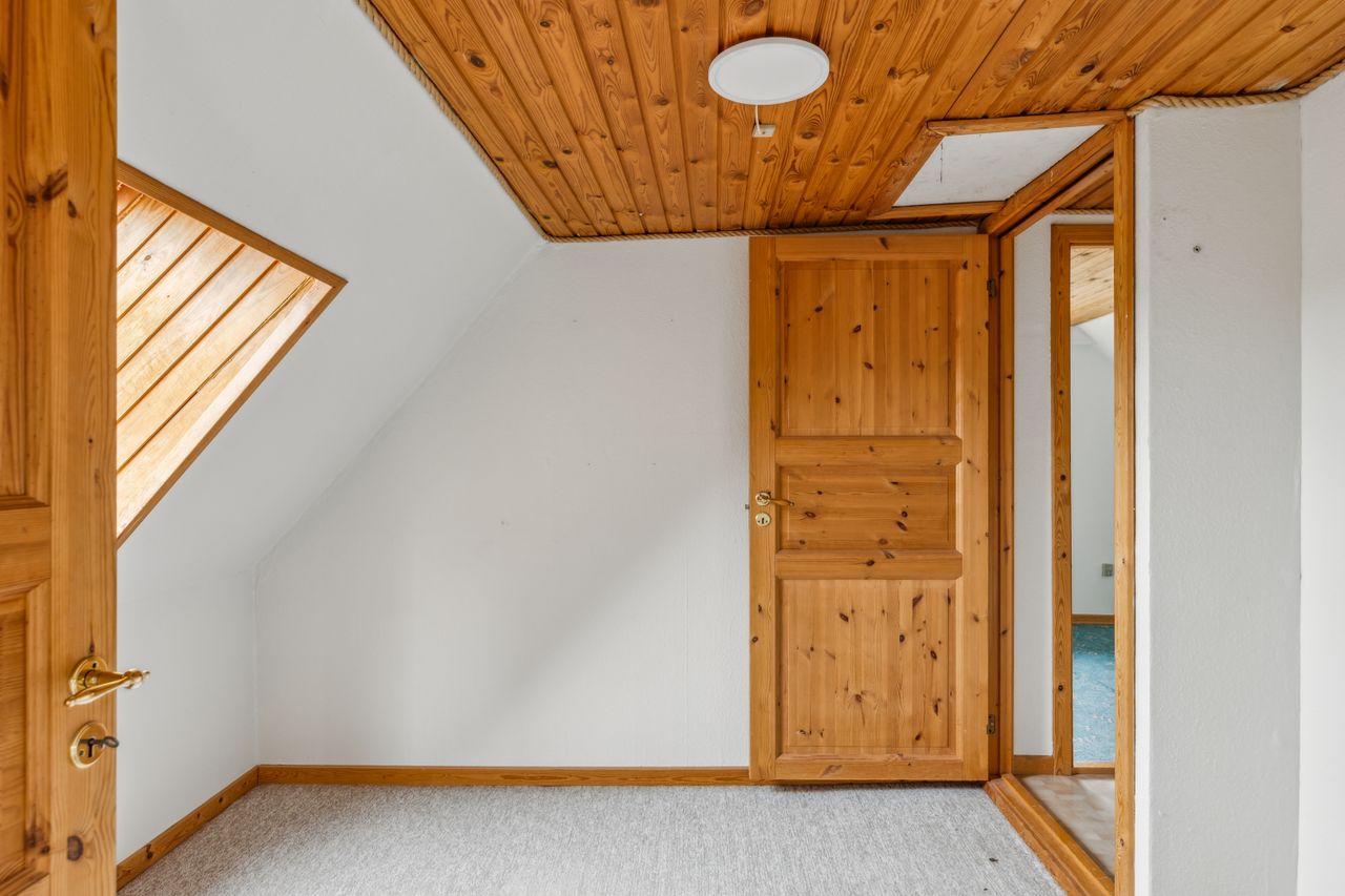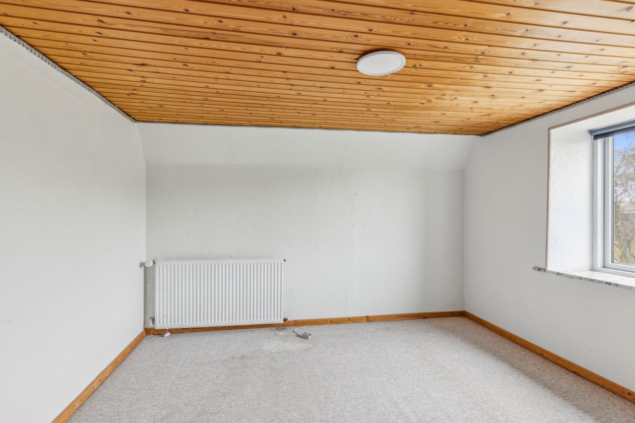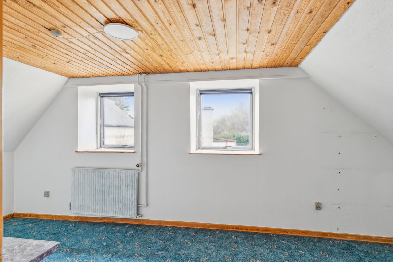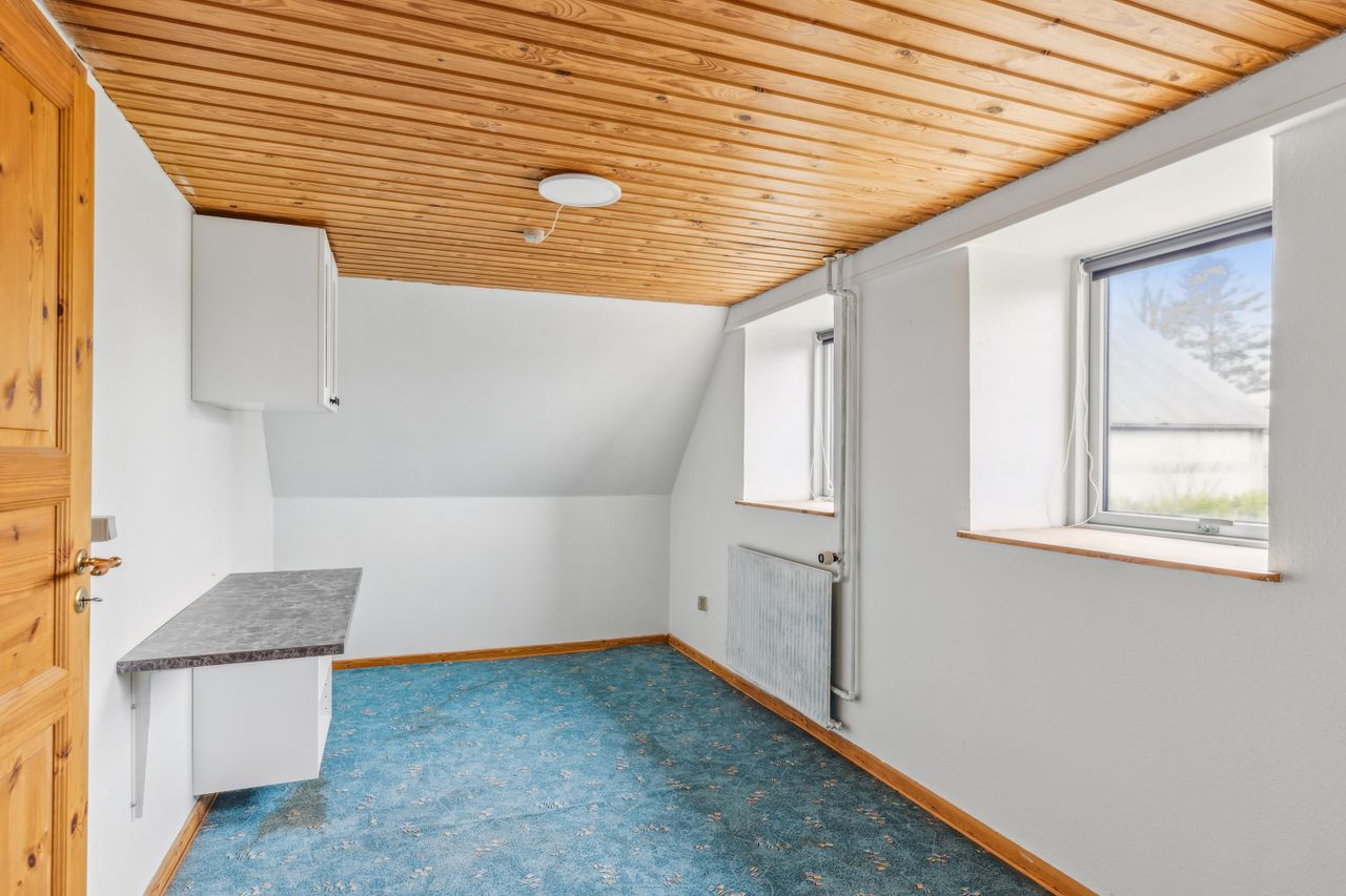Fra alrummet fører trappen op til førstesalen, hvor en fordelergang giver adgang til to gode værelser. Her er også mulighed for at indrette et hyggeligt hjemmekontor eller udnytte pladsen på kreativ vis.