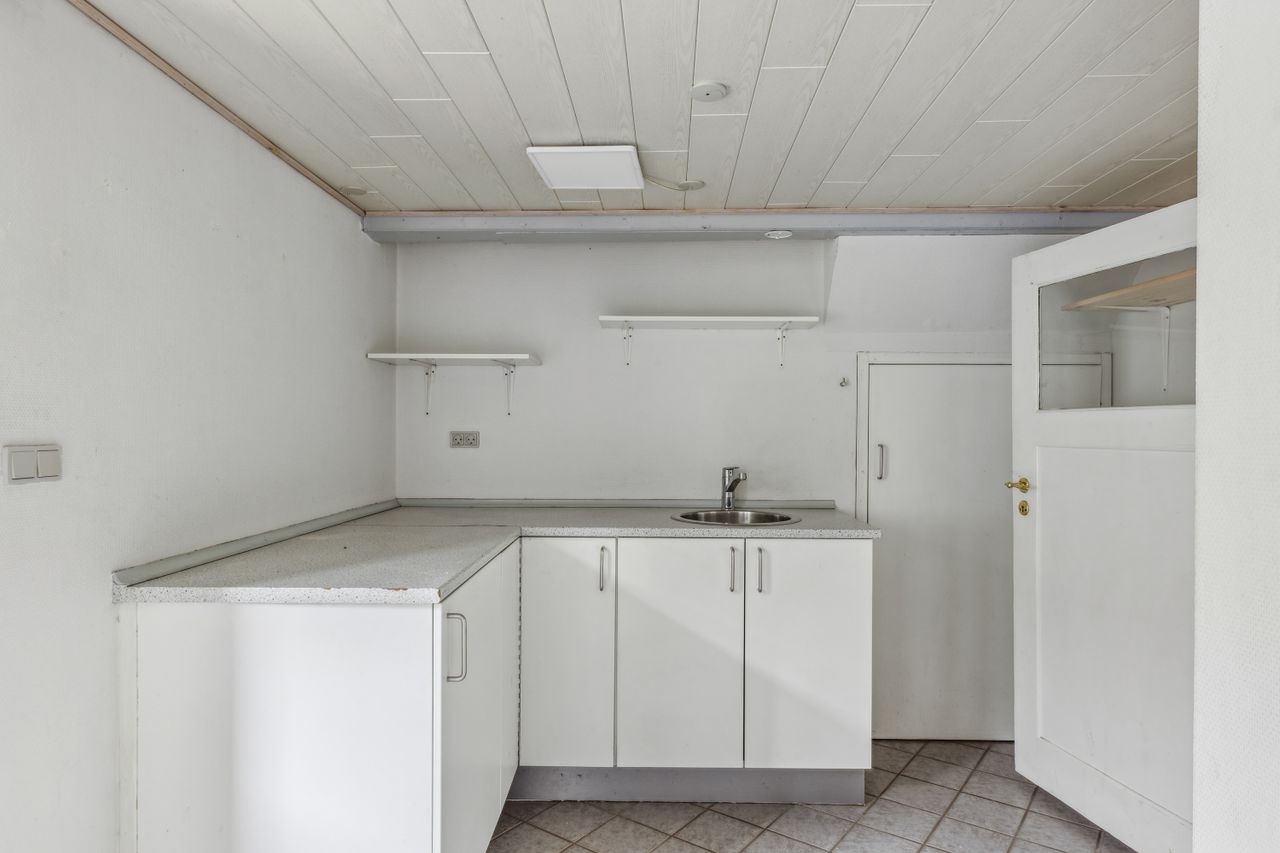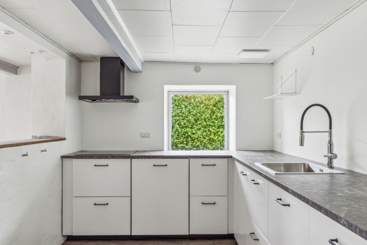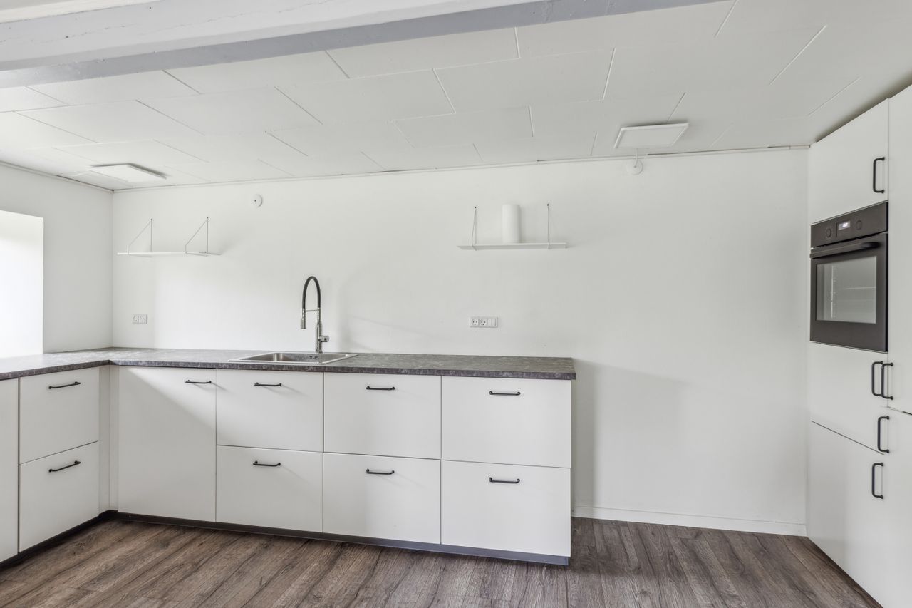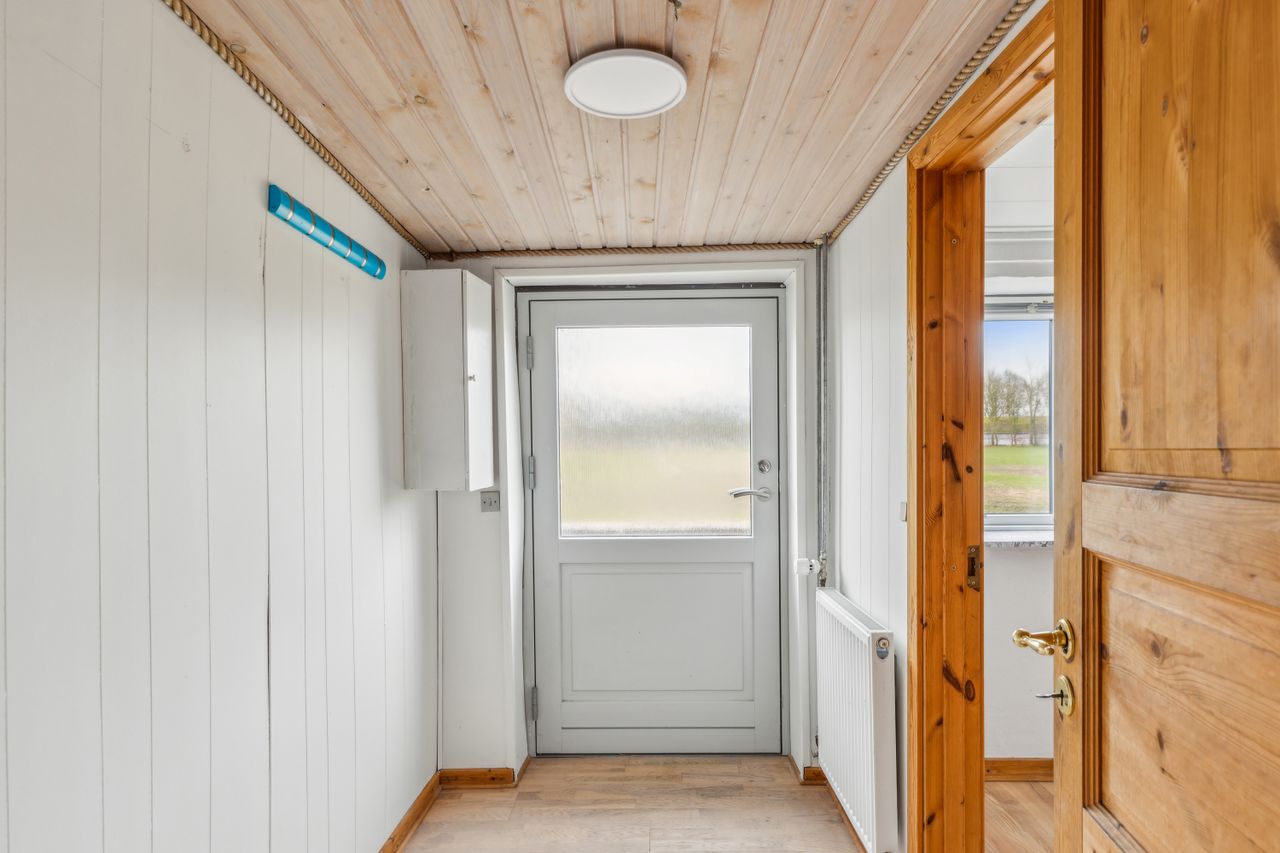 Indenfor mødes du af en entré, der fører videre til husets badeværelse samt det lyse og rummelige alrum. Alrummet er hjertet i hjemmet, hvor der er god plads til både spise- og opholdsområde. Det flotte, nyere køkken ligger i åben forbindelse med alrummet og fordeles elegant af en halvmur, hvilket skaber en indbydende atmosfære og gør det nemt at være sammen, mens maden tilberedes. Fra køkkenet er der adgang til et rummeligt bryggers med plads til vaskefaciliteter og egen indgang udefra.