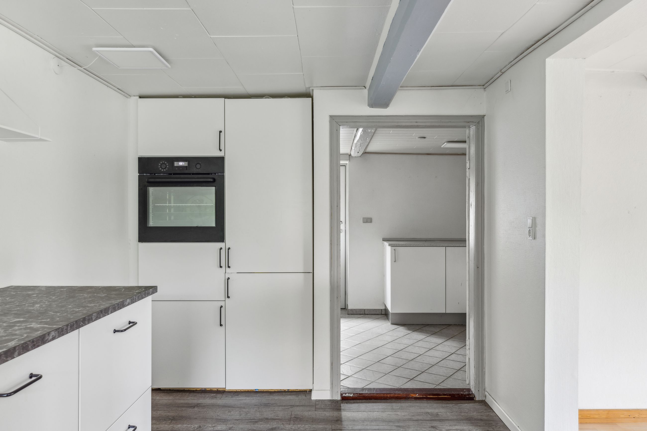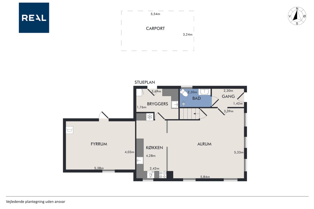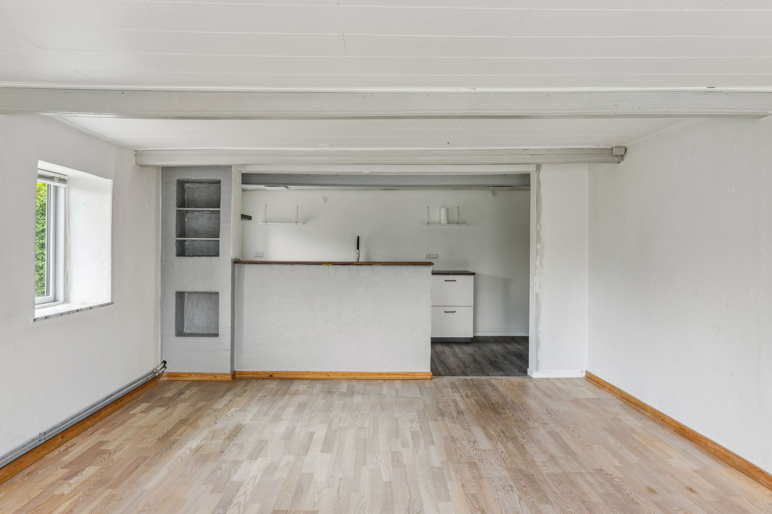 Indenfor mødes du af en entré, der fører videre til husets badeværelse samt det lyse og rummelige alrum. Alrummet er hjertet i hjemmet, hvor der er god plads til både spise- og opholdsområde. Det flotte, nyere køkken ligger i åben forbindelse med alrummet og fordeles elegant af en halvmur, hvilket skaber en indbydende atmosfære og gør det nemt at være sammen, mens maden tilberedes. Fra køkkenet er der adgang til et rummeligt bryggers med plads til vaskefaciliteter og egen indgang udefra.