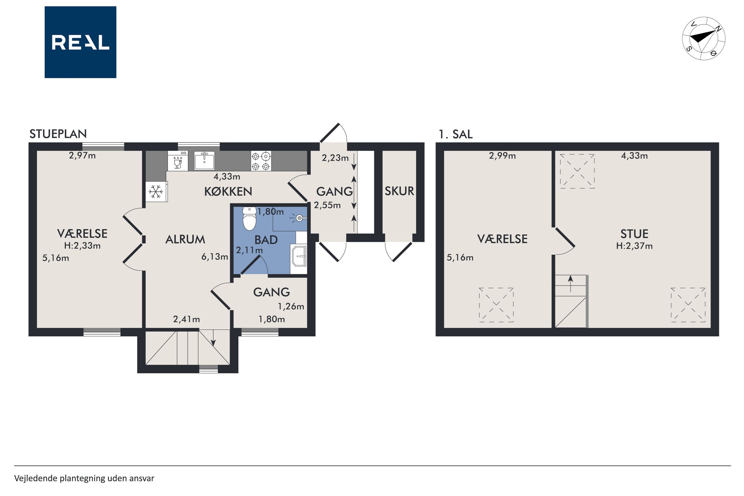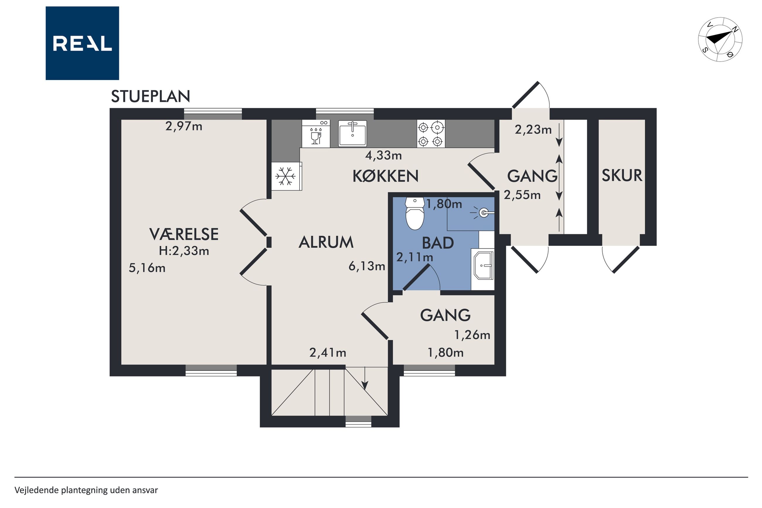 Boligens stueplan byder på en indbydende entré med adgang til ekstra opbevaringsplads. Herfra ledes man videre til det pæne og funktionelle køkken med gode arbejdsflader og opbevaringsmuligheder. Køkkenet ligger i naturlig forbindelse med alrummet, der fungerer som boligens samlingspunkt med plads til spiseafdeling og ophold. Stueplan rummer desuden et regulært værelse, som med lethed kan opdeles i to værelser, eksempelvis til børneværelse, kontor eller gæsteværelse, samt et badeværelse.