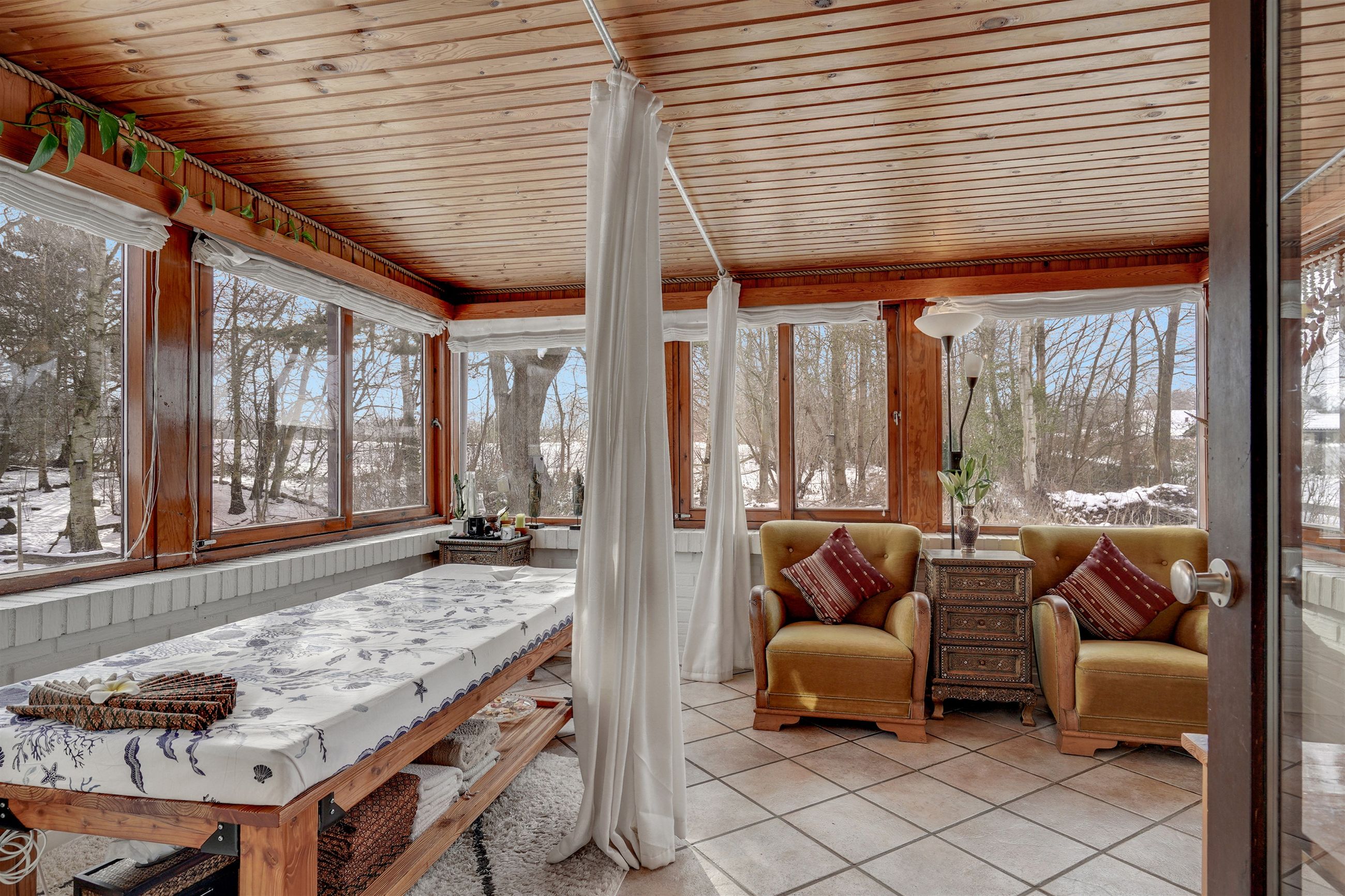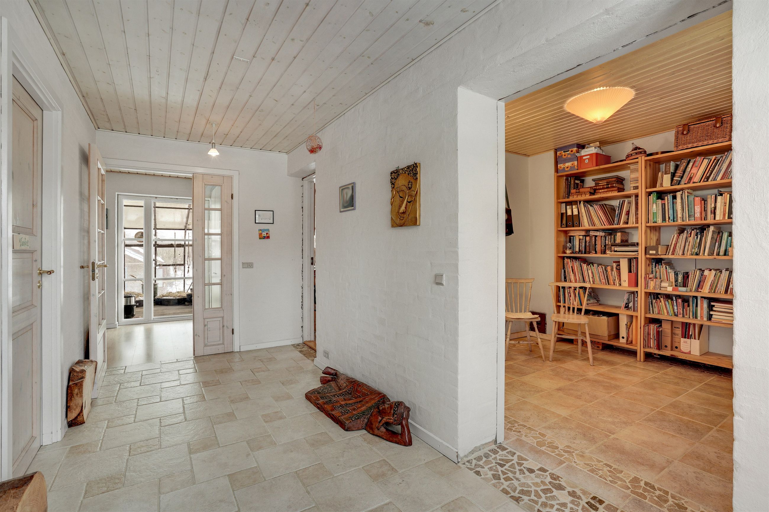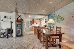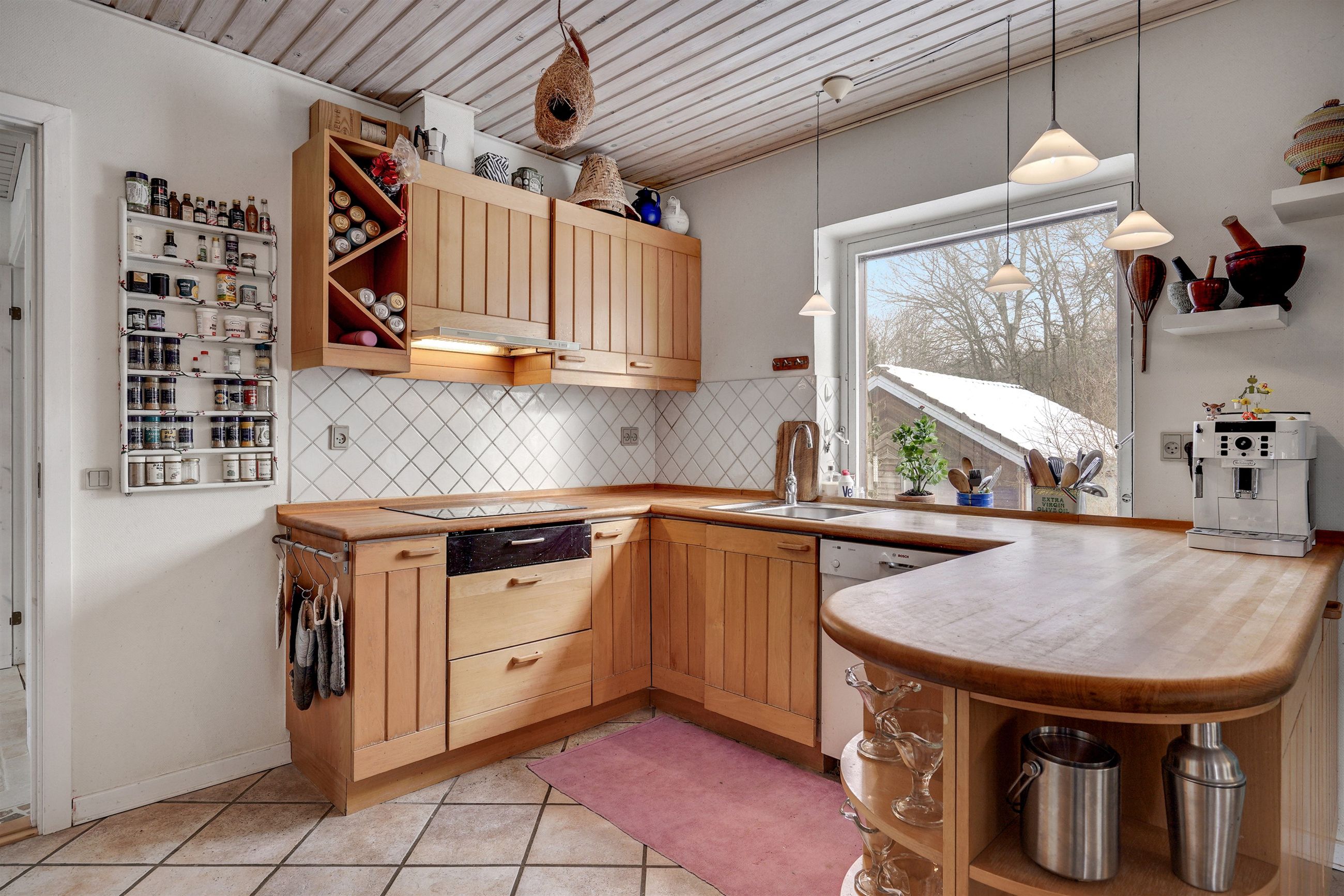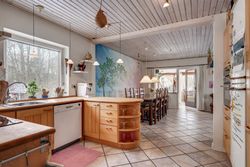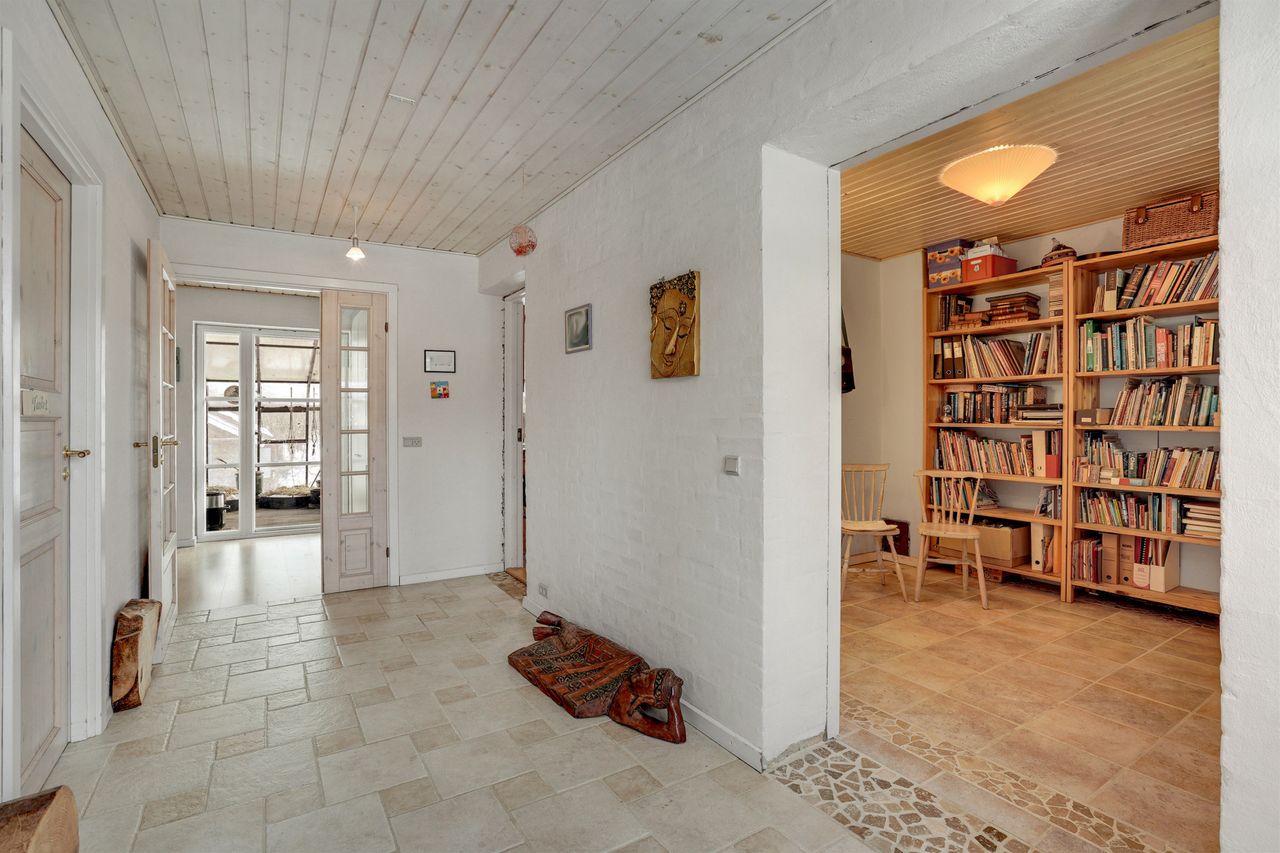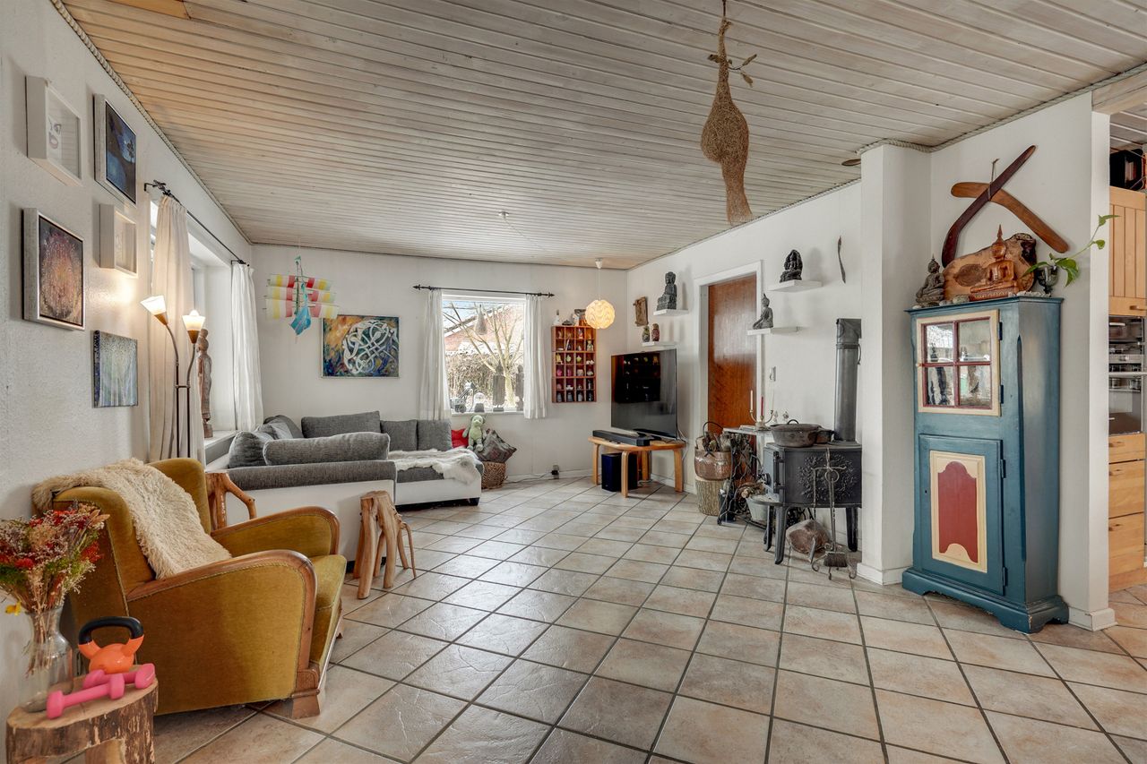 Husets hjerte er det store, åbne opholdsmiljø med køkken, alrum og stue i sammenhæng. Her er der god plads til både hverdagsliv og gæster, og brændeovnen skaber ekstra hygge på de kølige aftener. Fra alrummet er der direkte udgang til overdækket terrasse og videre til haven – en skøn forlængelse af opholdsrummet i sommerhalvåret.