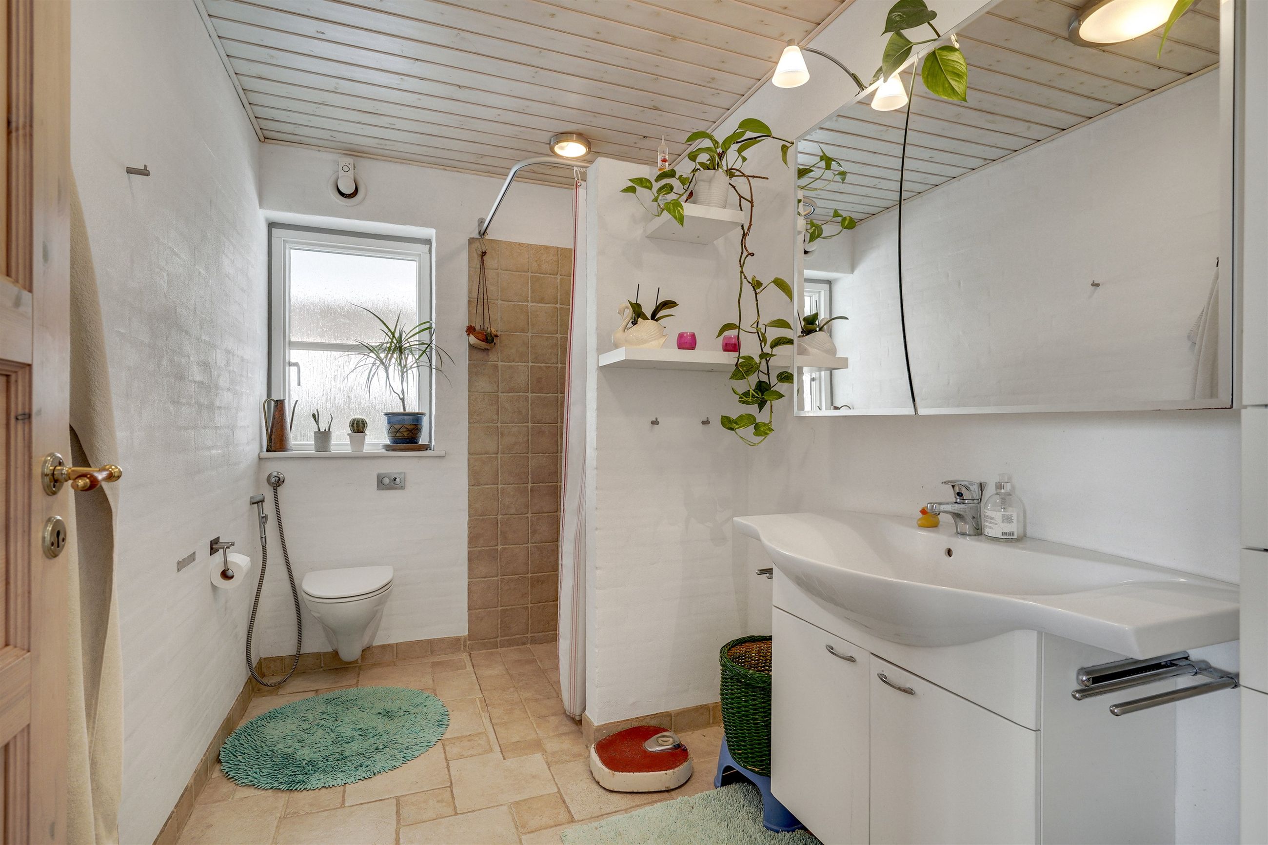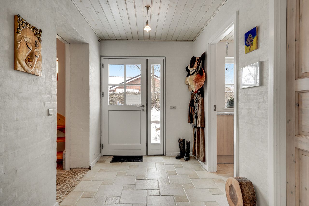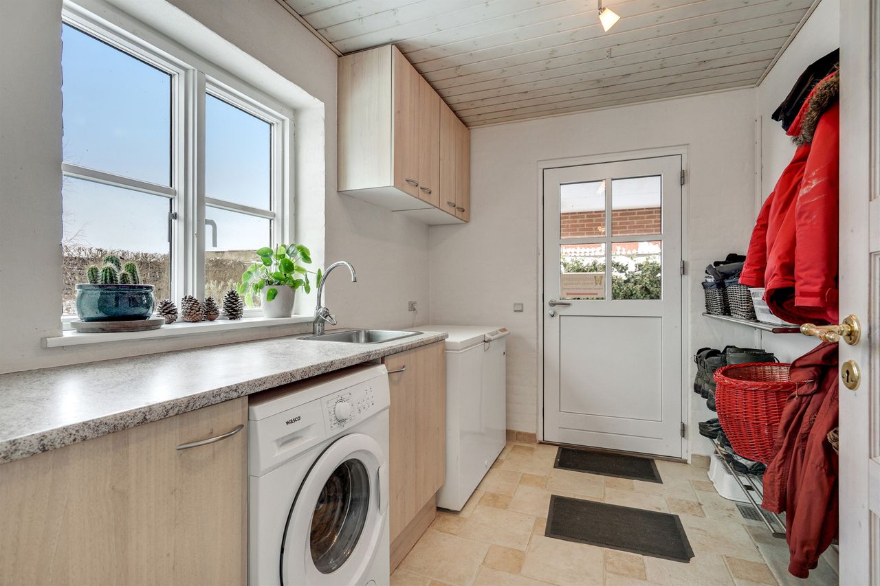 I stueplan træder du ind i en rummelig entré med adgang til bryggers og badeværelse. Bryggerset er praktisk indrettet med egen indgang fra den integrerede carport – så du kan gå tørskoet ind med indkøb og hverdagens gøremål.