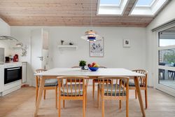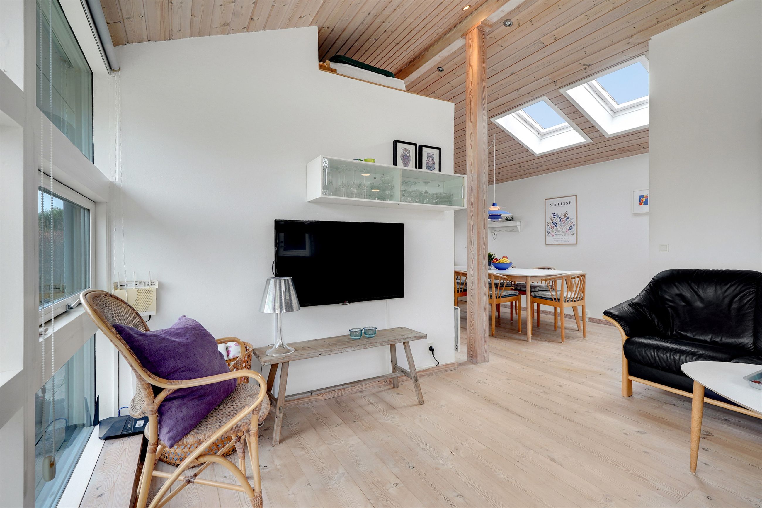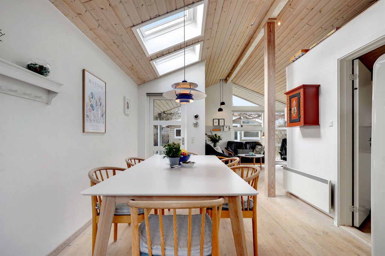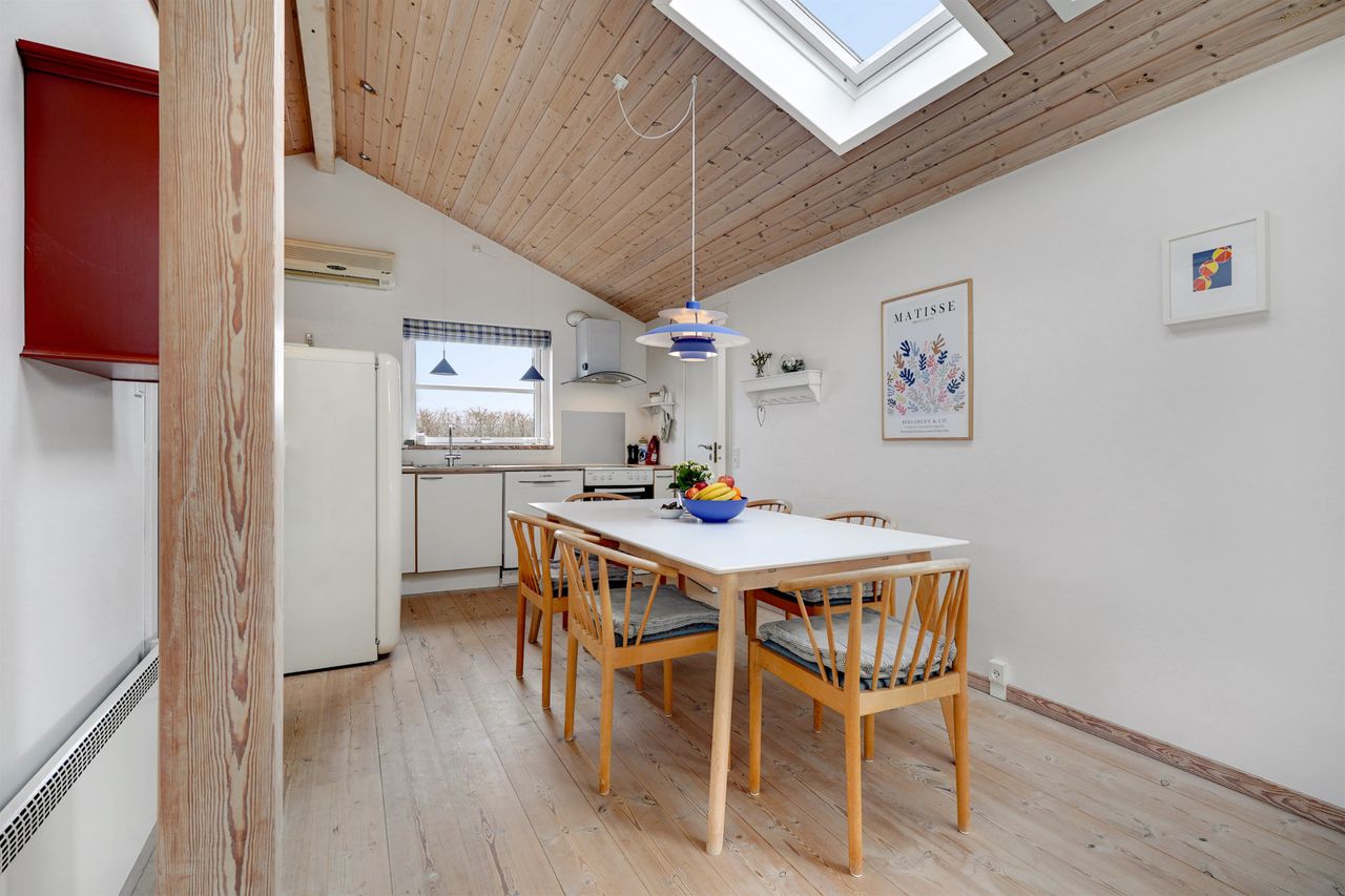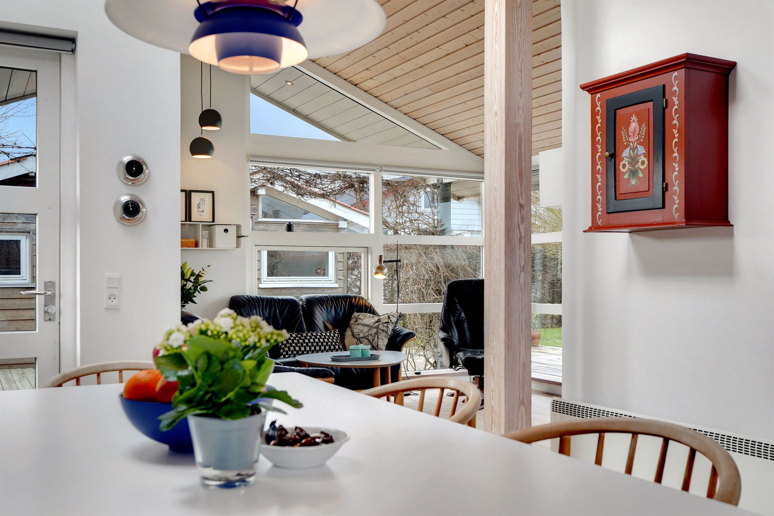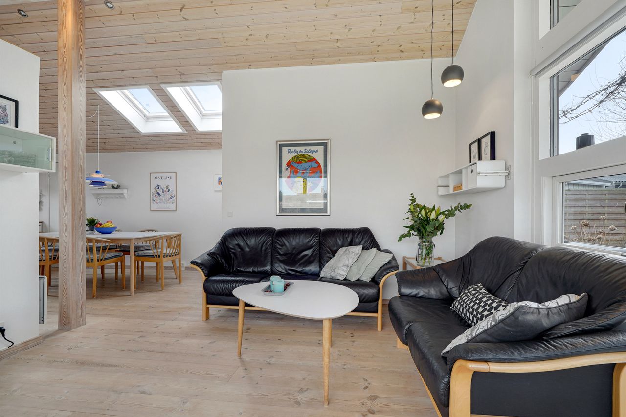 Hjertet i huset er det skønne opholdsrum, hvor der er plads til både nærvær, latter og brætspil omkring bordet. Ovenlysvinduerne lader dagslyset strømme ind og skaber en let og luftig stemning, der inviterer til afslapning i sofaen med en god bog. Det pæne køkken ligger i åben forbindelse og indbyder til fælles madlavning – hvad enten menuen står på langsomt simrende retter eller friskbagt brød.