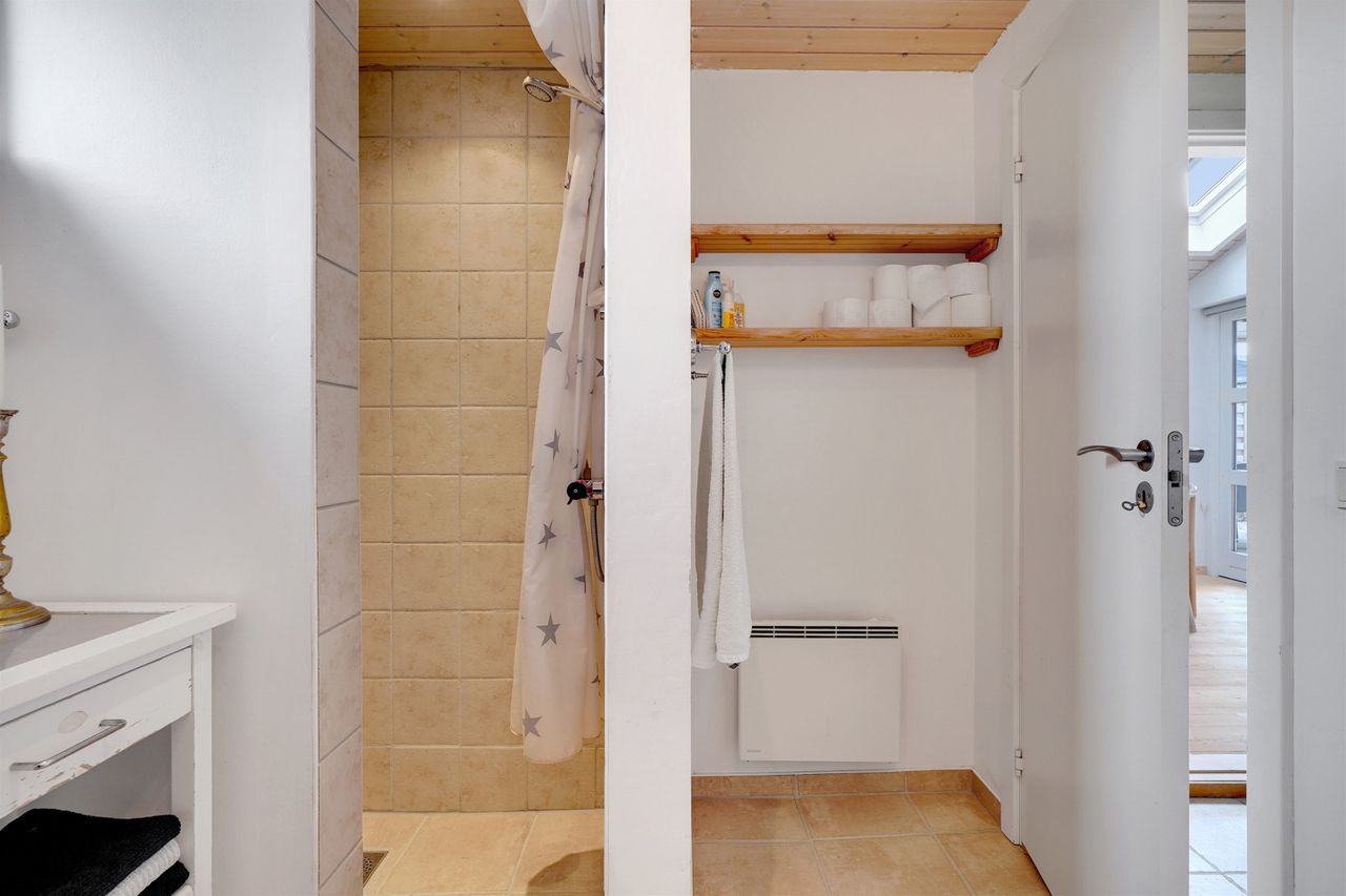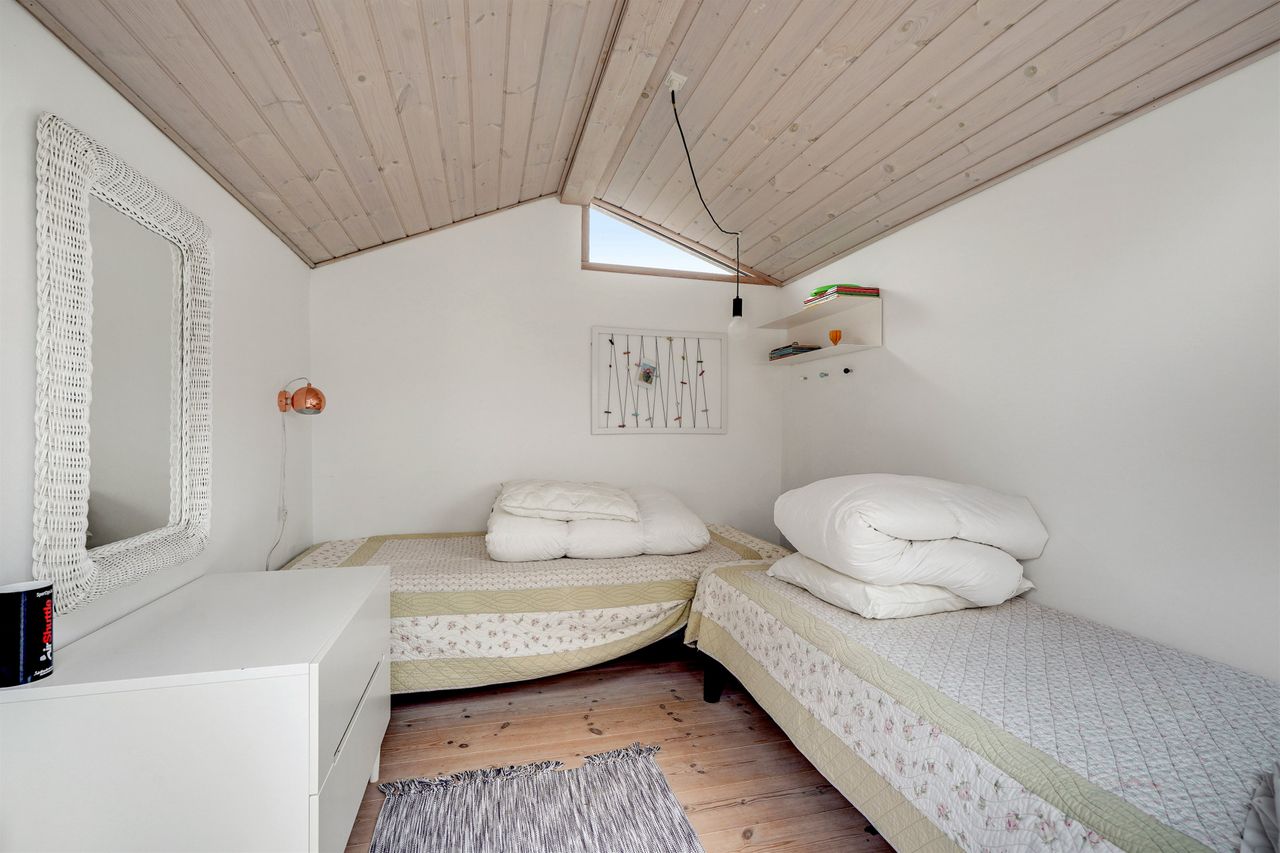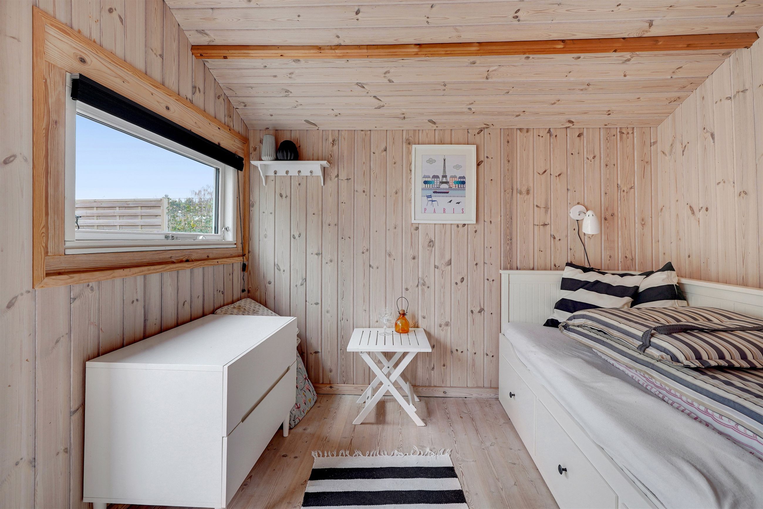 Allerede i entréen mærker I den gennemførte stil – her er der tænkt på det hele, fra praktisk vaskemaskine til en smagfuld indretning, der sætter tonen for resten af huset. Badeværelset fremstår pænt og stilrent og huset rummer desuden et dejligt værelse med loft til kip, som skaber både rummelighed og atmosfære. Planløsningen er gennemtænkt, for ud over værelset i hovedhuset får I en separat afdeling med to udhuse – indrettet i samme hyggelige og indbydende stil – perfekt til gæster eller den store familie.