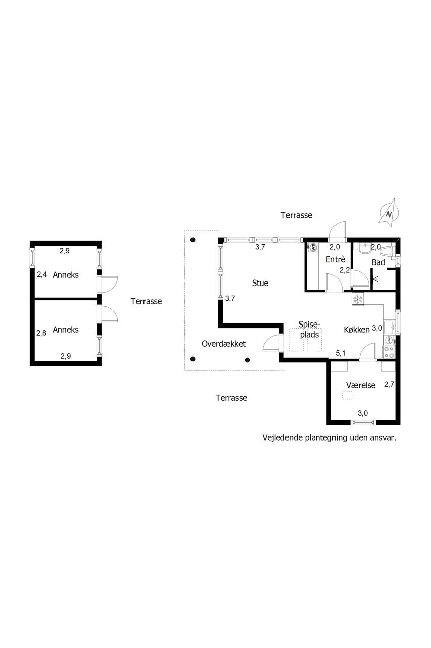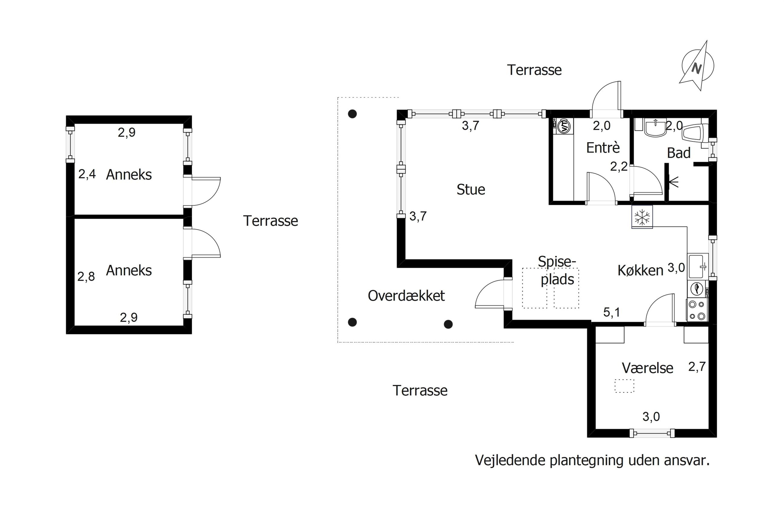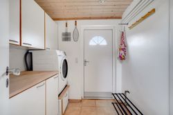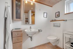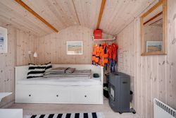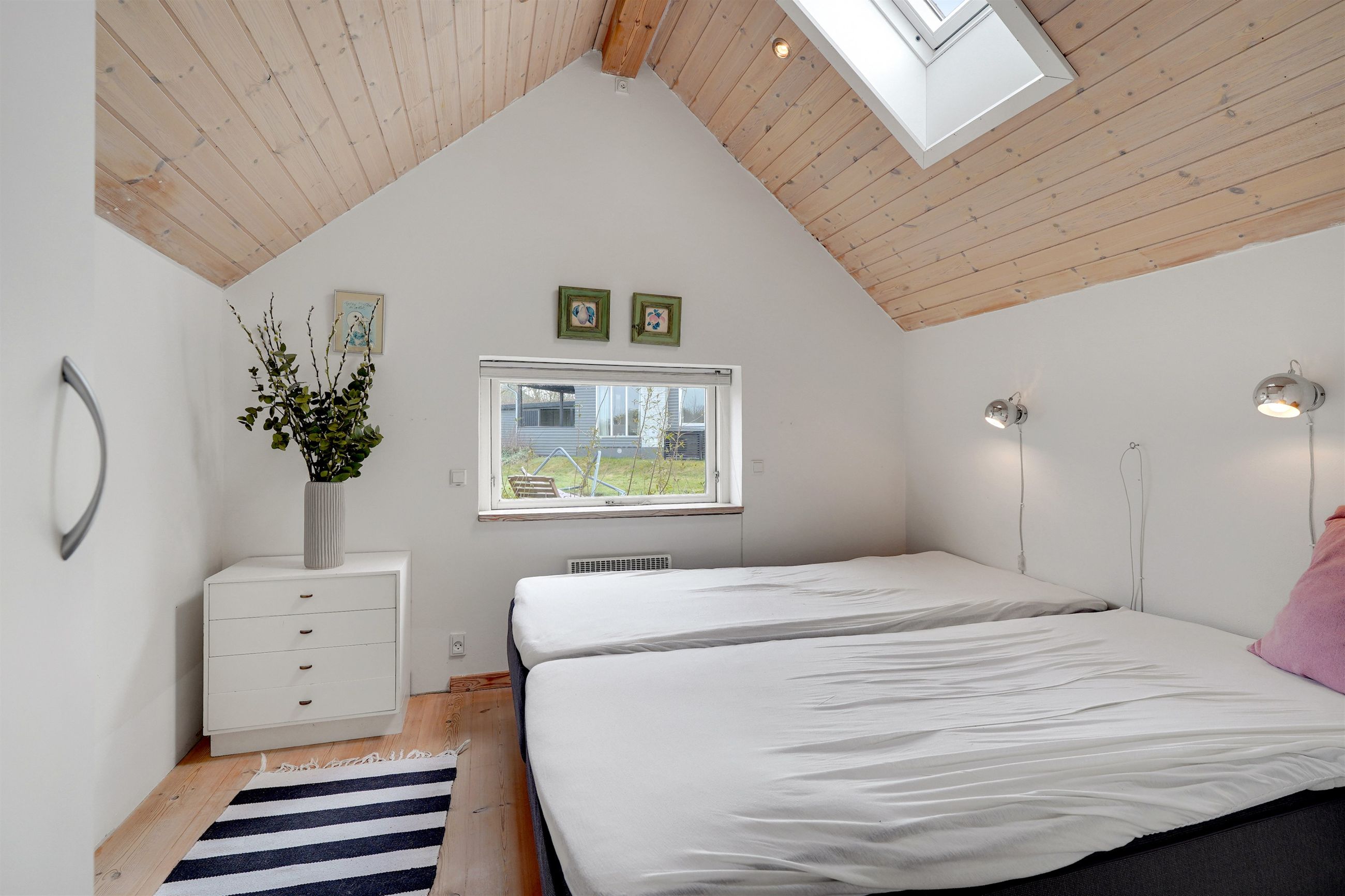 Allerede i entréen mærker I den gennemførte stil – her er der tænkt på det hele, fra praktisk vaskemaskine til en smagfuld indretning, der sætter tonen for resten af huset. Badeværelset fremstår pænt og stilrent og huset rummer desuden et dejligt værelse med loft til kip, som skaber både rummelighed og atmosfære. Planløsningen er gennemtænkt, for ud over værelset i hovedhuset får I en separat afdeling med to udhuse – indrettet i samme hyggelige og indbydende stil – perfekt til gæster eller den store familie.