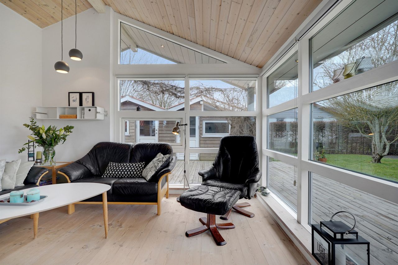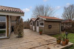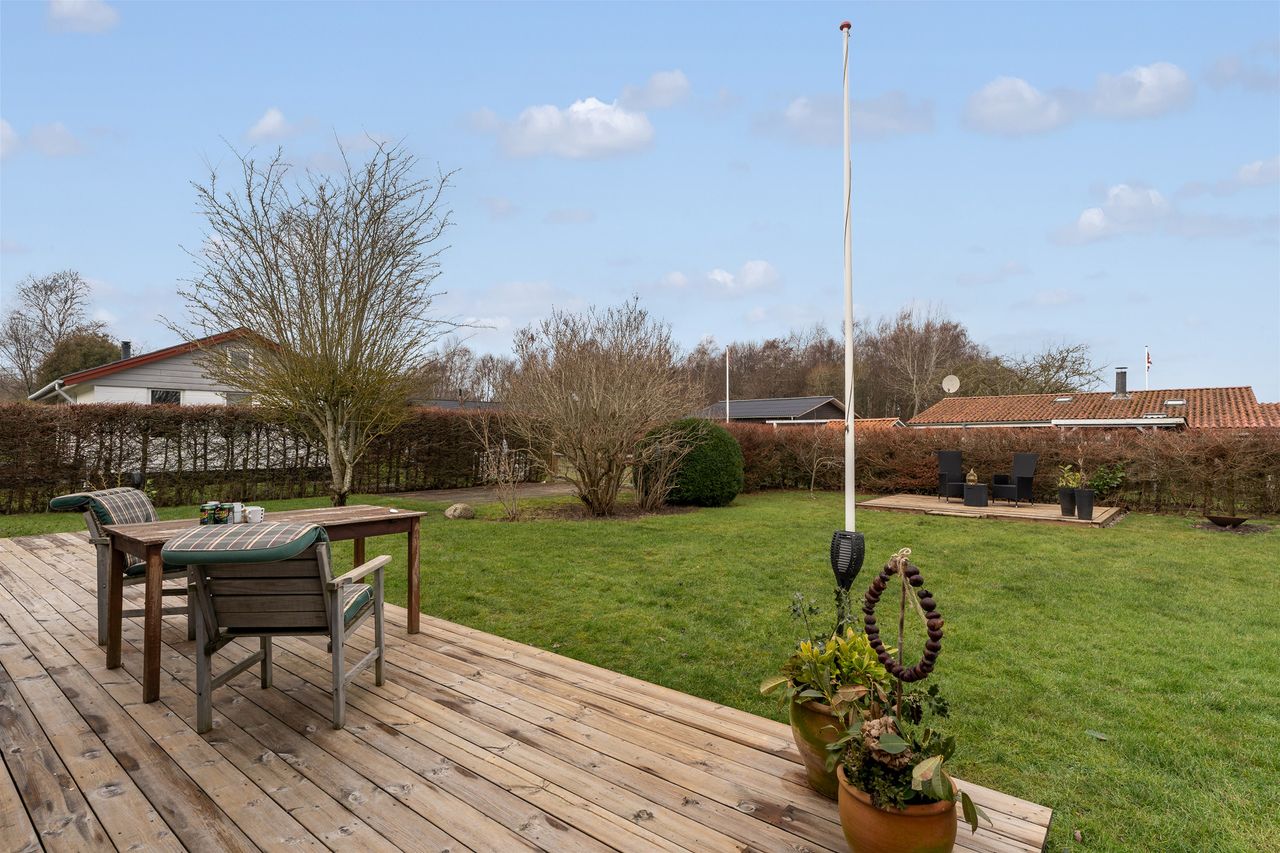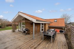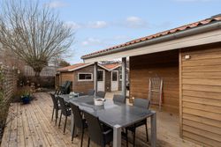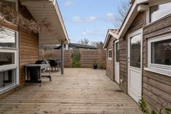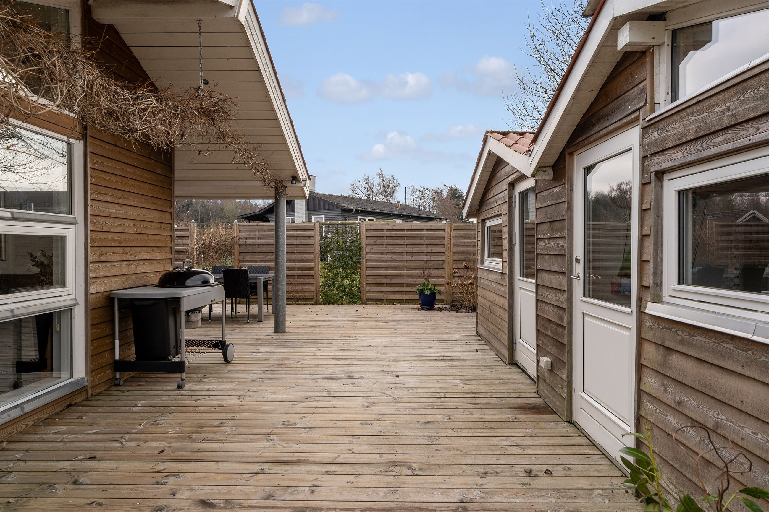 Udenfor fortsætter herlighederne. En skøn træterrasse breder sig omkring huset og bliver jeres naturlige samlingspunkt på solrige dage. Her kan I nyde solen fra morgen til aften – begynde dagen med kaffe i de første stråler og lade aftenen glide stille ind med middag under åben himmel. Her får I ganske enkelt de perfekte rammer om det gode sommerliv.