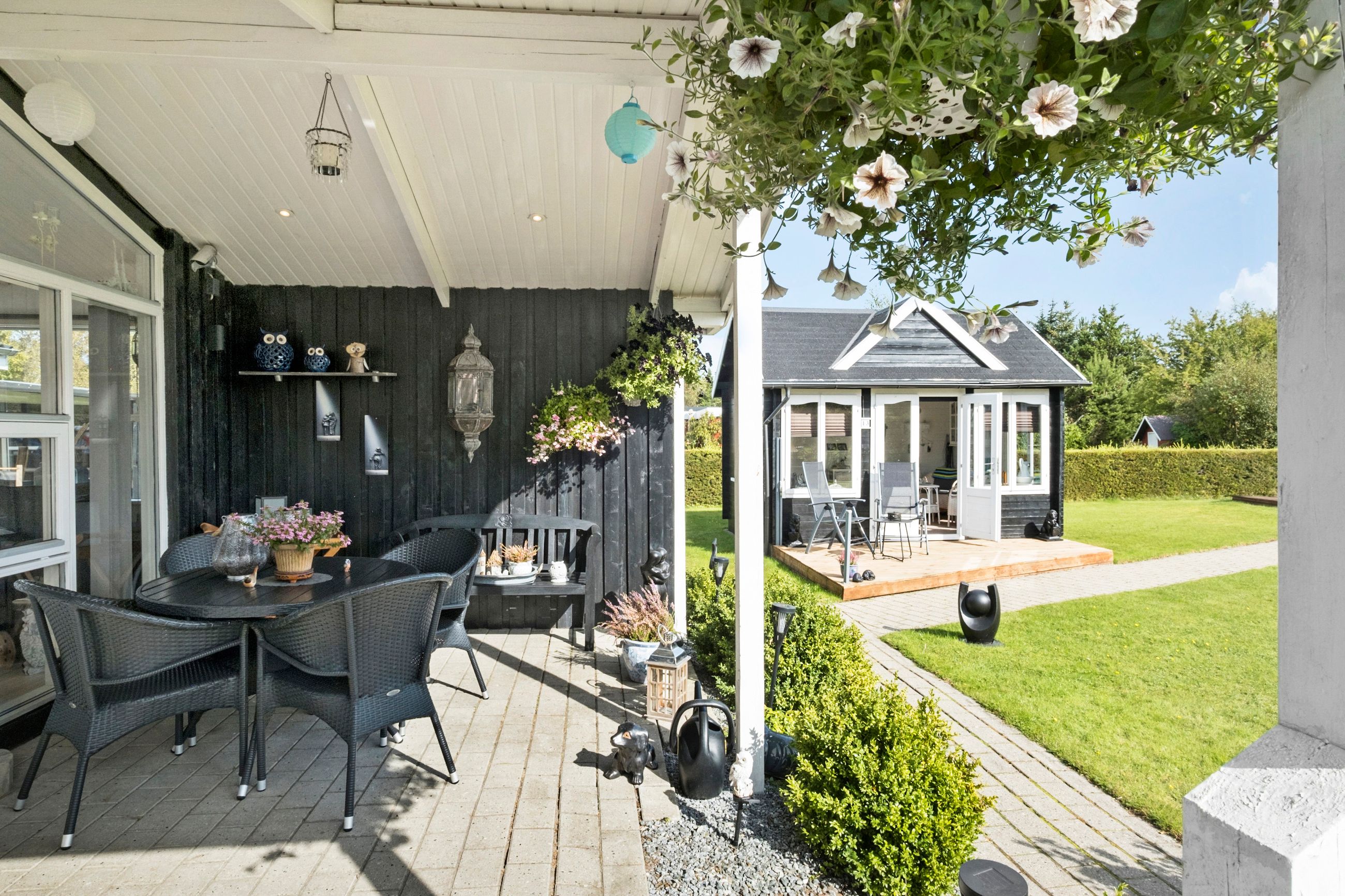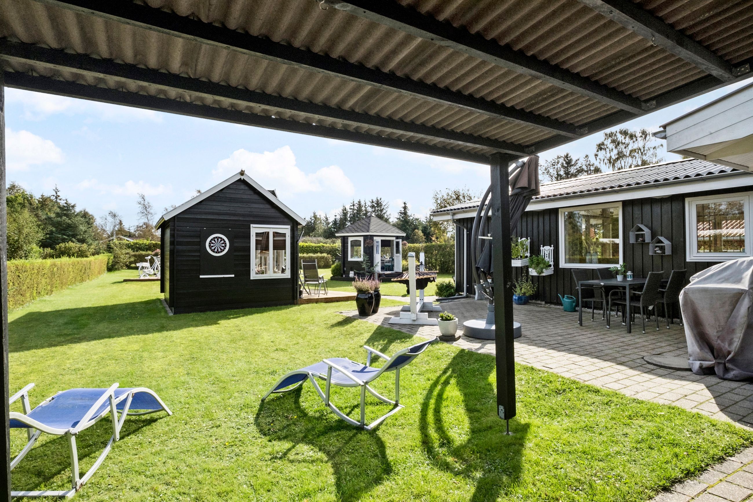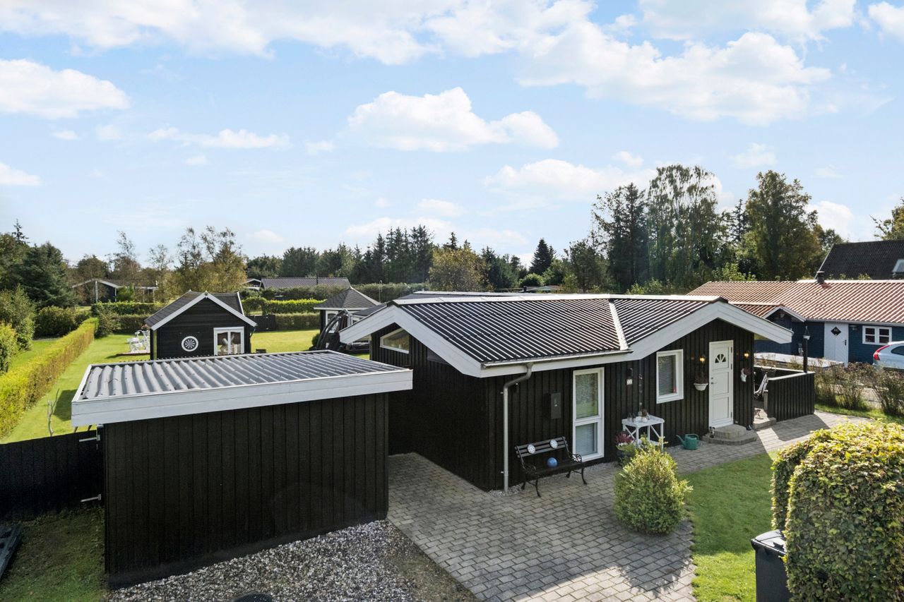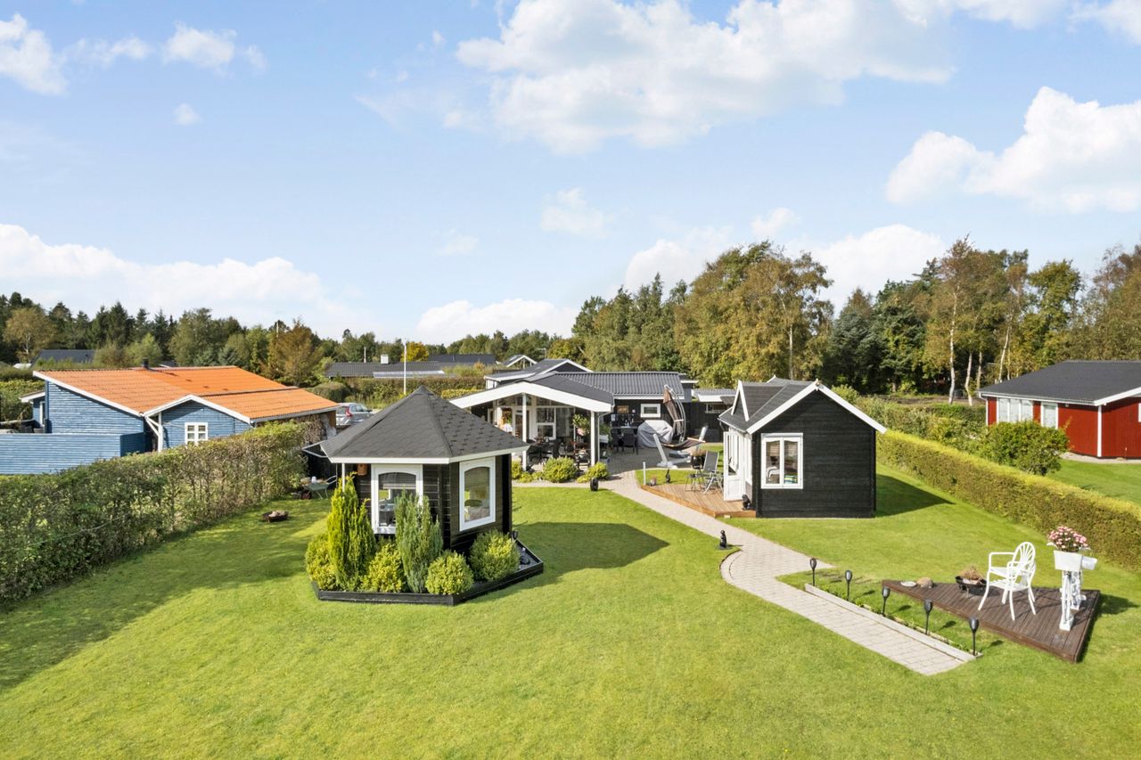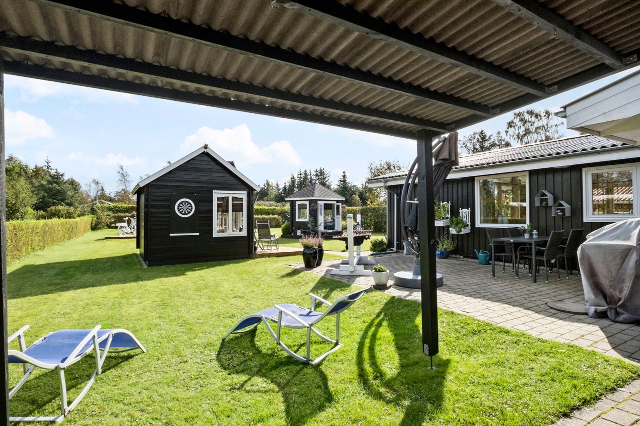 Udenfor venter en dejlig aflukket have. Haven er et sandt fristed med flere skønne terrasseområder, hvor du kan nyde solen hele dagen. Den overdækkede fliseterrasse giver muligheden for at sidde udenfor, selv når vejret viser sig fra sin mindre venlige side. Sommerhuset byder også på træterrasse mod syd. En hyggelig havepavillon indbyder til stille stunder og kreative aktiviteter,