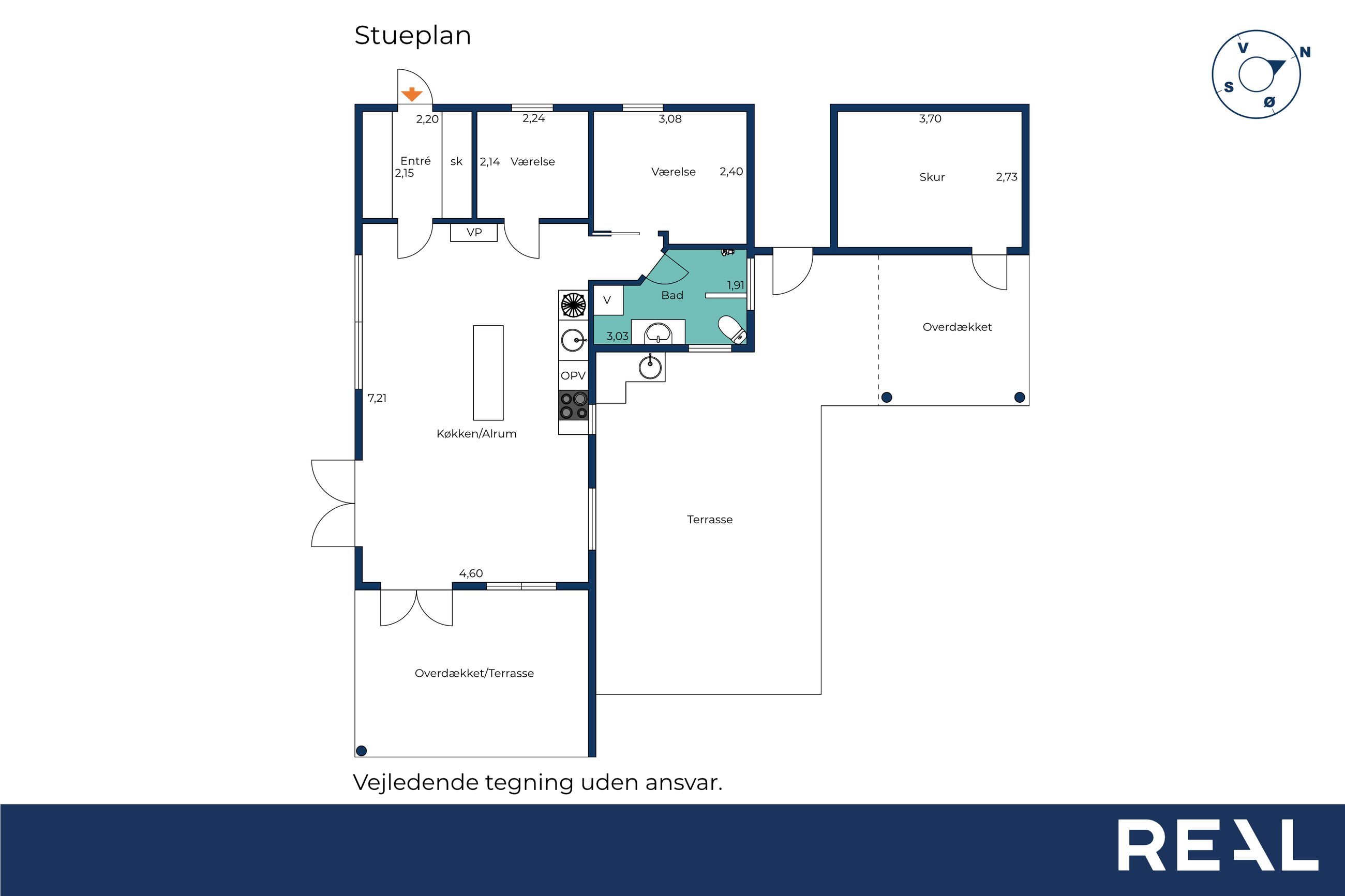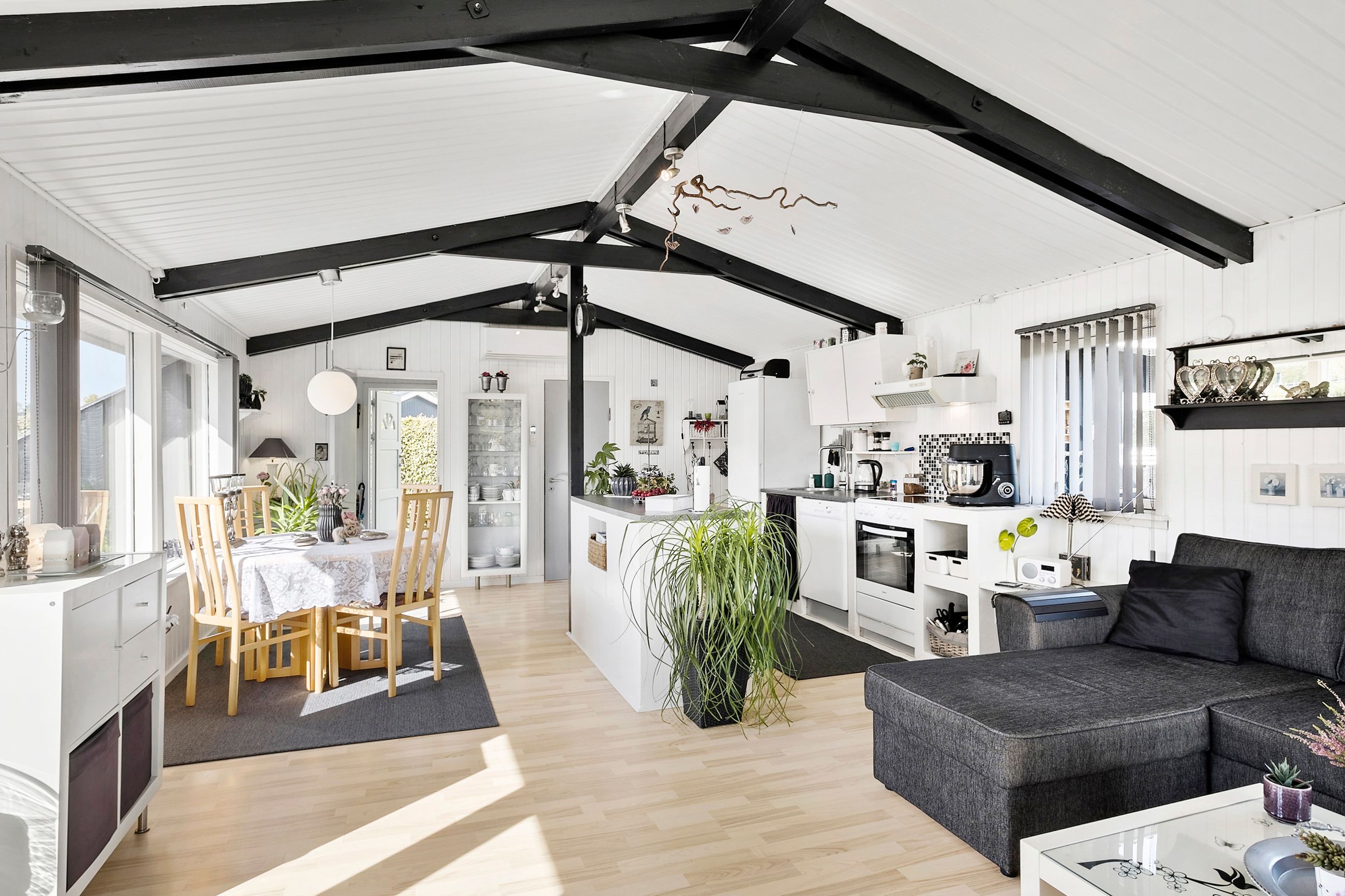 Når du træder ind i huset, bliver du straks mødt af det varme og indbydende køkken-alrum, der kombinerer stue og spiseområde på en harmonisk måde. De synlige bjælker i lofterne tilføjer karakter og charme til rummets atmosfære. Køkkenet er optimalt indrettet med moderne faciliteter og gode arbejdsflader. Den åbne forbindelse mellem køkkenet og stuen skaber en lys og rummelig fornemmelse. Stuen har direkte adgang til en dejlig terrasse, hvor du kan nyde morgenkaffen eller slappe af med en god bog.