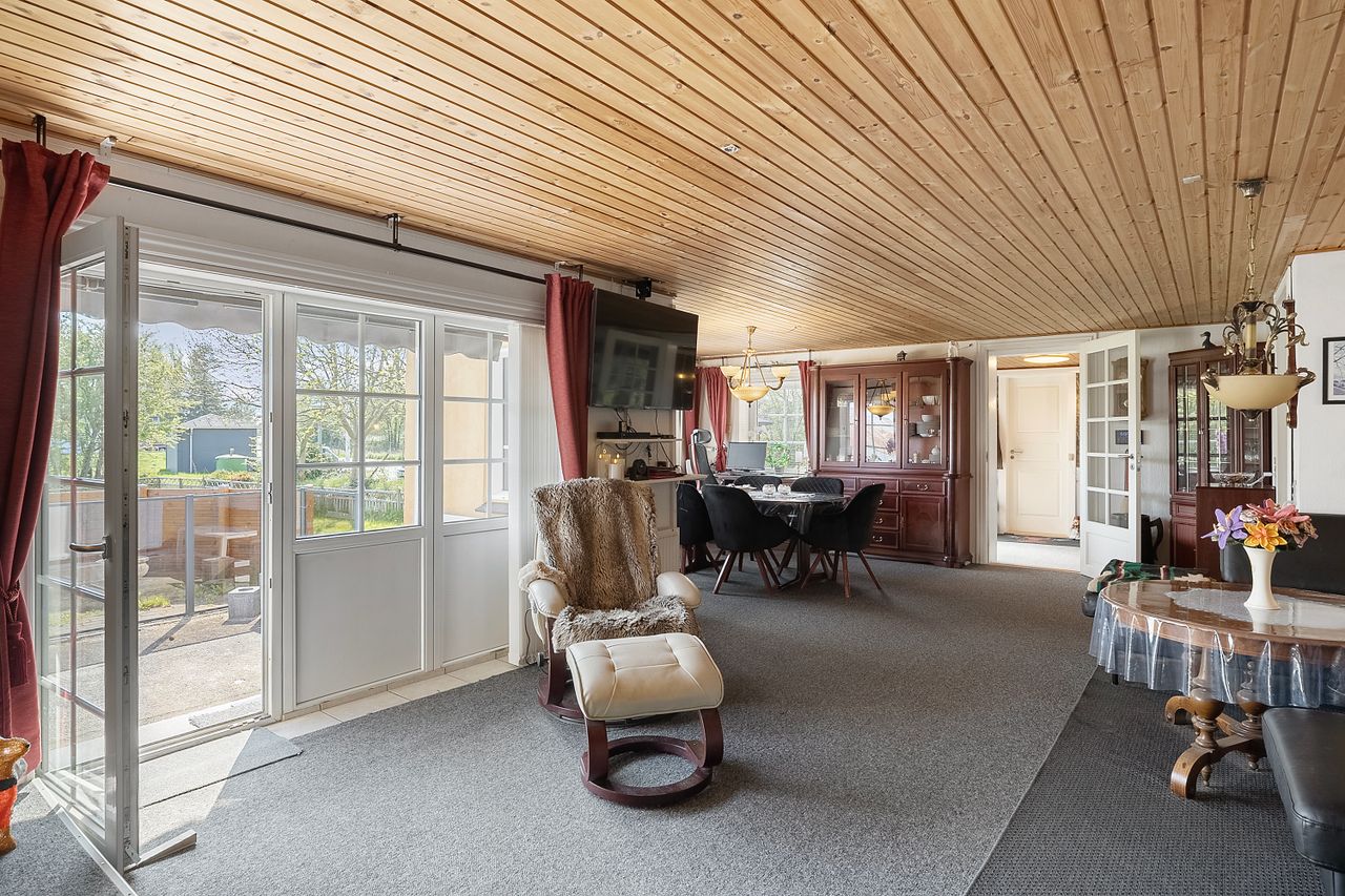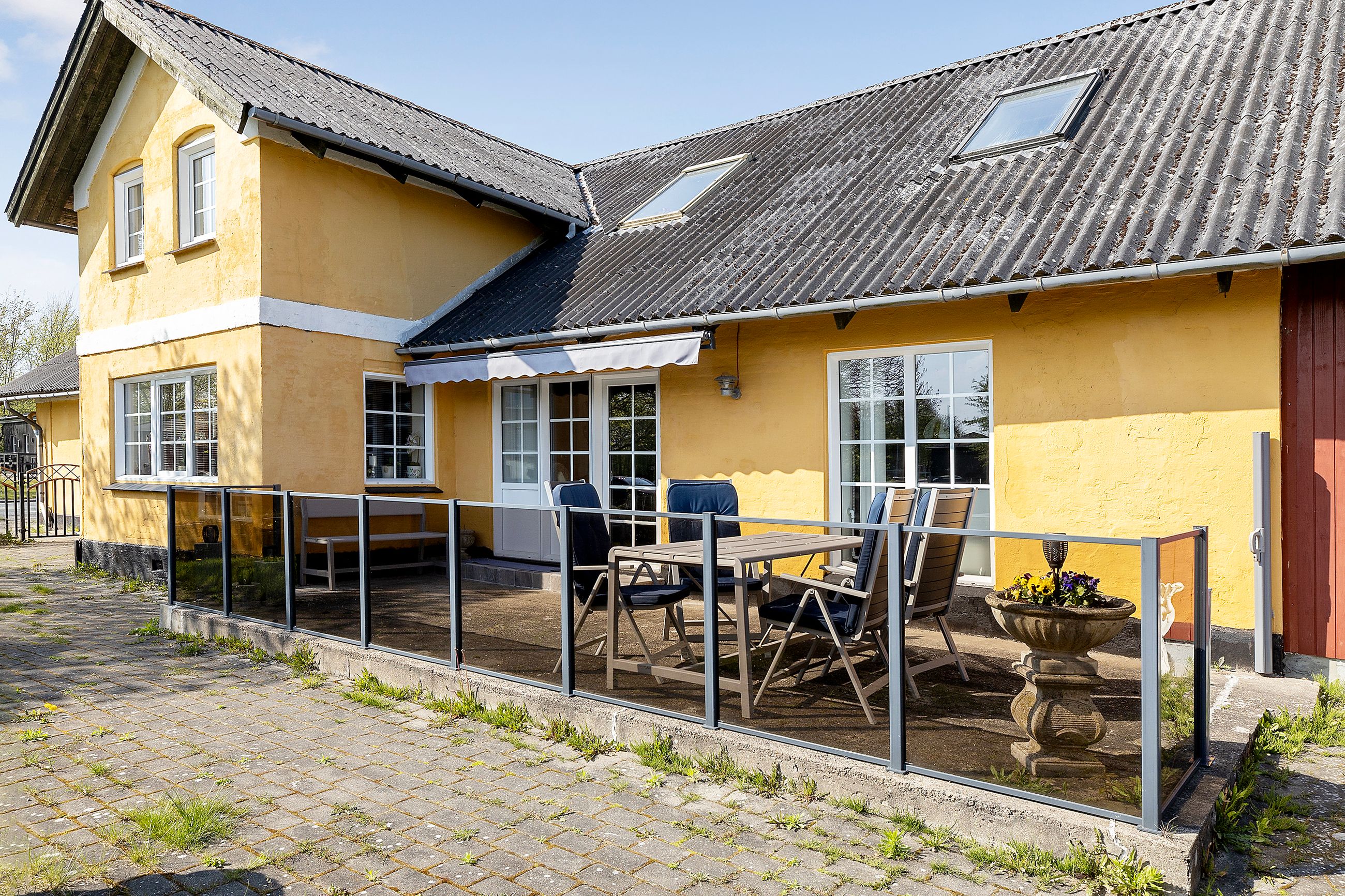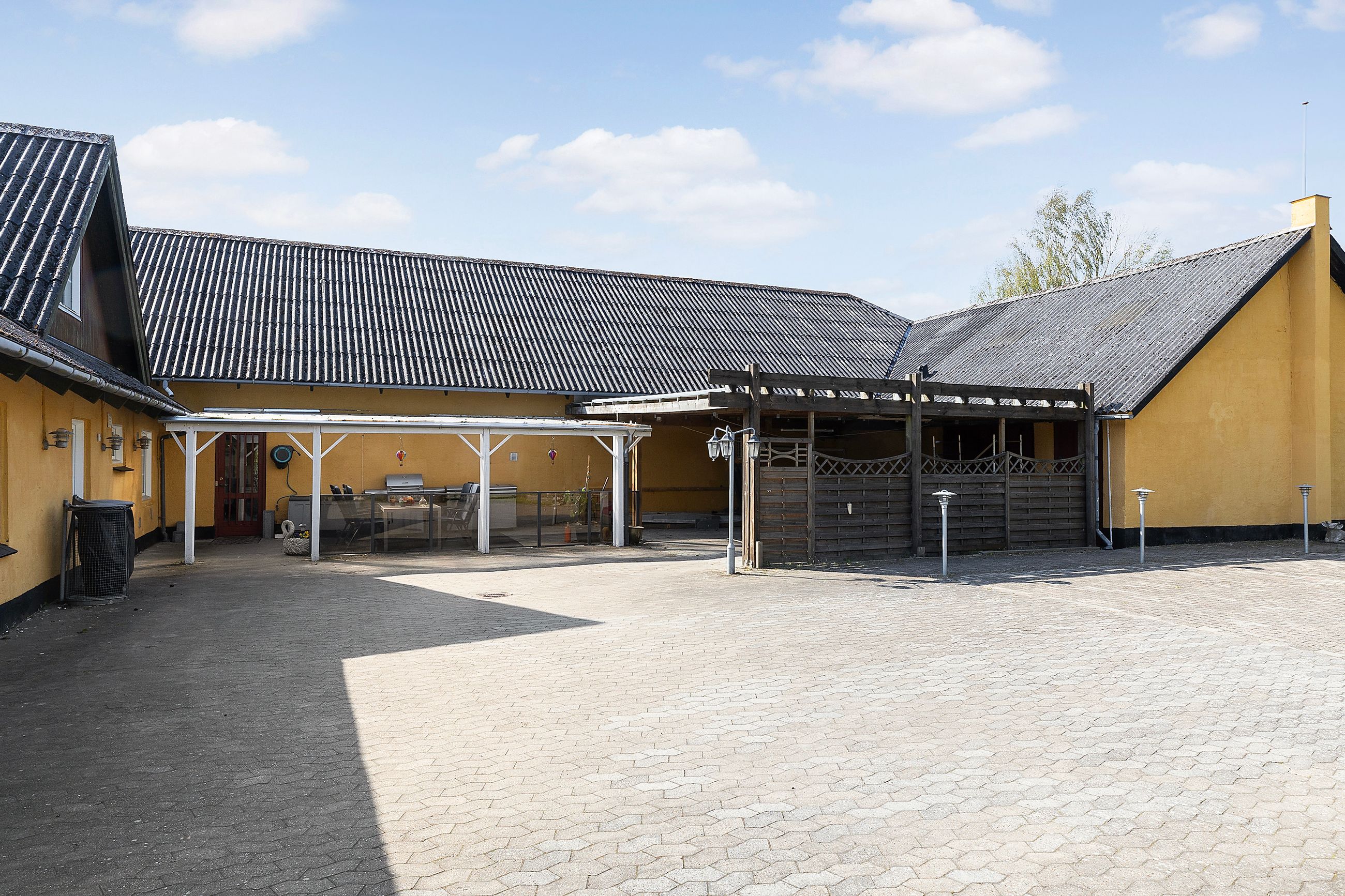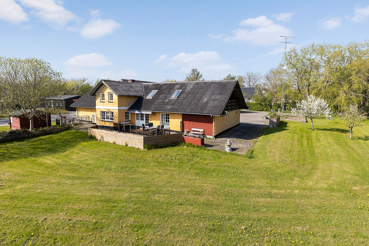 Ejendommen består i dag af et bebygget areal på 546 m2 hvoraf der er 182 m2 beboelse fordelt på 2 plan. De resterende mange m2 fordeler sig på den nedlagte købmandsbutik, lagerlokaler, grovkøkken og mange opbevaringsrum. Der er desuden en 34 m2 stor carport og en 45 m2 overdækket terrasse. Det hele er beliggende på en 2.030 m2 stor grund hvor der også er en skøn østvendt have og en dejlig sydvendt terrasse.