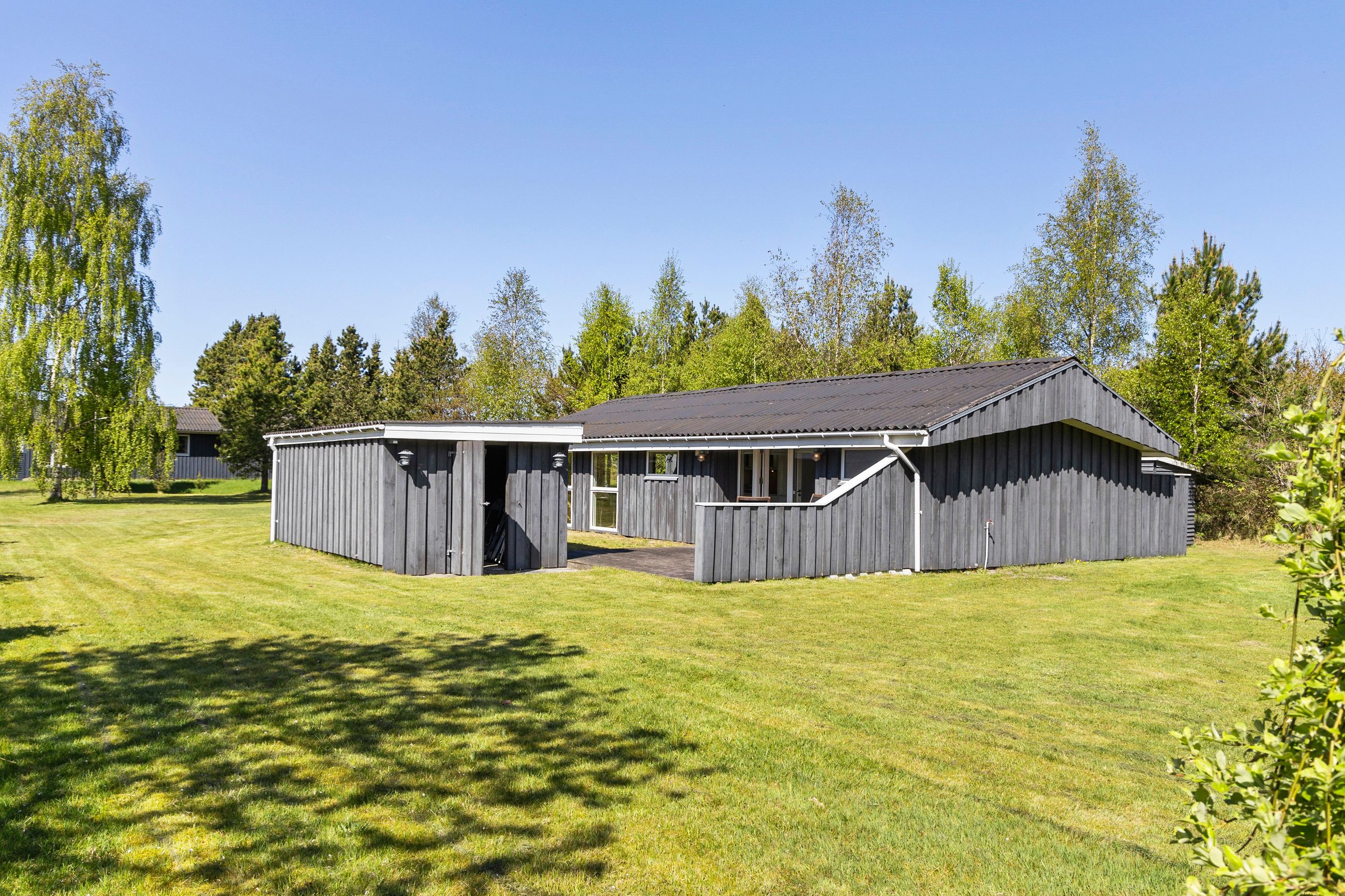 Udenfor finder du også en sydvendt træterrasse til afslapning i solen. Den oprindelige carport på 18 m2 er forvandlet til et lukket skur med 5 m2 indbygget redskabsrum – en praktisk løsning til opbevaring af havemøbler, plæneklipper og diverse redskaber, så du altid har orden på tingene.