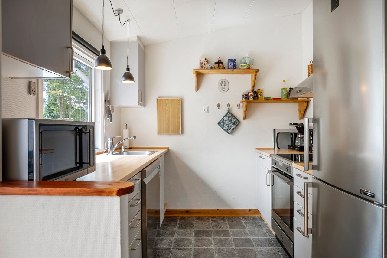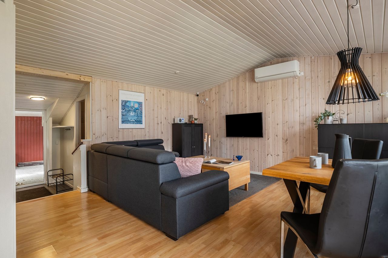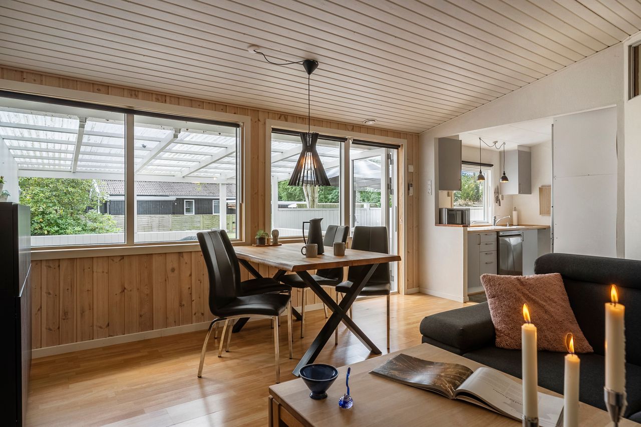Indvendigt byder sommerhuset på 51 m2, der er renoveret siden 2021. Her er nyt og moderne, uden at gå på kompromis med den hyggelige sommerhusstemning. De nye vinduer og døre sikrer godt lysindfald og energivenlig opvarmning, mens den installerede varmepumpe giver behagelig varme i vintermånederne. Solfangeren på taget er med til at understøtte husets energibesparelse og miljøvenlige profil. Hårde hvidevarer er udskiftet med moderne, energieffektive modeller, hvilket gør dagligdagen nem og bekvem.