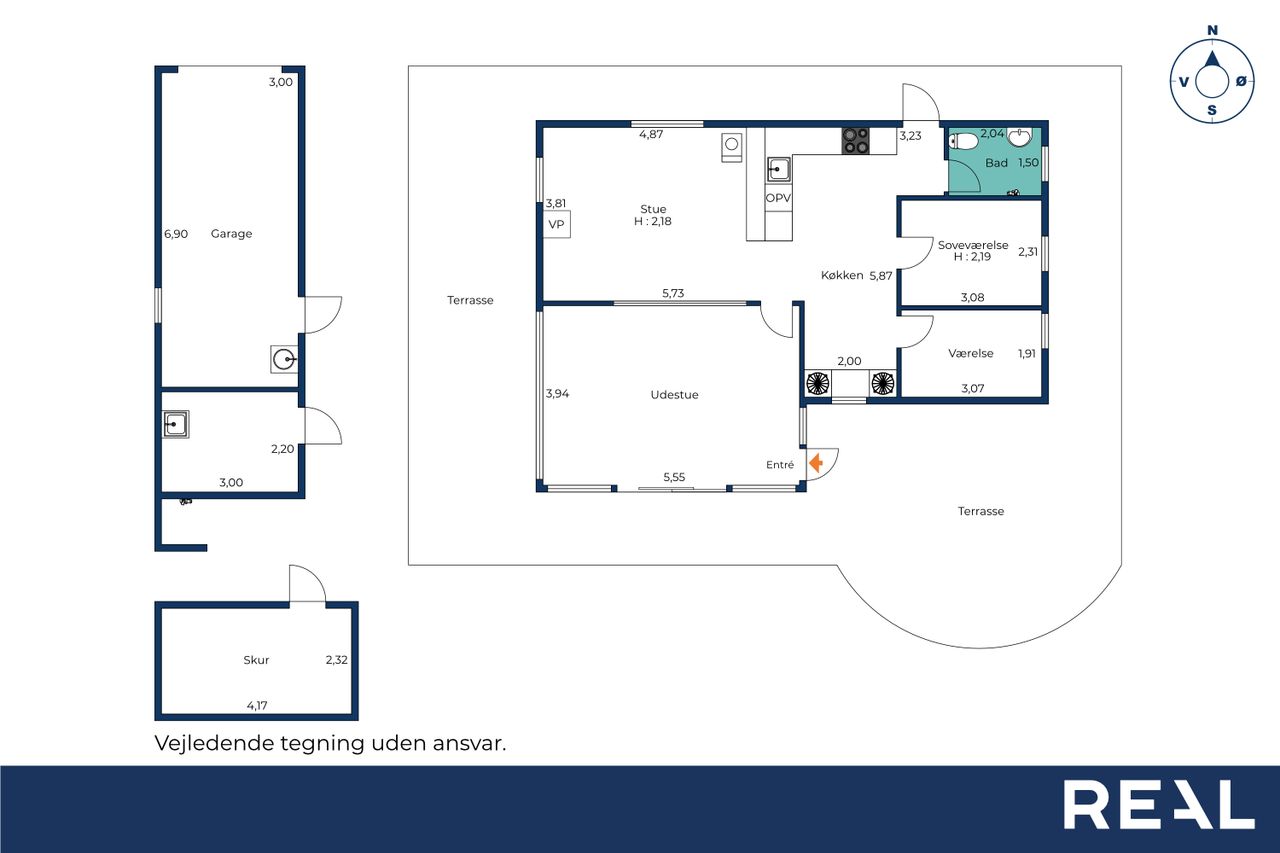 Huset inkluderer også en garage på 25 m2 med tilhørende 8 m2 skur – perfekt til værksted, opbevaring eller bilparkering. Garagen kan evt. også laves om til et anneks. Udenfor er der yderligere et udhus på 13 m2, hvilket giver endnu mere plads til hobbyprojekter eller opbevaring.