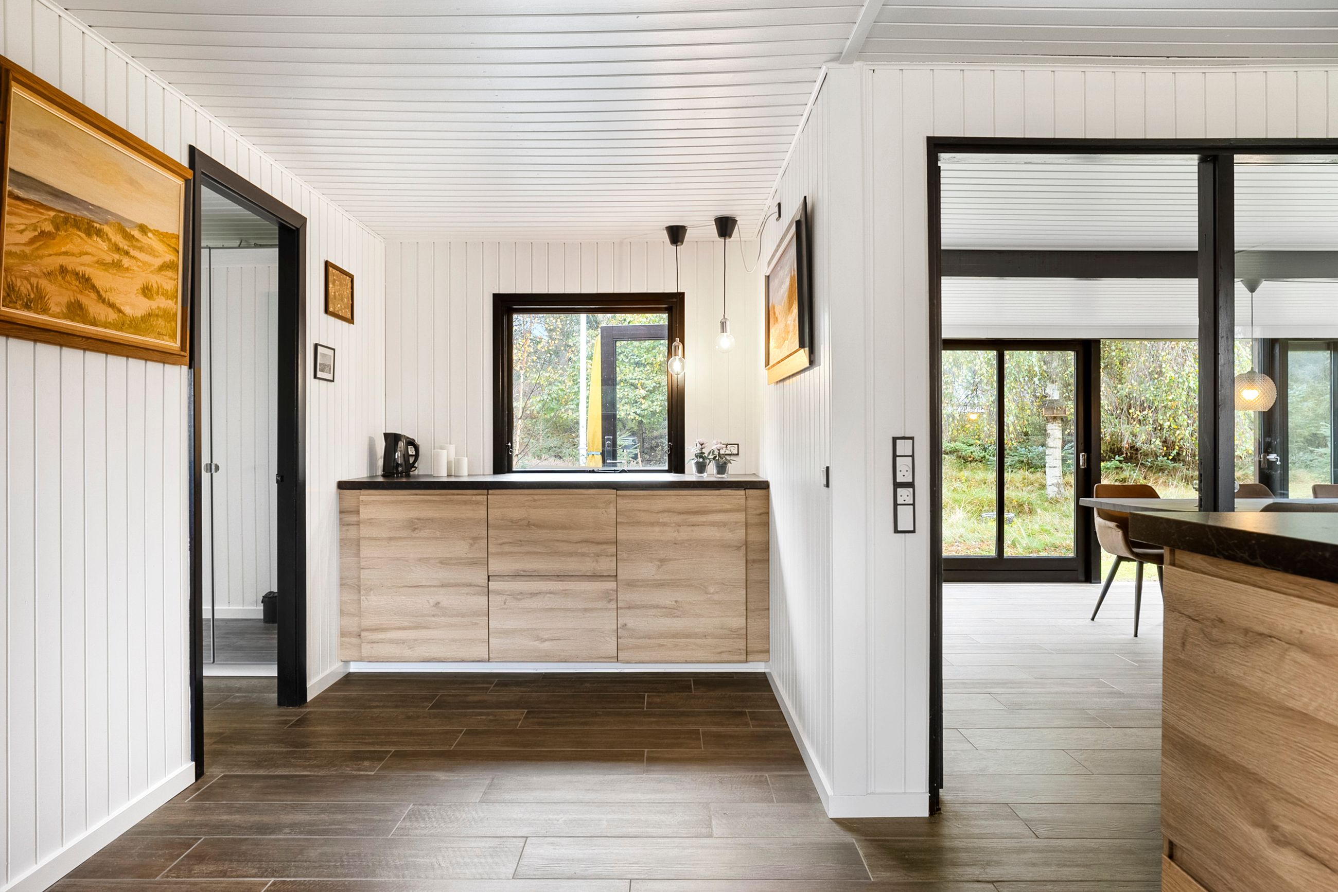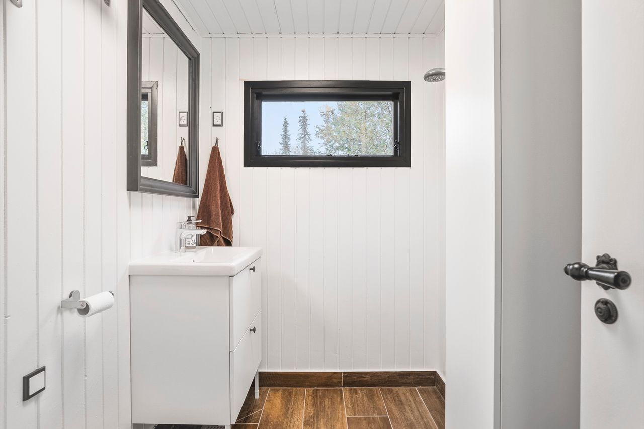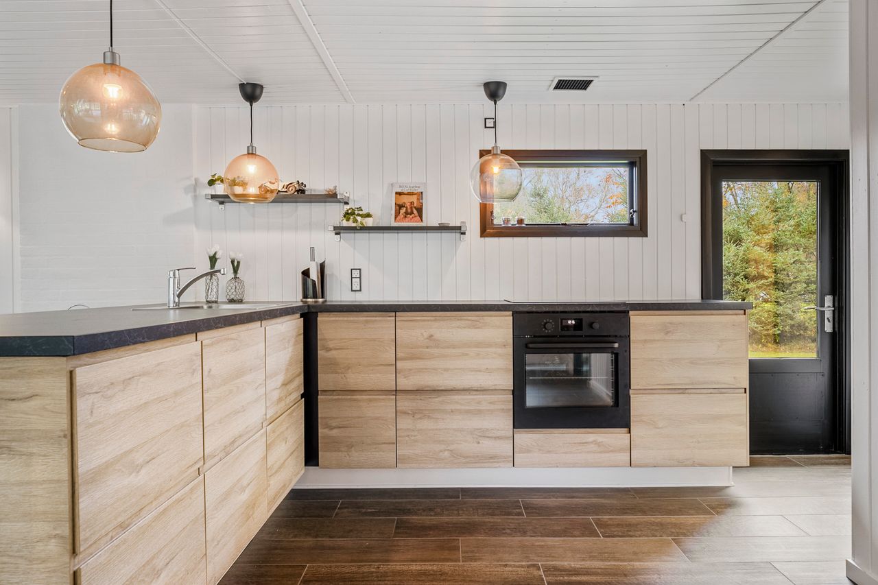 Indenfor bydes der på to gode værelser – ideelle til enten gæster, børn eller som soveværelse – samt et stort åbent køkken-alrum og stue, der skaber en hyggelig ramme om samvær. Det moderne IKEA-køkken fra 2022 er udstyret med ovn, kogeplade, emhætte, køleskab, fryser og opvaskemaskine, hvilket gør det let at lave maden til familie og venner. Det åbne rum giver en varm atmosfære og plads til både afslapning og socialt samvær.