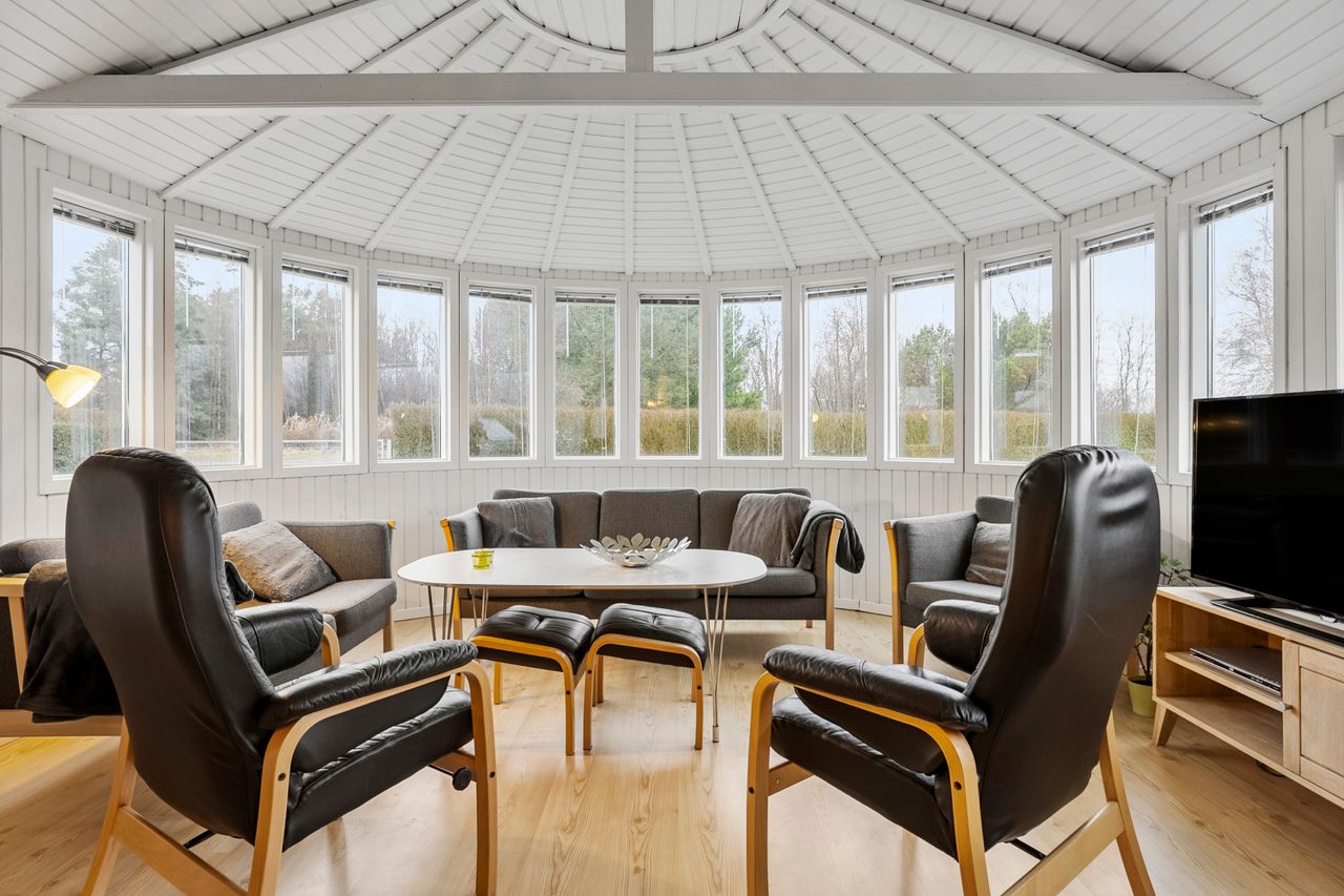 Sommerhusets hjerte er den imponerende stue, der blev udvidet i 2000 med en tilbygning på 30 m2. Den runde bue med store vinduespartier sørger for et fantastisk lysindfald og giver stuen et lyst og åbent udtryk.