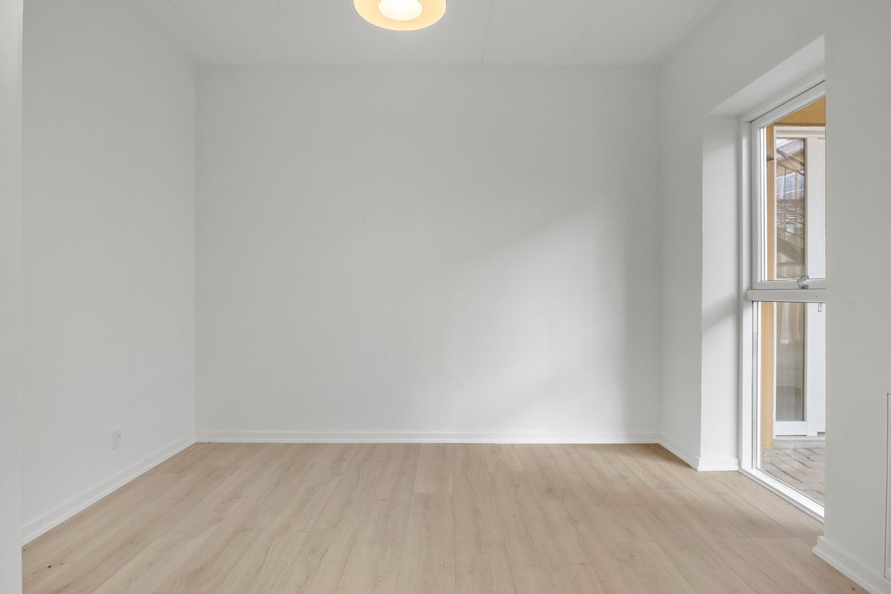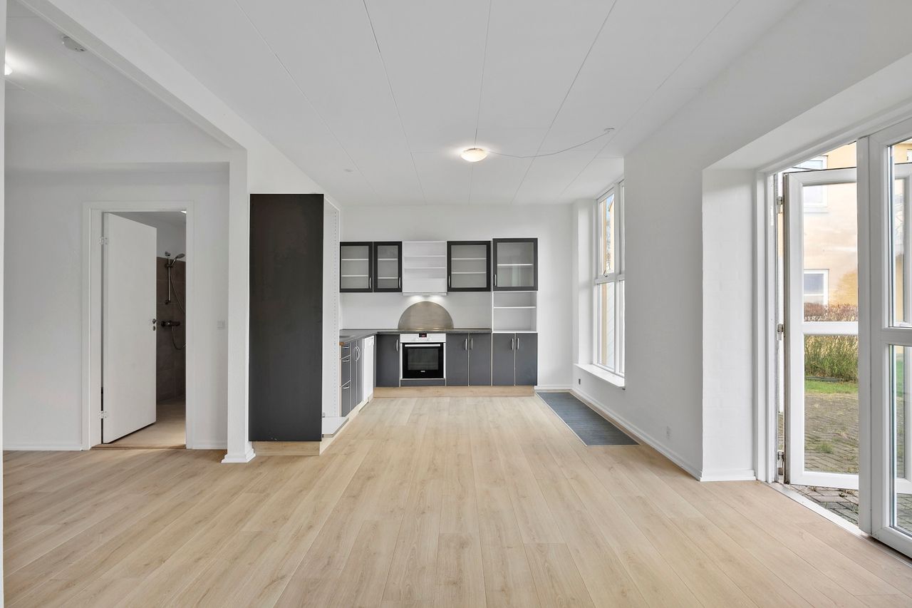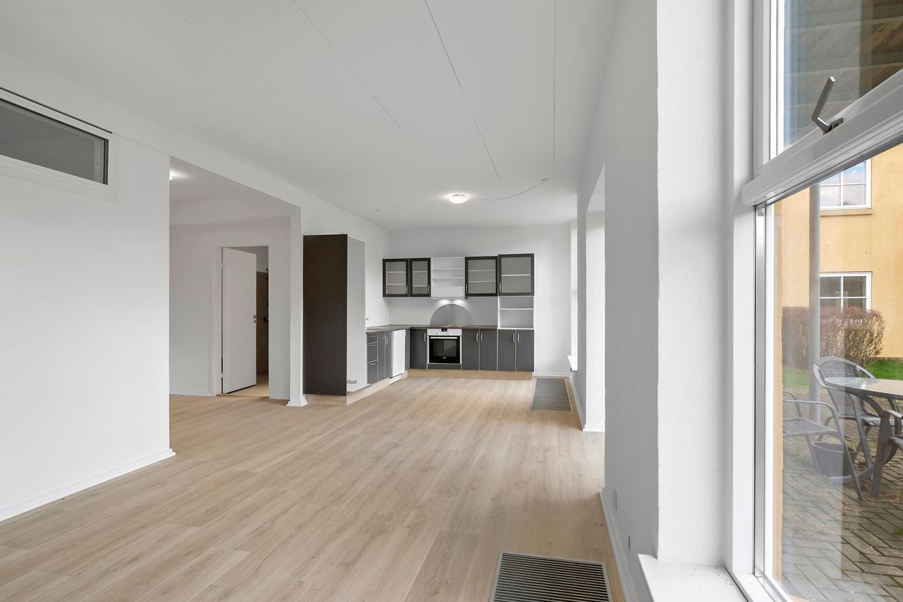Lejligheden byder på et lyst og indbydende køkken-alrum med god plads til både madlavning og samvær. Herfra er der dobbeltdøre med direkte udgang til terrassen, som indbyder til udeliv og afslapning i rolige omgivelser. Planløsningen rummer desuden tre gode værelser med fine indretningsmuligheder samt et pænt badeværelse med vaskemaskine.