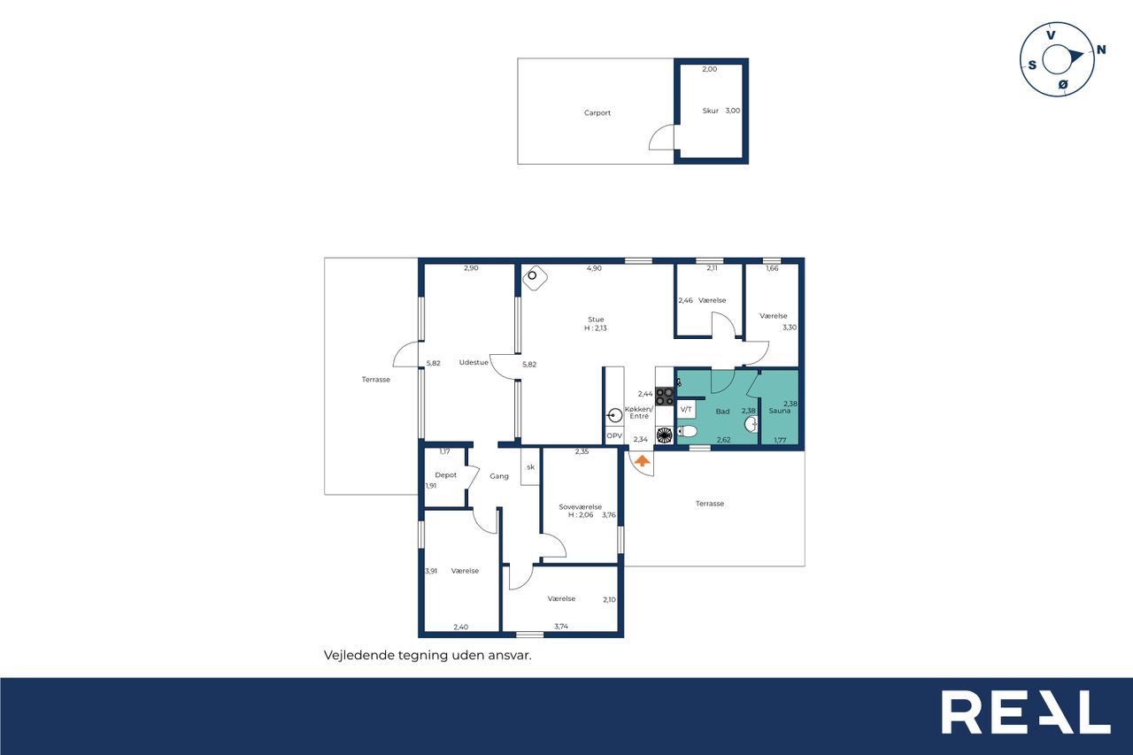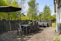 Huset er beliggende på en stor grund på 1.053 m2, som byder på både øst- og sydvendte terrasser – perfekte steder at nyde morgenkaffen, solbadning eller hyggelige grillaftener og til børnene er der både gyngestativ og nedgravet trampolin. Der er også en praktisk 24 m2 stor carport, så bilen er godt beskyttet, samt et brændeskur, som er ideelt til opbevaring af brænde og andet udendørsudstyr.