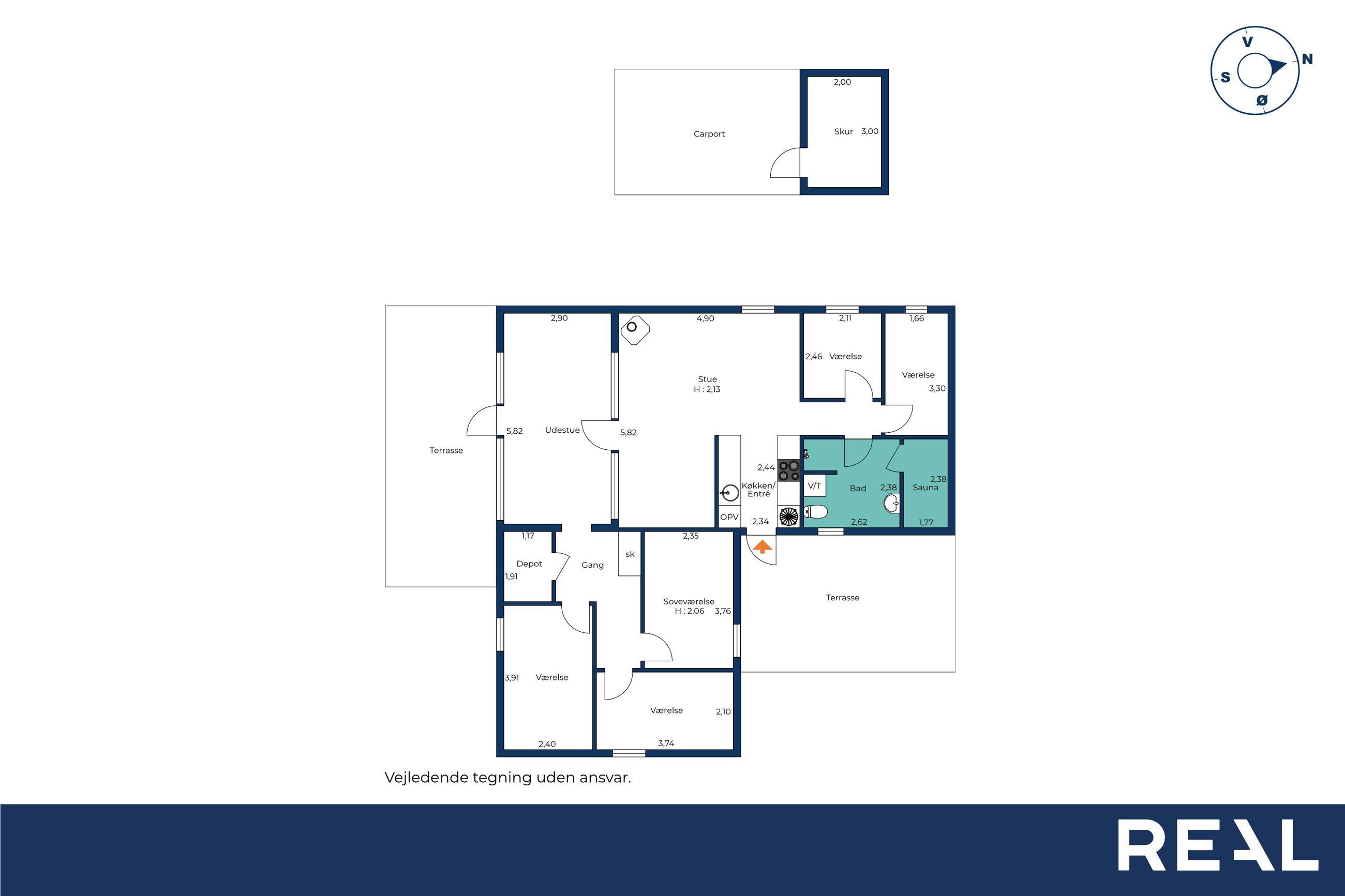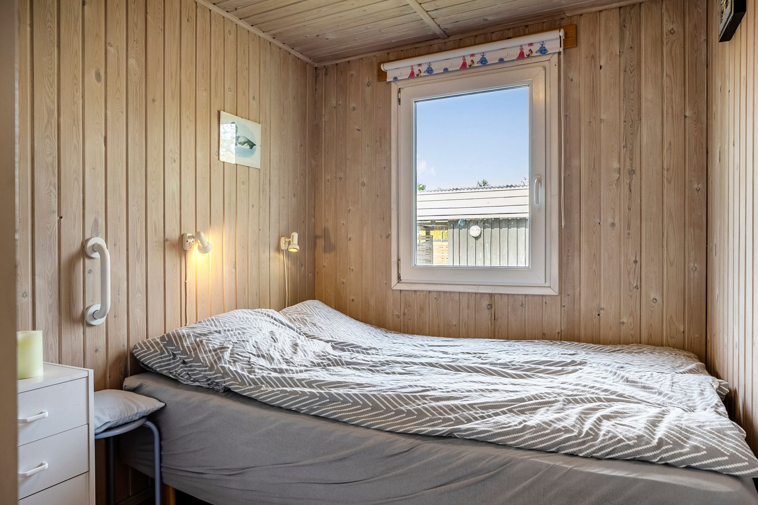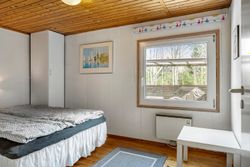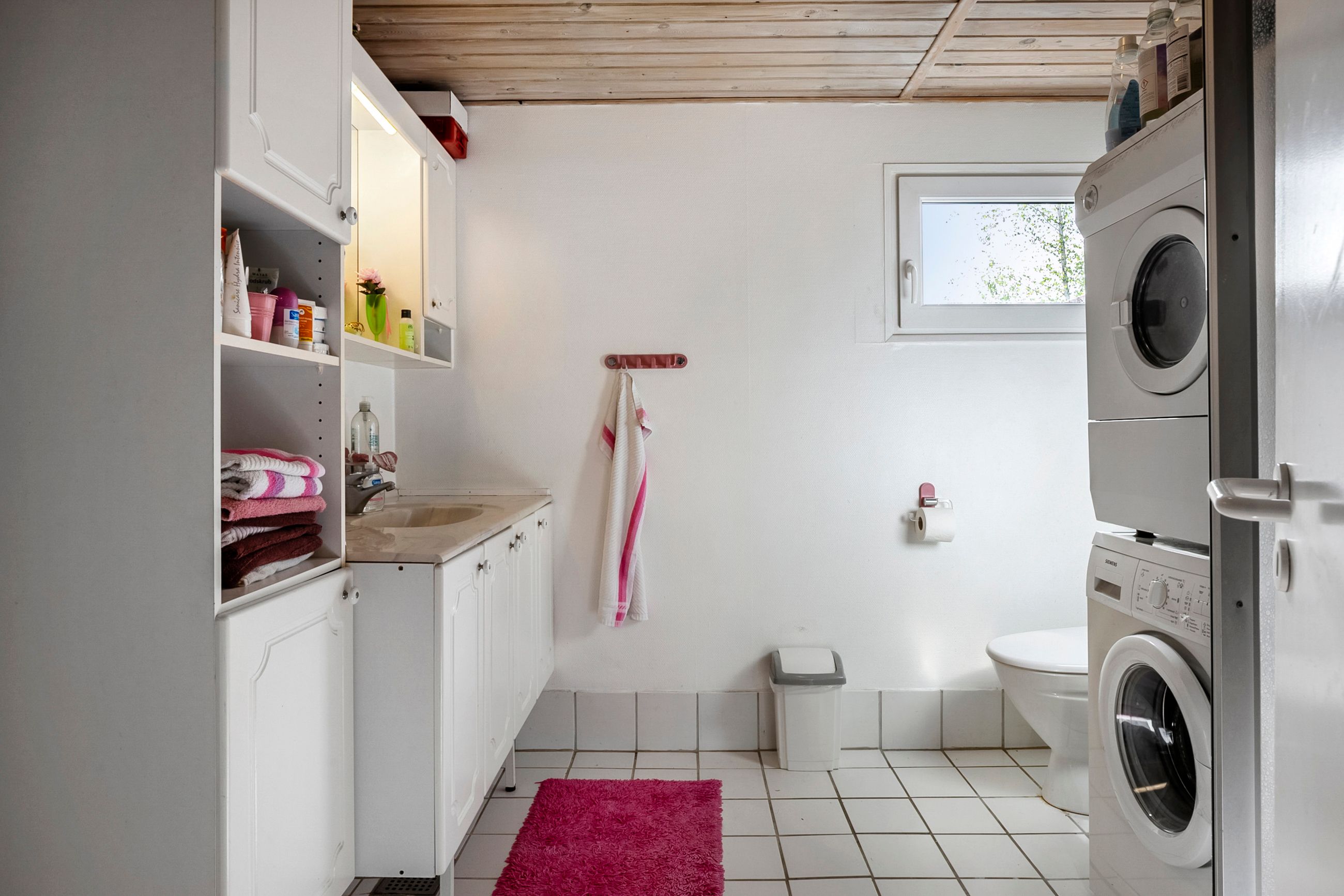 En mindre fordelingsgang fører videre til yderligere to værelser og et rummeligt badeværelse med sauna, hvor der er plads til både vaskemaskine og tørretumbler – bekvemt og funktionelt til dagligdagen. Huset er indrettet med fokus på komfort og funktionalitet, hvilket gør det nemt at bo her året rundt eller blot til feriesammenkomster.