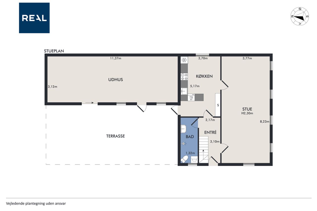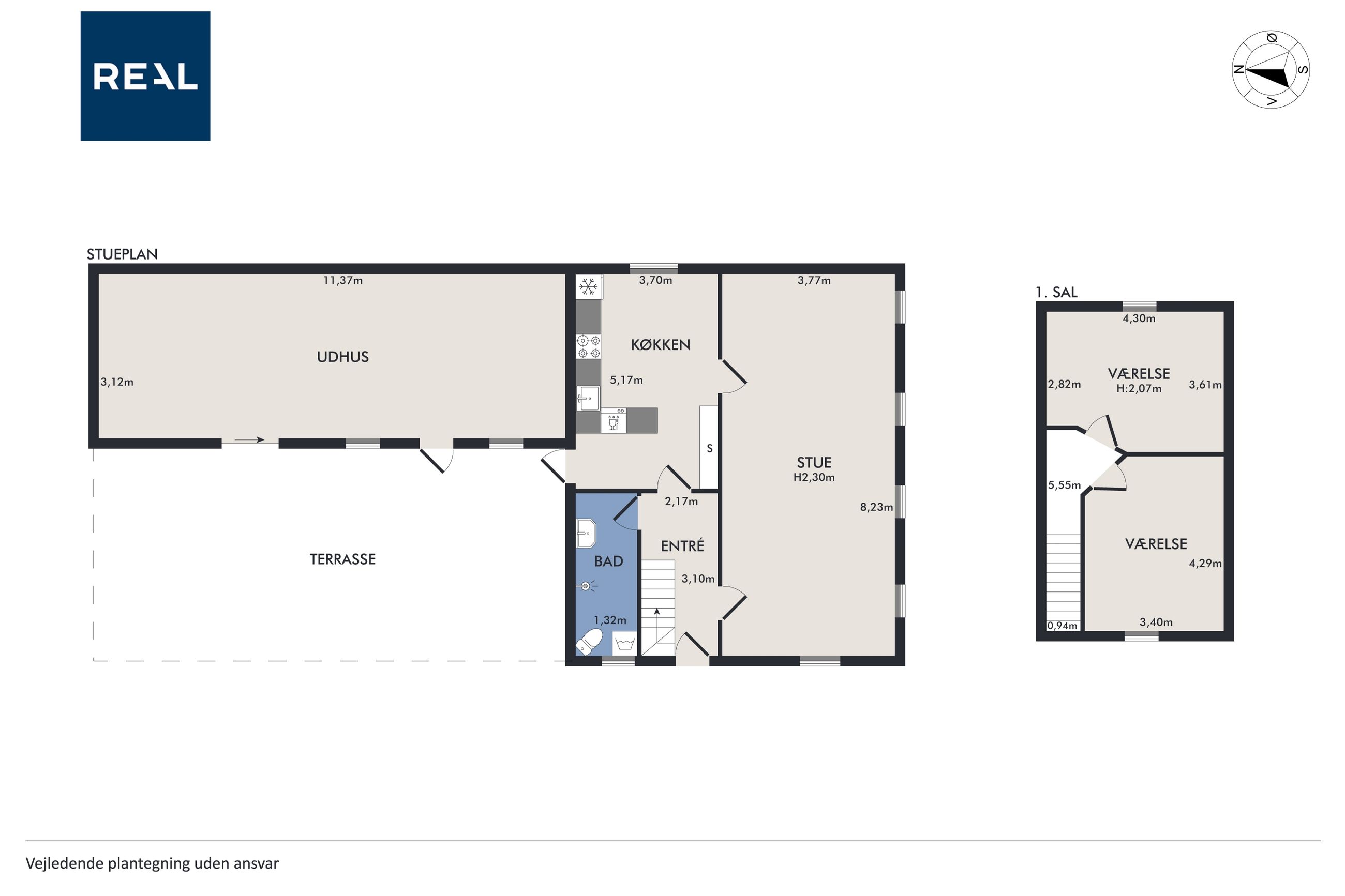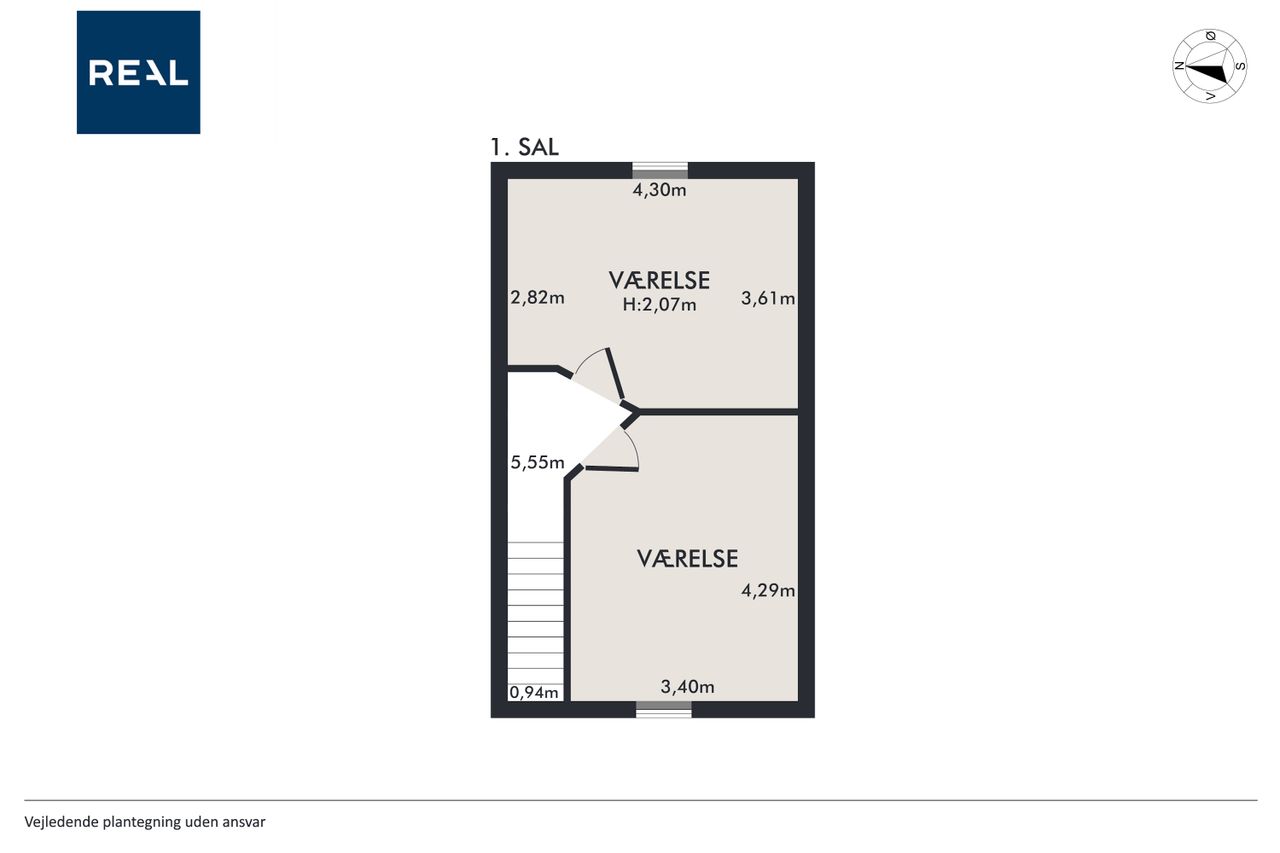 1. sal indeholder: Repos samt 2 værelser. (der er kun godkendt 14 m2 til bolig på 1 sal.)