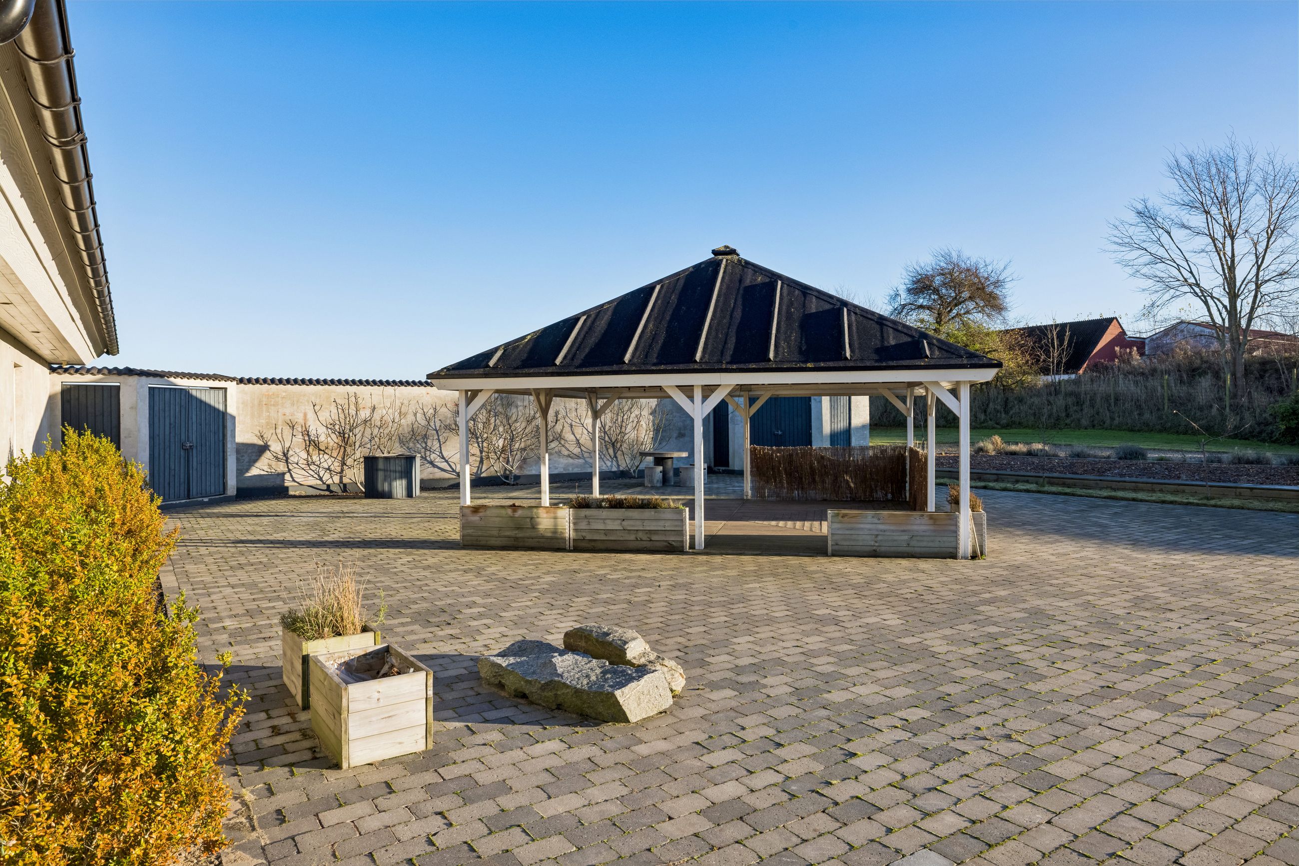 Endvidere er der flot velanlagt stor grund med stor hyggelig overdækning i midten samt hyggelige terrasser og solkroge hvor man kan nyde udelivet.