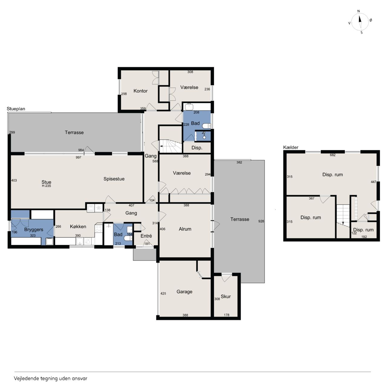 Kælderen er der adgang til både fra stueplan og udefra. Her er der indrettet med indgang, viktualierum, værksted og stort multirum.